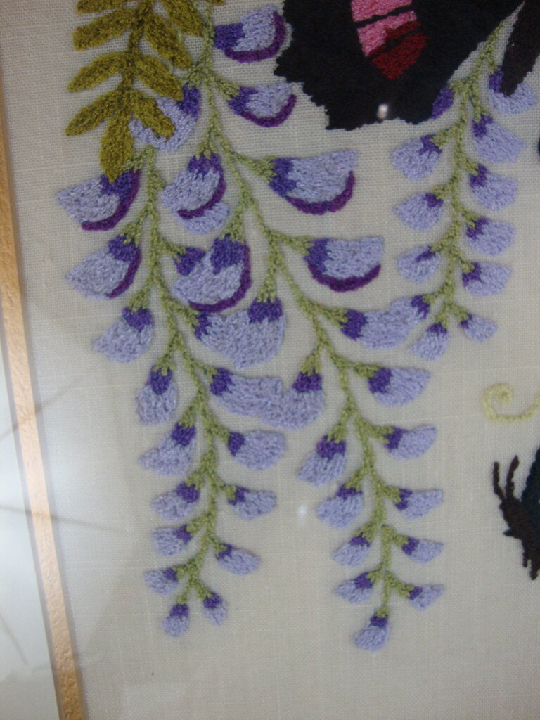 Vintage adorable hand stitched framed art of two large black/white butterflies in flight amongst lovely purple wisteria vines with dark wood bamboo look frame with cream matting with gold accent. Art/frame has wear/tear and frame is 21" height by 17 1/2" width and art is 15" height by 11 1/2" width. If you choose to arrange to have an item shipped please make sure to insure the shipment as we are not responsible for damage that occurs in shipping. All items are sold “As Is” and all sales are final. Most pieces are one of a kind and can not be replaced. We will give you as much information as possible regarding the pieces condition including supplying additional pictures if needed. Due to the nature of antique and vintage items there may be blemishes, nicks or other imperfections as expected with age and use. If you want more information about an item, such as additional images or condition, please inquire! All items are located in our store at Standpipe Antiques, 502 O Neal Street, Belton, SC, 29627. Our hours are Wednesday through Saturday 10am to 5pm and Sundays 12-5pm. Come by and see us!