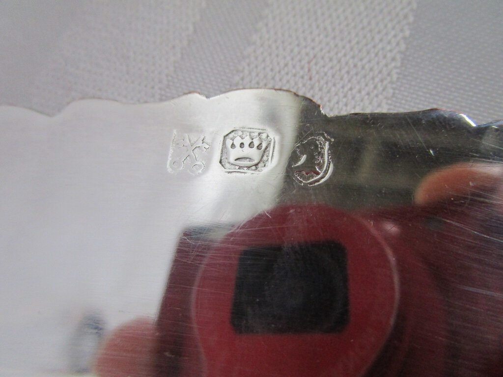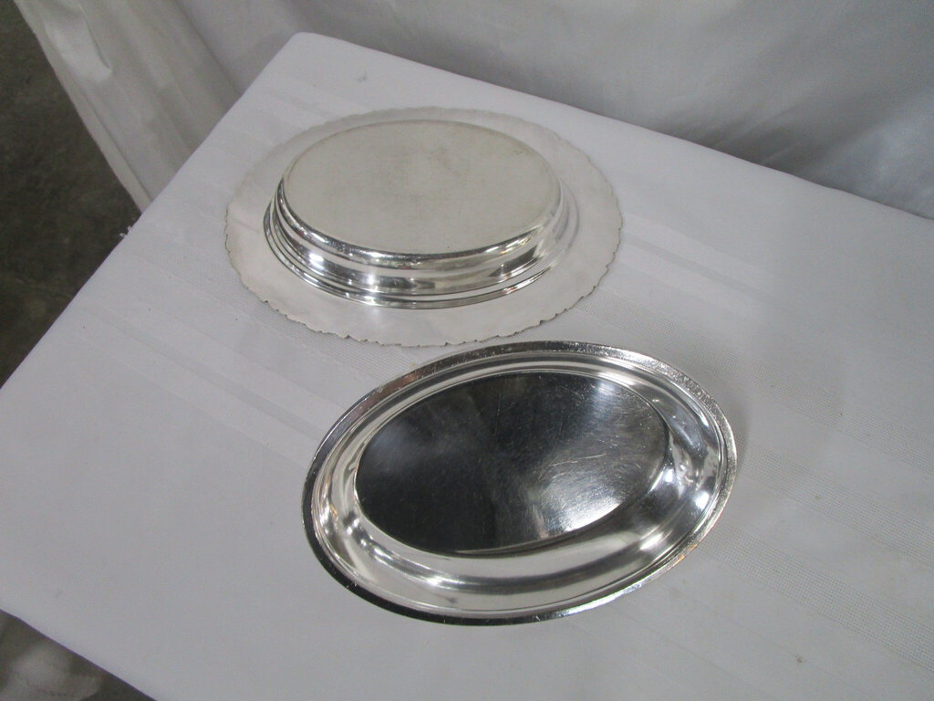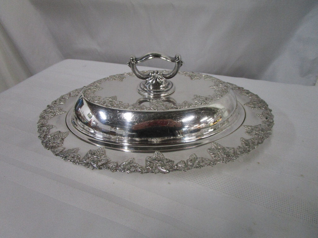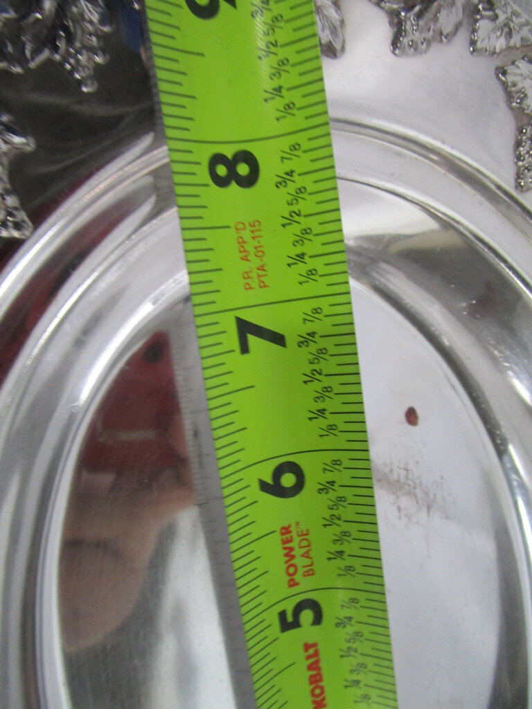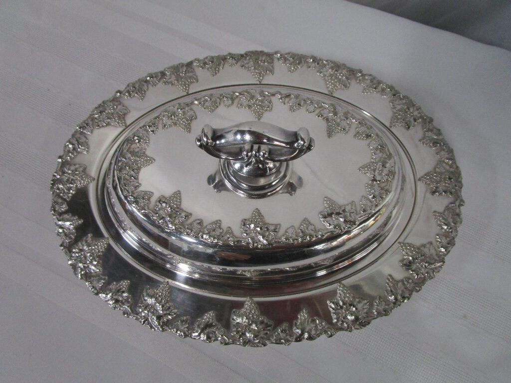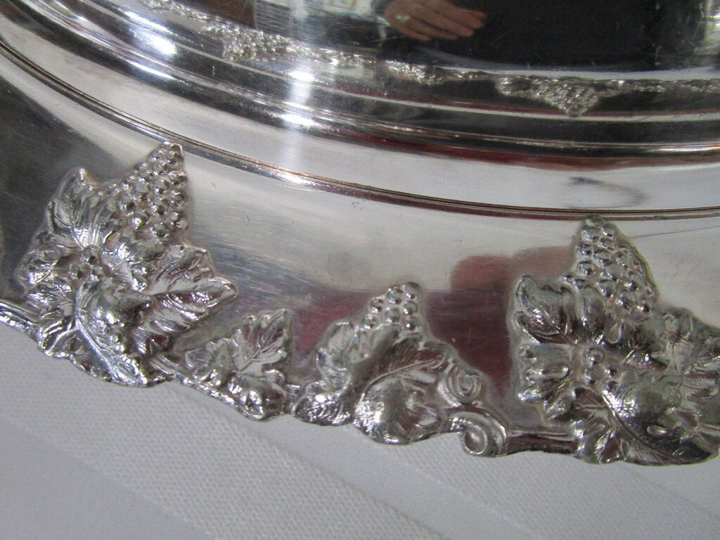 Charming vintage English hallmark silverplate (looks to be silverplate on copper) covered oval server with raised harvest grapes motif. Server has wear/tear, scratches, finish loss, tarnish, 2 spots on bottom of dish seem to reveal base copper and server is 1" dish and about 4" handle height by 11" base length by 8 1/2" depth by 8" length by 5" interior insert. If you choose to arrange to have an item shipped please make sure to insure the shipment as we are not responsible for damage that occurs in shipping. All items are sold “As Is” and all sales are final. Most pieces are one of a kind and can not be replaced. We will give you as much information as possible regarding the pieces condition including supplying additional pictures if needed. Due to the nature of antique and vintage items there may be blemishes, nicks or other imperfections as expected with age and use. If you want more information about an item, such as additional images or condition, please inquire! All items are located in our store at Standpipe Antiques, 502 O Neal Street, Belton, SC, 29627. Our hours are Wednesday through Friday 10am to 6pm, Saturday 10am to 5pm and Sundays 12-5pm. Come by and see us!