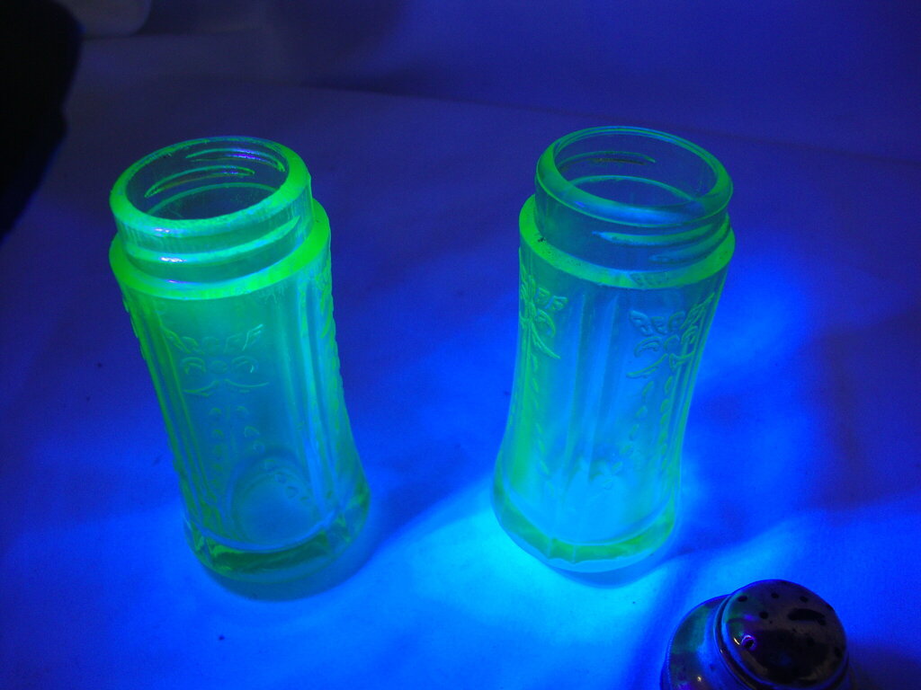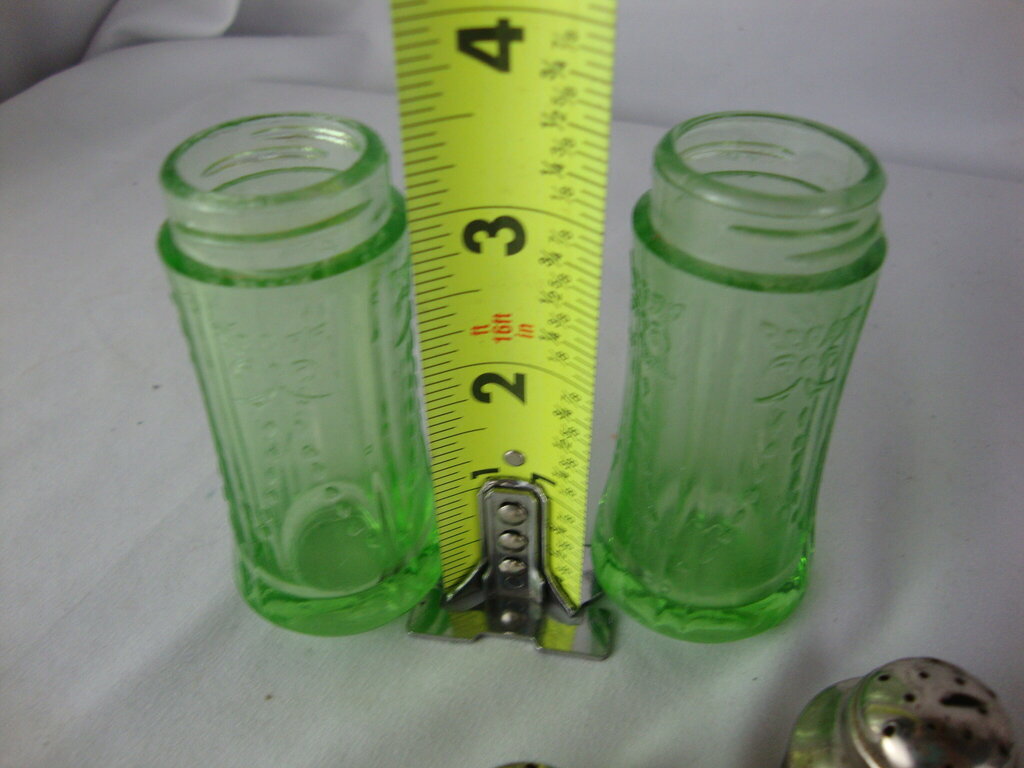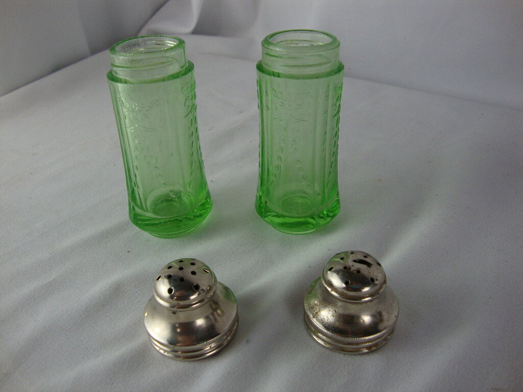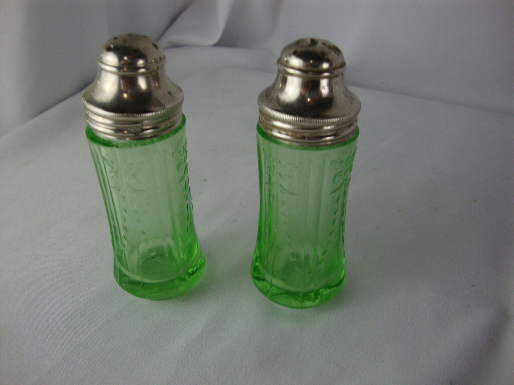 Fun vintage Federal Glass Madrid pattern uranium vaseline glass salt and pepper shakers with metal screw off lids. Shakers have wear/tear, rough edges at top, shaker lid has slit in top and measure 3 1/4" height by 1 1/8" top diameters. If you choose to arrange to have an item shipped please make sure to insure the shipment as we are not responsible for damage that occurs in shipping. All items are sold “As Is” and all sales are final. Most pieces are one of a kind and can not be replaced. We will give you as much information as possible regarding the pieces condition including supplying additional pictures if needed. Due to the nature of antique and vintage items there may be blemishes, nicks or other imperfections as expected with age and use. If you want more information about an item, such as additional images or condition, please inquire! All items are located in our store at Standpipe Antiques, 502 O Neal Street, Belton, SC, 29627. Our hours are Wednesday through Saturday 10am to 5pm, and Sundays 12-5pm. Come by and see us!