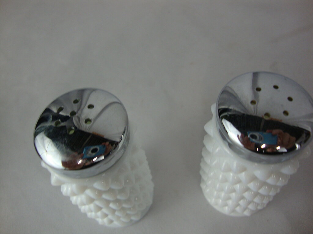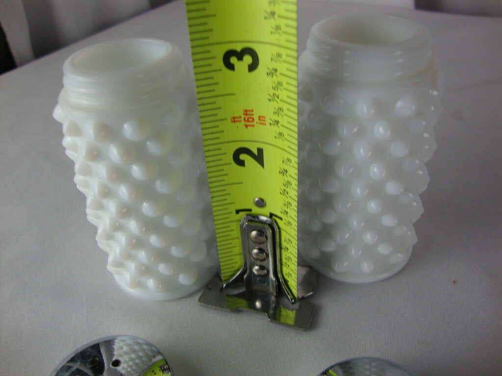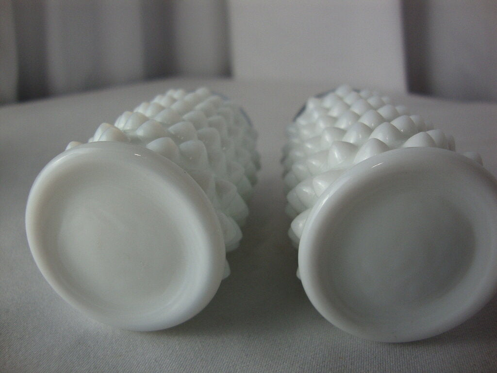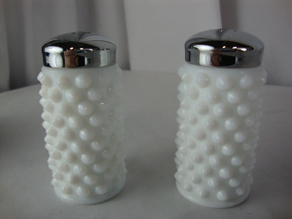Fenton adorable classic white milk glass hobnail salt and pepper shakers with small cylinder body and metal screw on lids. Set has minimal wear/tear and measure about 3" height by 1" diameter. If you choose to arrange to have an item shipped please make sure to insure the shipment as we are not responsible for damage that occurs in shipping. All items are sold “As Is” and all sales are final. Most pieces are one of a kind and can not be replaced. We will give you as much information as possible regarding the pieces condition including supplying additional pictures if needed. Due to the nature of antique and vintage items there may be blemishes, nicks or other imperfections as expected with age and use. If you want more information about an item, such as additional images or condition, please inquire! All items are located in our store at Standpipe Antiques, 502 O Neal Street, Belton, SC, 29627. Our hours are Wednesday through Saturday 10am to 5pm and Sundays 12-5pm so come by and see us!