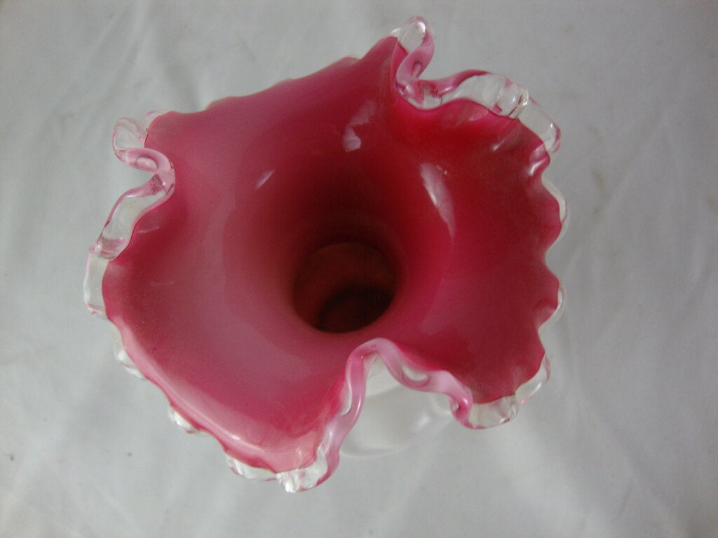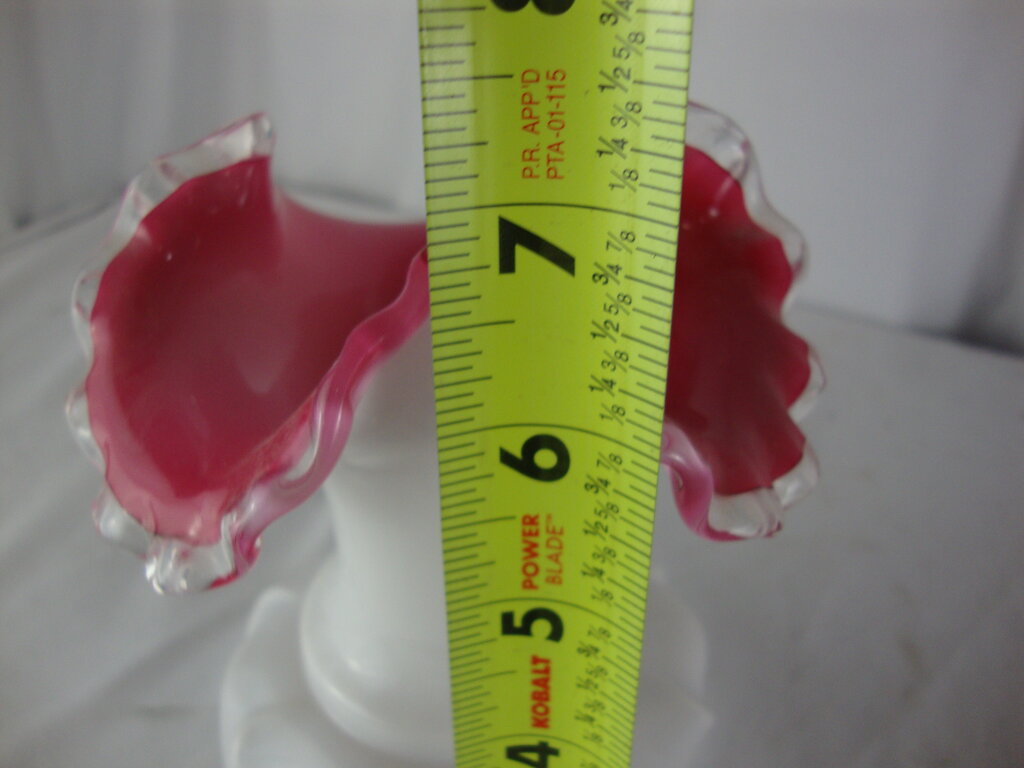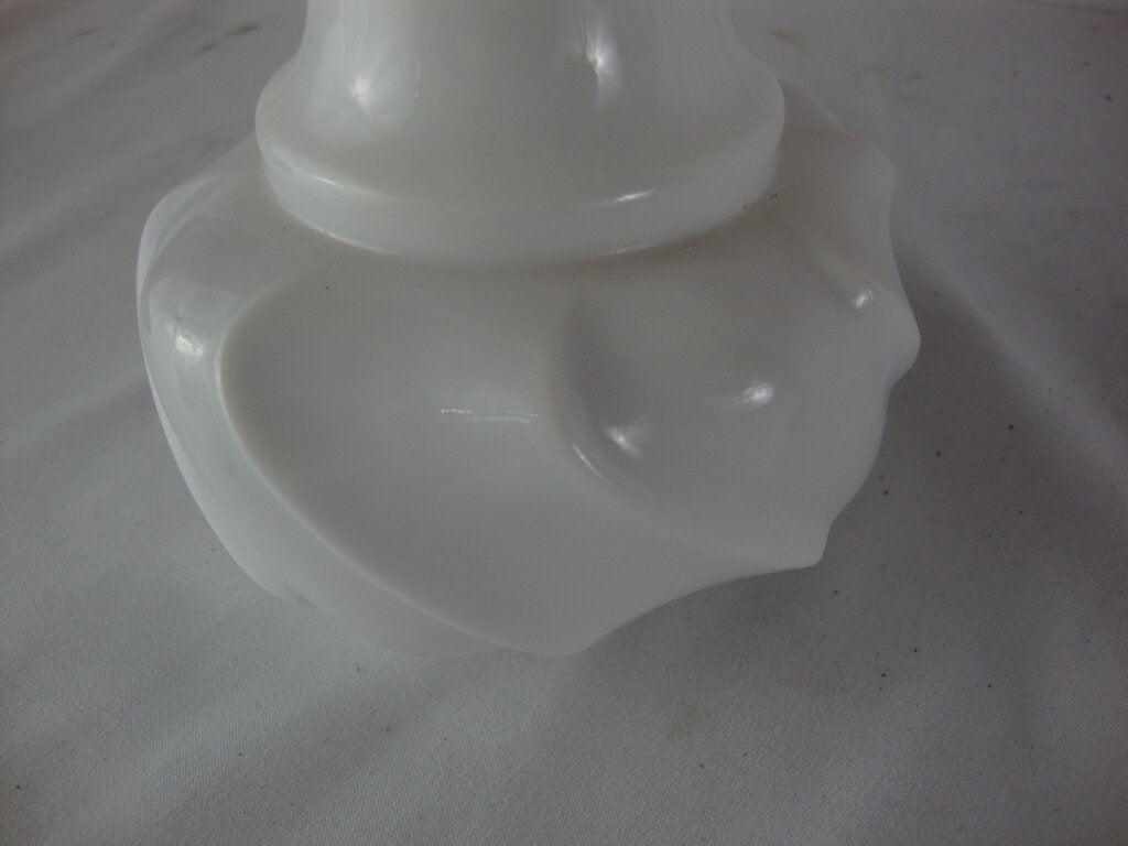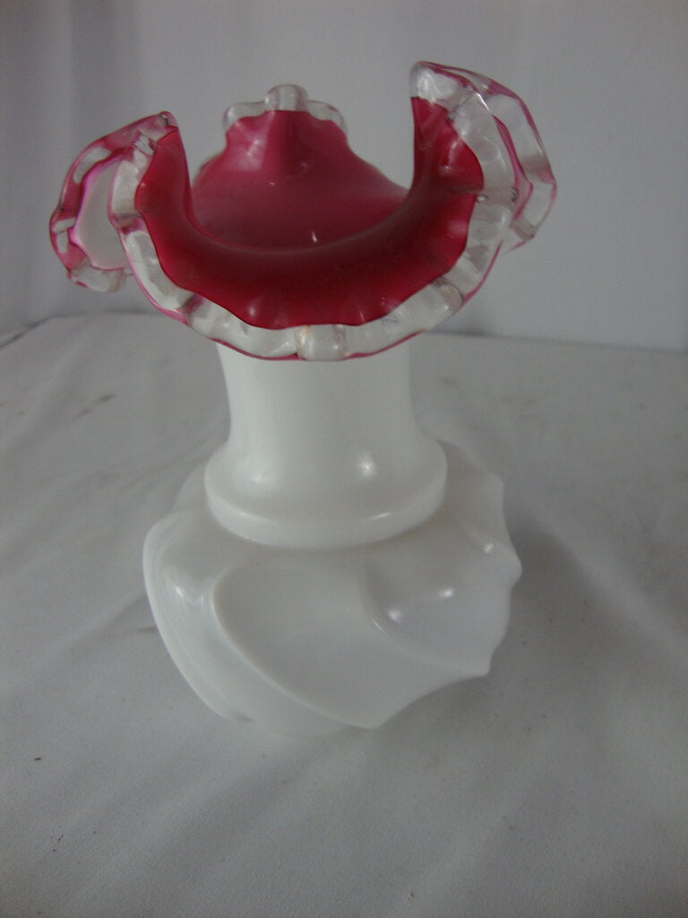 Vintage Fenton Peach Crest white milk glass exterior vase with wide spirals lower body and ruffled crimped top with peachy pink exterior and clear edges. Vase has minimal wear/tear and measures about 7" height by 4 1/2" top and 4" lower diameter. If you choose to arrange to have an item shipped please make sure to insure the shipment as we are not responsible for damage that occurs in shipping. All items are sold “As Is” and all sales are final. Most pieces are one of a kind and can not be replaced. We will give you as much information as possible regarding the pieces condition including supplying additional pictures if needed. Due to the nature of antique and vintage items there may be blemishes, nicks or other imperfections as expected with age and use. If you want more information about an item, such as additional images or condition, please inquire! All items are located in our store at Standpipe Antiques, 502 O Neal Street, Belton, SC, 29627. Our hours are Wednesday through Saturday 10am to 5pm and Sundays 12-5pm so come by and see us!