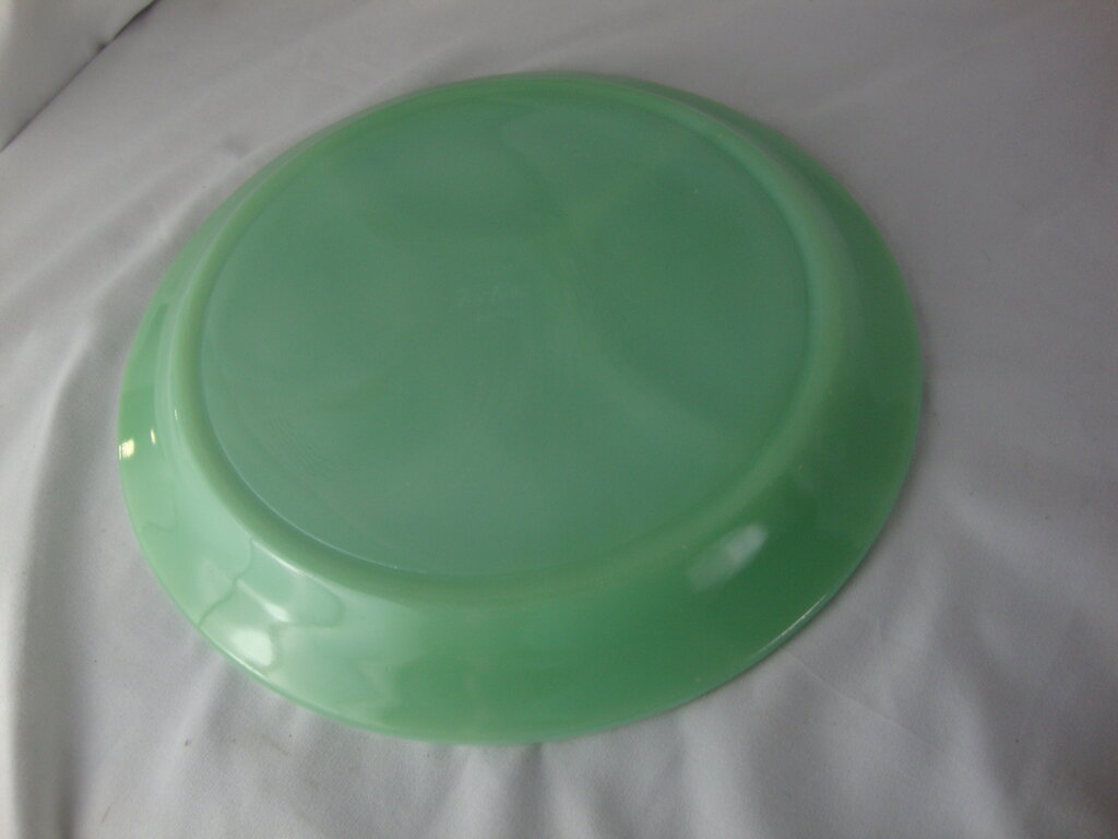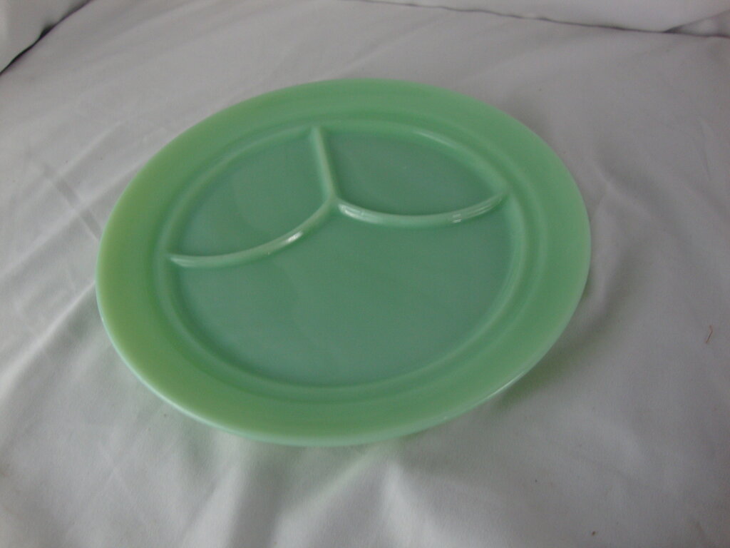 Vintage adorable Fire King jadeite 3 part restaurant divided dinner plate dish with larger entree area and two small curved divided areas. Plate has wear/tear, flaws, possible utensil scratches and measures 9 1/2" top diameter. (NOTE: (5) dishes currently available at $40.00 per dish) If you choose to arrange to have an item shipped please make sure to insure the shipment as we are not responsible for damage that occurs in shipping. All items are sold “As Is” and all sales are final. Most pieces are one of a kind and can not be replaced. We will give you as much information as possible regarding the pieces condition including supplying additional pictures if needed. Due to the nature of antique and vintage items there may be blemishes, nicks or other imperfections as expected with age and use. If you want more information about an item, such as additional images or condition, please inquire! All items are located in our store at Standpipe Antiques, 502 O Neal Street, Belton, SC, 29627. Our hours are Wednesday through Friday 10am to 6pm, Saturday 10am to 5pm and Sundays 12-5pm. Come by and see us!