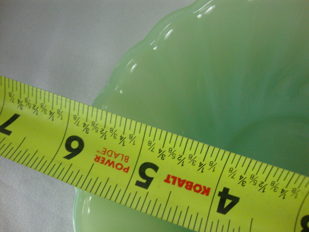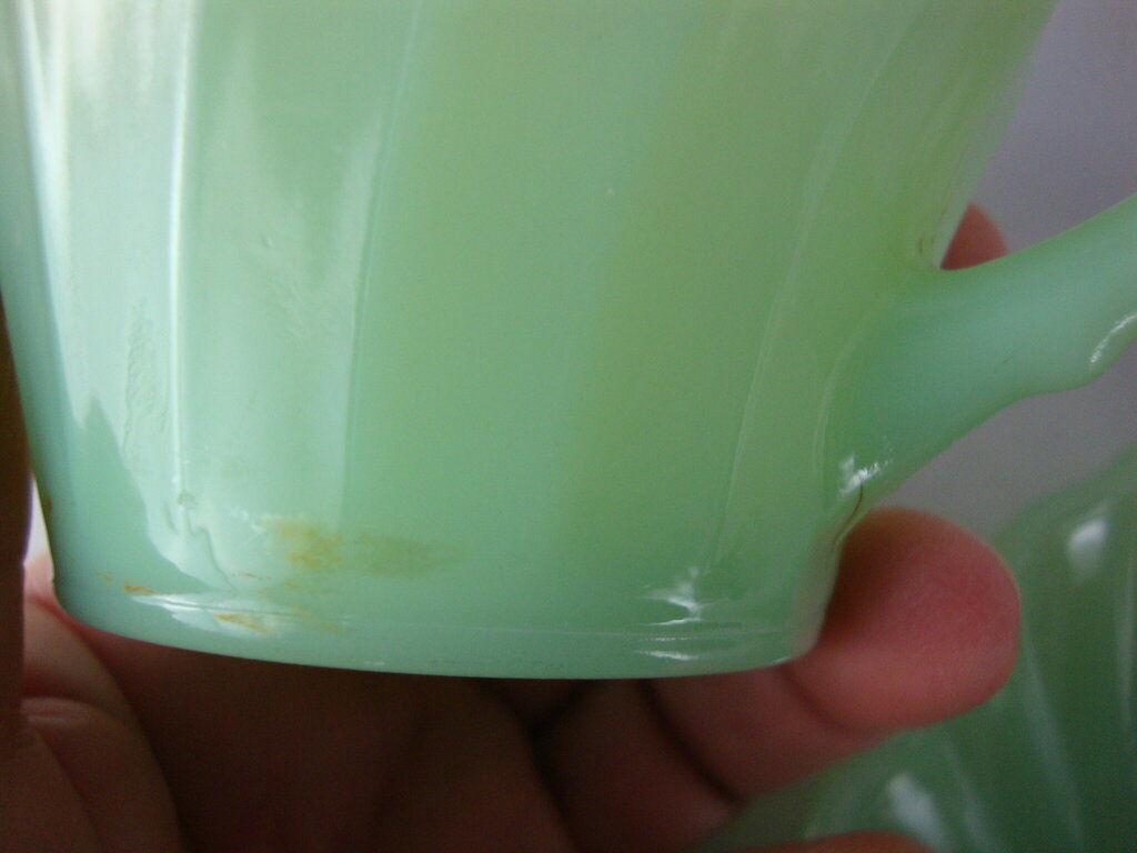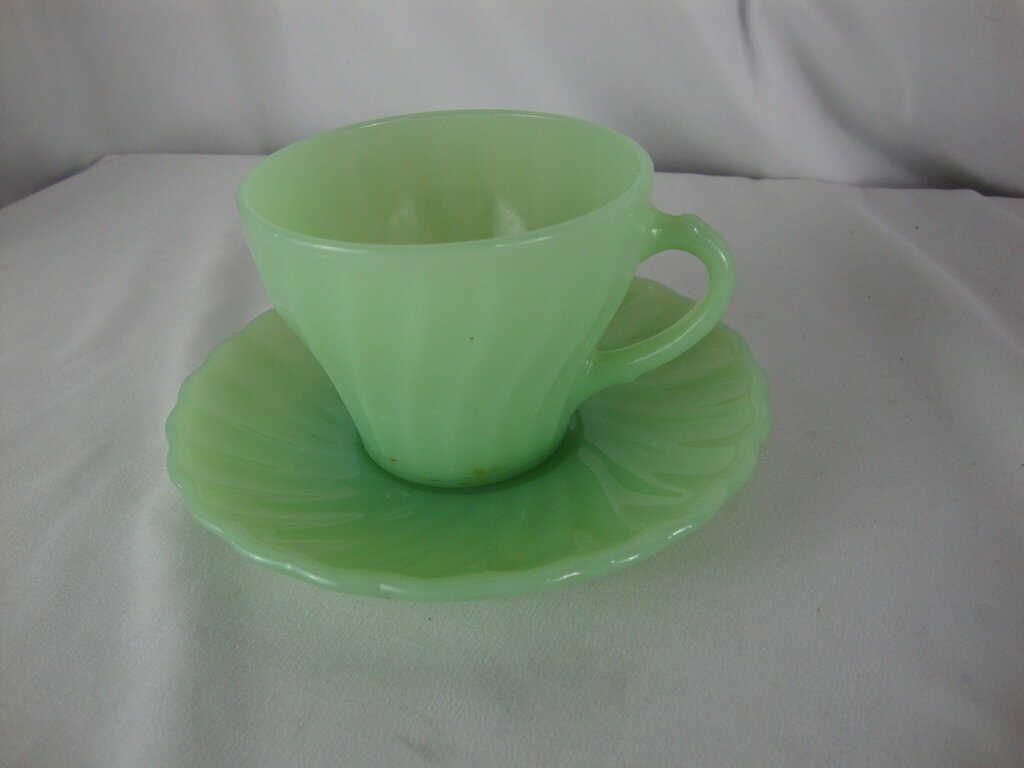 Vintage adorable Fire King Jadeite Swirl teacup and saucer set with delicate swirled pattern on saucer and vertical swirl on teacup with small handle. Set has wear/tear, surface stains and measure 5 3/4" saucer top diameter and cup is 2 1/2" height by 3 1/2" top diameter. If you choose to arrange to have an item shipped please make sure to insure the shipment as we are not responsible for damage that occurs in shipping. All items are sold “As Is” and all sales are final. Most pieces are one of a kind and can not be replaced. We will give you as much information as possible regarding the pieces condition including supplying additional pictures if needed. Due to the nature of antique and vintage items there may be blemishes, nicks or other imperfections as expected with age and use. If you want more information about an item, such as additional images or condition, please inquire! All items are located in our store at Standpipe Antiques, 502 O Neal Street, Belton, SC, 29627. Our hours are Wednesday through Saturday 10am to 5pm and Sundays 12-5pm. Come by and see us!