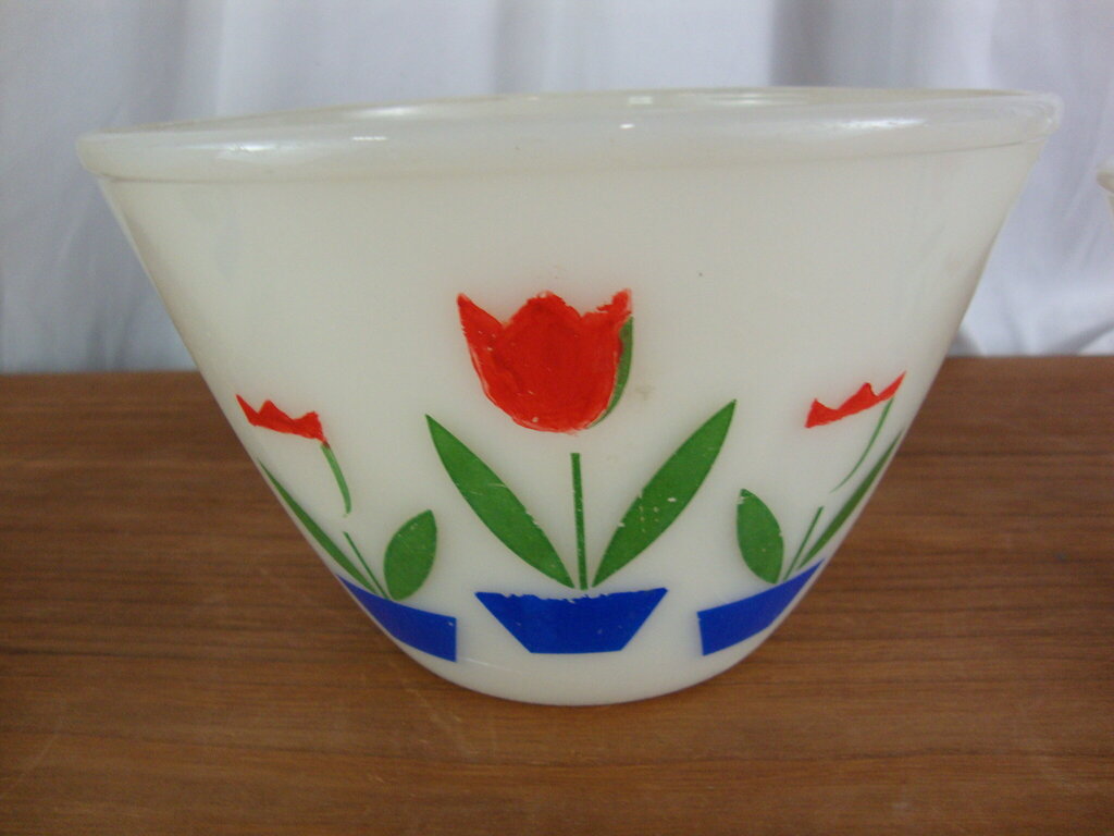 Retro adorable Fire King white milk glass nesting mixing bowls set of 3 with vibrant blooming tulips design on front/back. Bowls have wear/tear, finish loss, stains, middle bowl has overall discoloration and interior stains per photos and larger bowl is about 5 1/4" height by 8 1/2" top diameter and smallest is 4" height by 6 1/2" top diameter. If you choose to arrange to have an item shipped please make sure to insure the shipment as we are not responsible for damage that occurs in shipping. All items are sold “As Is” and all sales are final. Most pieces are one of a kind and can not be replaced. We will give you as much information as possible regarding the pieces condition including supplying additional pictures if needed. Due to the nature of antique and vintage items there may be blemishes, nicks or other imperfections as expected with age and use. If you want more information about an item, such as additional images or condition, please inquire! All items are located in our store at Standpipe Antiques, 502 O Neal Street, Belton, SC, 29627. Our hours are Wednesday through Friday 10am to 6pm, Saturday 10am to 5pm and Sundays 12-5pm. Come by and see us!