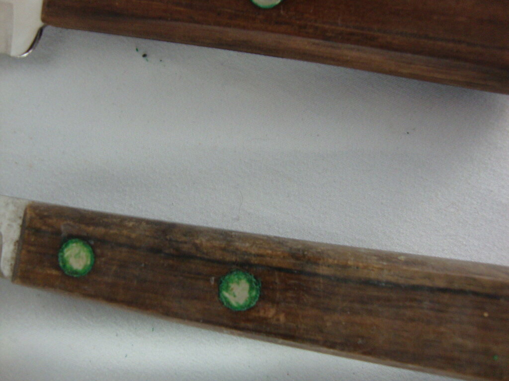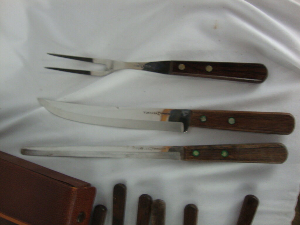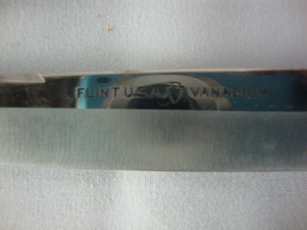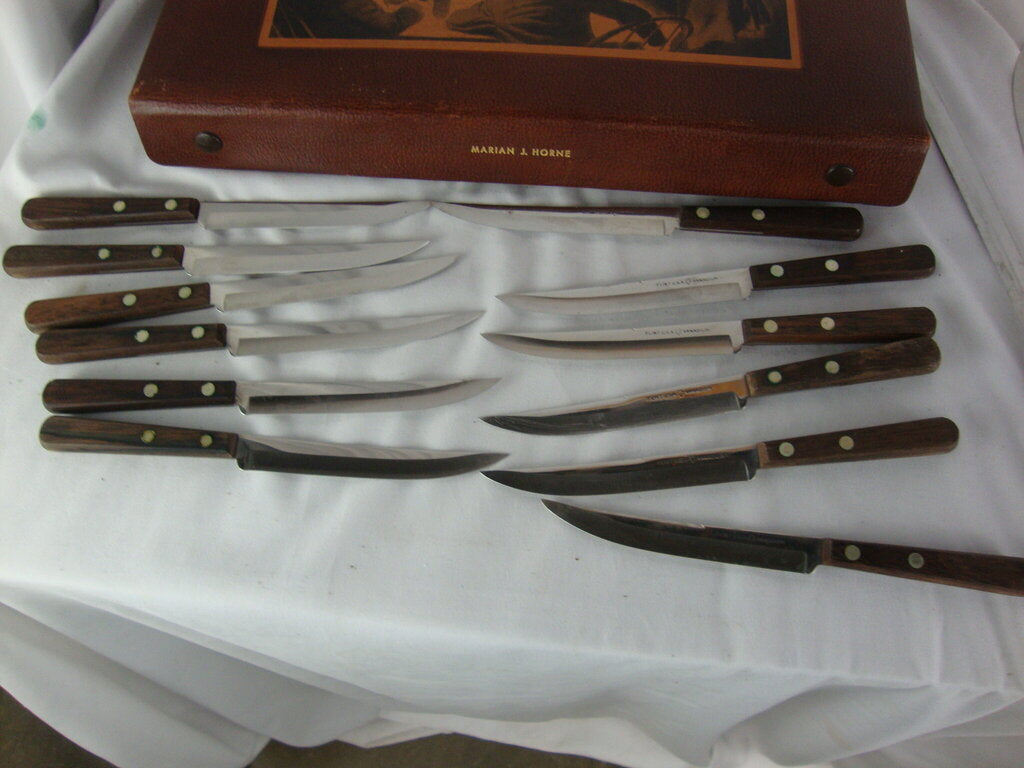 Vintage Flint USA knife set with 12 steak knives and 3 piece carving set in snap closure carry case. Set has wear/tear, greening around handles per photos and steak knives are 8" length and carving set is about 13" knife length. If you choose to arrange to have an item shipped please make sure to insure the shipment as we are not responsible for damage that occurs in shipping. All items are sold “As Is” and all sales are final. Most pieces are one of a kind and can not be replaced. We will give you as much information as possible regarding the pieces condition including supplying additional pictures if needed. Due to the nature of antique and vintage items there may be blemishes, nicks or other imperfections as expected with age and use. If you want more information about an item, such as additional images or condition, please inquire! All items are located in our store at Standpipe Antiques, 502 O Neal Street, Belton, SC, 29627. Our hours are Wednesday through Saturday 10am to 5pm, Sundays 12-5pm. Come by and see us!