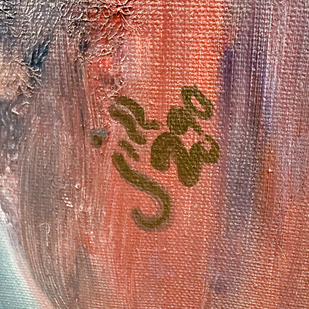 This oil on canvas painting features an array of color with an abstract depiction of a cross and dove. A fantastic professional frame job. Signed "Jill" and dated presumably "90" for 1990. Already comes with a wire for hanging. Some imperfections on the frame including tape on a back corner. The tape is not visible from the front.