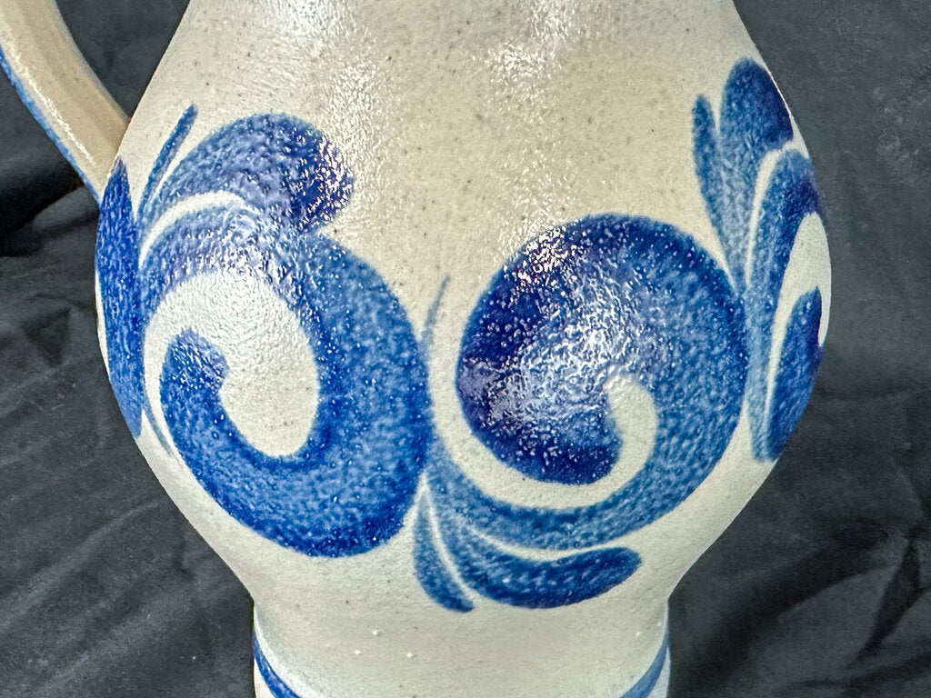 Near perfect, if not perfect, condition! This stupendous stoneware pitcher from the German company Kleirabe Keramik features beautiful hand-painted scroll work. The blue is vibrant and has natural variation from the handiwork. A lovely salt glaze adds fantastic texture.