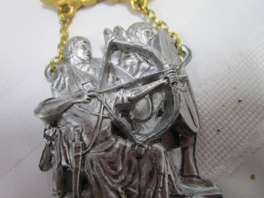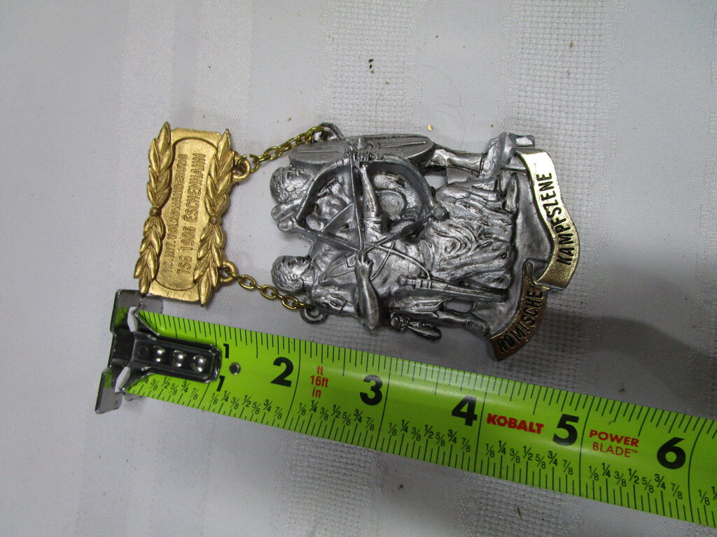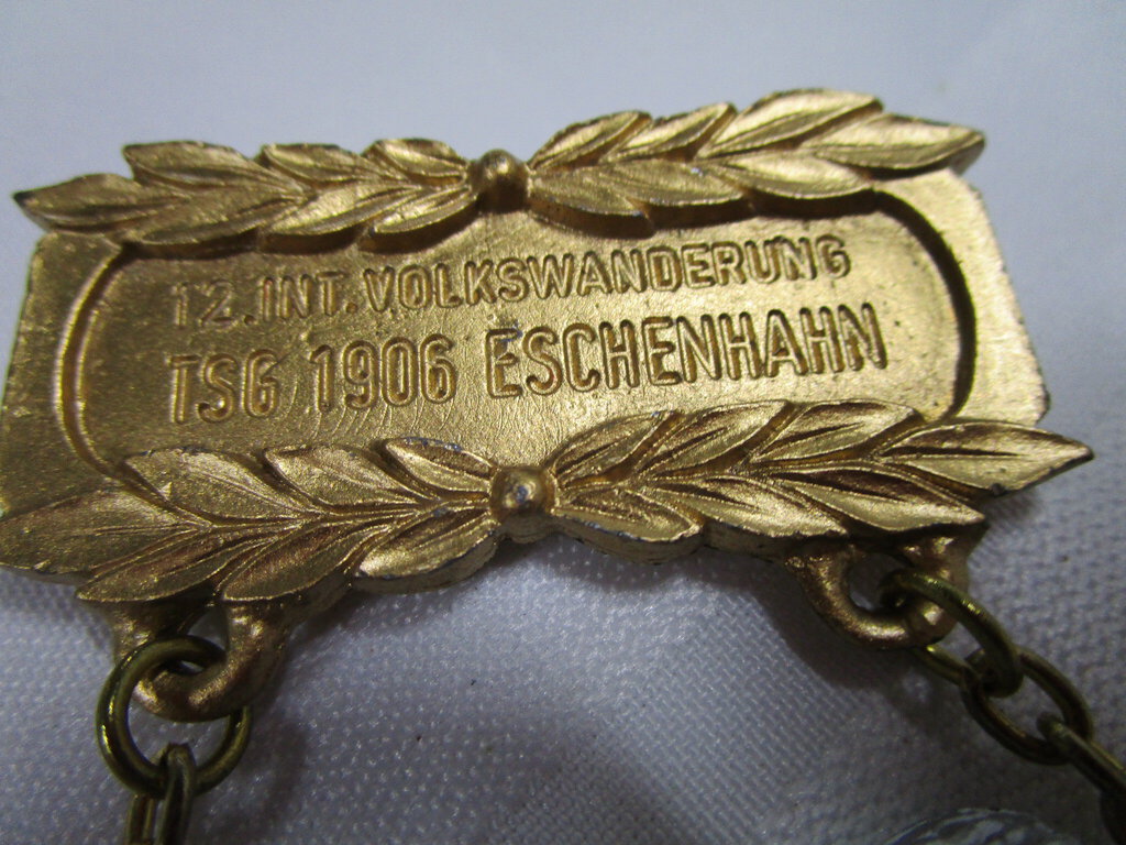 Fun vintage hiking walking metal from Germany from TSG 1906 Eschenhahn with silver tone relief of several men in battle shooting an arrow and holding a shield. Medal has wear, finish loss and measures 4 1/2" height by 2" width. If you choose to arrange to have an item shipped please make sure to insure the shipment as we are not responsible for damage that occurs in shipping. All items are sold “As Is” and all sales are final. Most pieces are one of a kind and can not be replaced. We will give you as much information as possible regarding the pieces condition including supplying additional pictures if needed. Due to the nature of antique and vintage items there may be blemishes, nicks or other imperfections as expected with age and use. If you want more information about an item, such as additional images or condition, please inquire! All items are located in our store at Standpipe Antiques, 502 O Neal Street, Belton, SC, 29627. Our hours are Wednesday through Friday 10am to 6pm, Saturday 10am to 5pm and Sundays 12-5pm. Come by and see us!