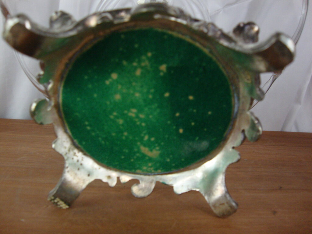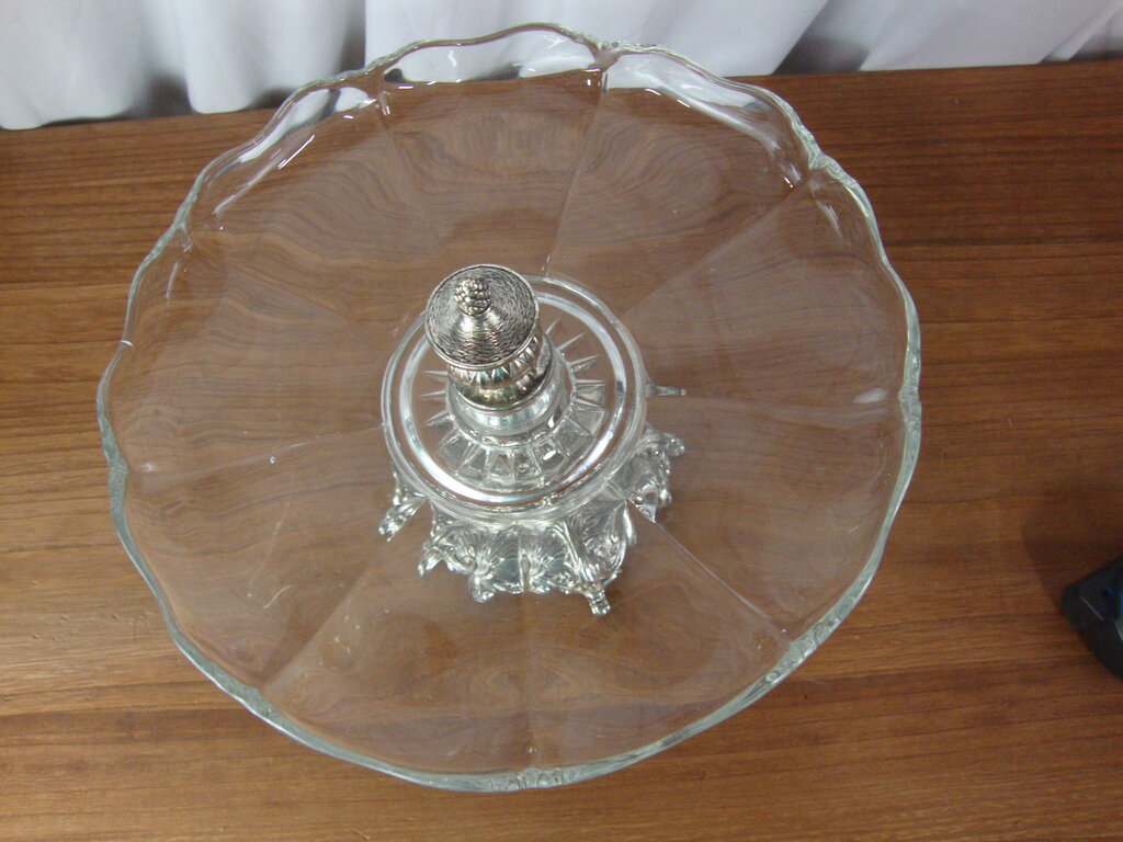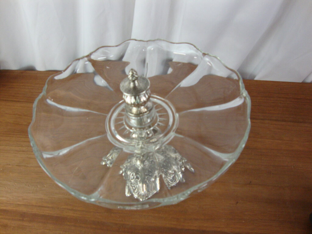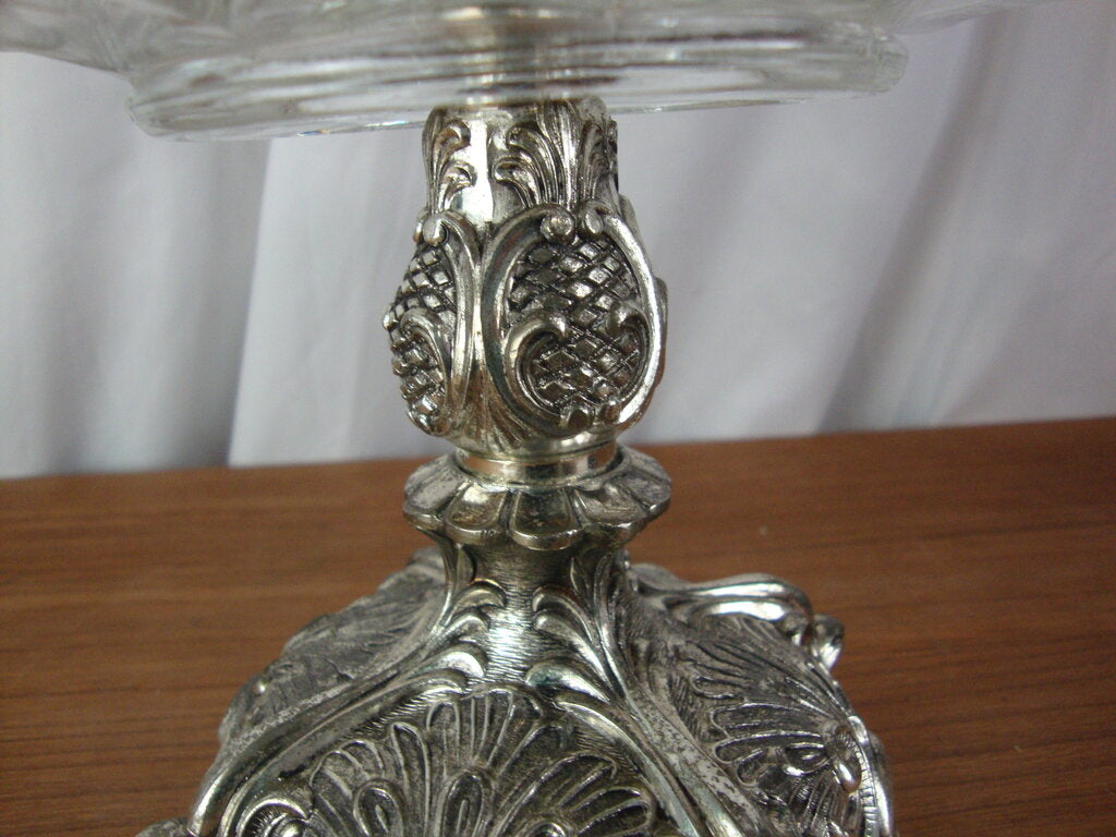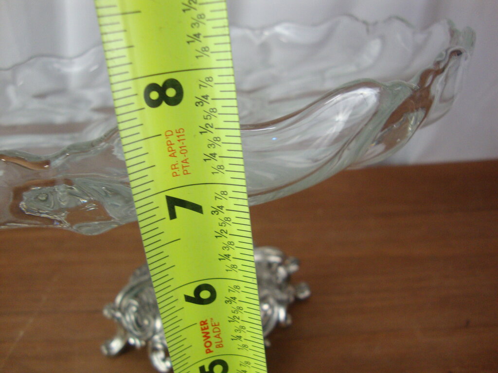 Lovely vintage appetizer dessert stand with top clear glass flower shape with short sides and middle silver color metal stand base with scrollwork four footed base with middle top finial. Stand has wear/tear, finish loss, metal spotting, tarnish and measures about 7 1/2" glass height by 11 1/2" glass diameter by 4" base width. If you choose to arrange to have an item shipped please make sure to insure the shipment as we are not responsible for damage that occurs in shipping. All items are sold “As Is” and all sales are final. Most pieces are one of a kind and can not be replaced. We will give you as much information as possible regarding the pieces condition including supplying additional pictures if needed. Due to the nature of antique and vintage items there may be blemishes, nicks or other imperfections as expected with age and use. If you want more information about an item, such as additional images or condition, please inquire! All items are located in our store at Standpipe Antiques, 502 O Neal Street, Belton, SC, 29627. Our hours are Wednesday through Saturday 10am to 5pm, Sundays 12-5pm. Come by and see us!
