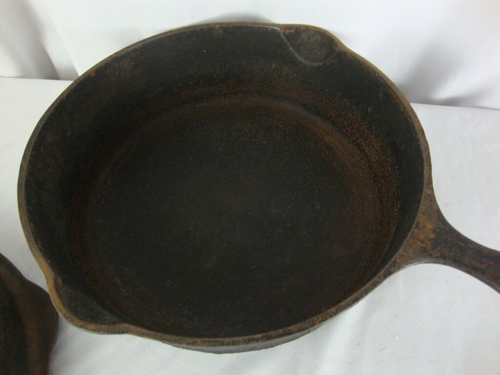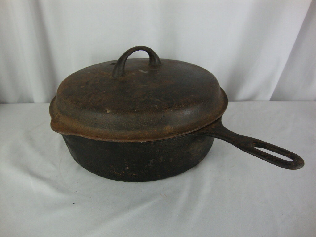Vintage appears to be Griswold Iron Mountain #8 chicken fryer with heavy dome lid marked Chicken Fryer on pan back with 1034 and 1035 lid stamp. Fryer has much wear/tear, unrestored condition, scratches, rust, and measures about 3 1/2" height by 15' total length by 10 1/4" top pan diameter. If you choose to arrange to have an item shipped please make sure to insure the shipment as we are not responsible for damage that occurs in shipping. All items are sold “As Is” and all sales are final. Most pieces are one of a kind and can not be replaced. We will give you as much information as possible regarding the pieces condition including supplying additional pictures if needed. Due to the nature of antique and vintage items there may be blemishes, nicks or other imperfections as expected with age and use. If you want more information about an item, such as additional images or condition, please inquire! All items are located in our store at Standpipe Antiques, 502 O Neal Street, Belton, SC, 29627. Our hours are Wednesday through Saturday 10am to 5pm and Sundays 12-5pm. Come by and see us!