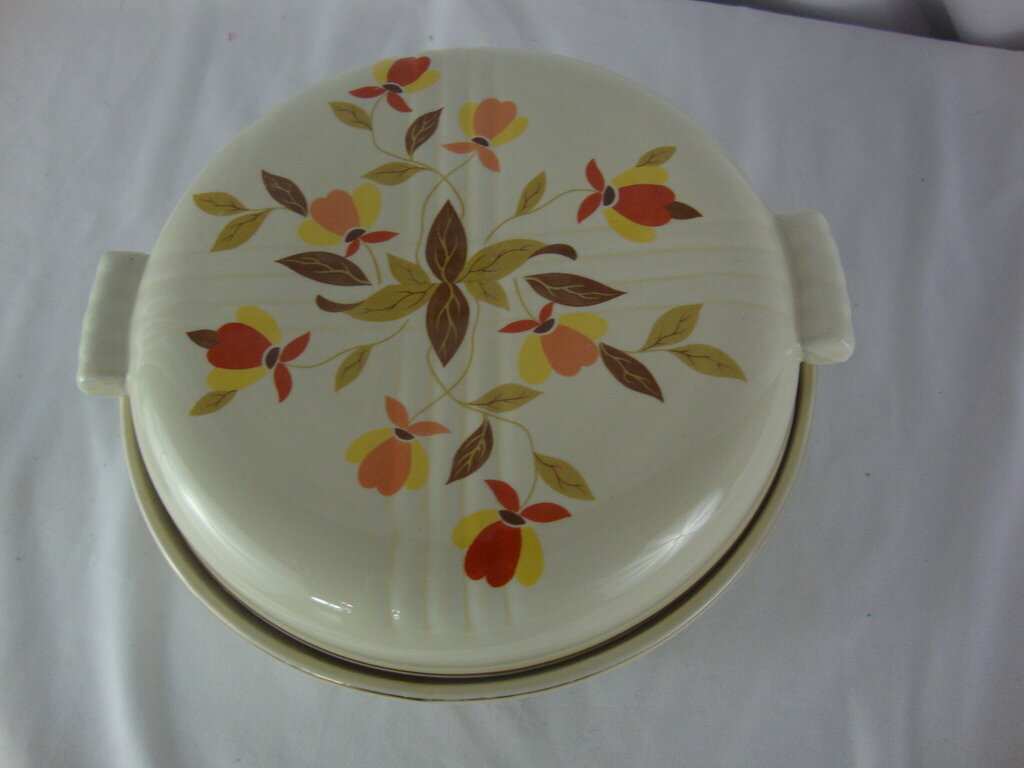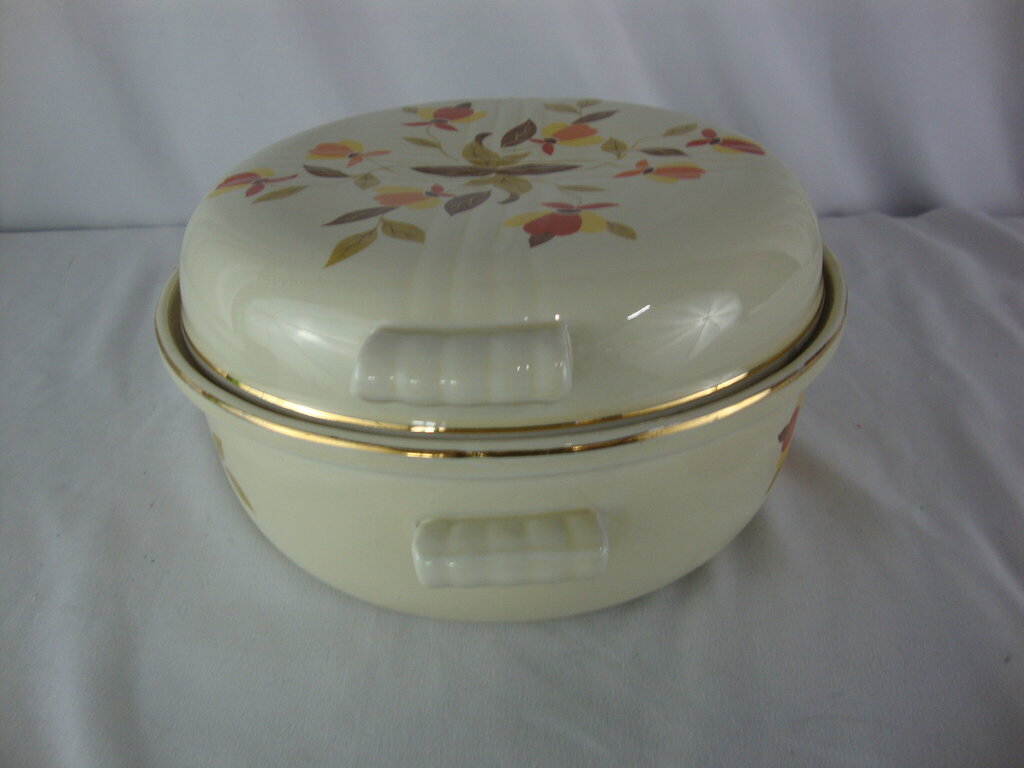 Charming vintage casserole dish from Hall Jewel Tea Autumn Leaf pattern with round bowl with side handles and dome lid also with side handles and gold edge trim. Dish has wear/tear, finish loss and measures about 3" base and 4 1/2" lid height by 8" diameter. If you choose to arrange to have an item shipped please make sure to insure the shipment as we are not responsible for damage that occurs in shipping. All items are sold “As Is” and all sales are final. Most pieces are one of a kind and can not be replaced. We will give you as much information as possible regarding the pieces condition including supplying additional pictures if needed. Due to the nature of antique and vintage items there may be blemishes, nicks or other imperfections as expected with age and use. If you want more information about an item, such as additional images or condition, please inquire! All items are located in our store at Standpipe Antiques, 502 O Neal Street, Belton, SC, 29627. Our hours are Wednesday through Saturday 10am to 5pm, Sundays 12-5pm. Come by and see us!