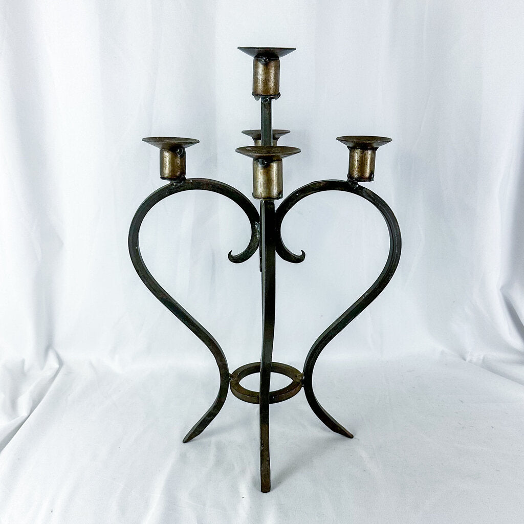 A beautiful hand-made candelabra crafted from wrought iron. This piece is heavy and very sturdy. Holds 5 candles. Slight wobble possible with uneven surfaces. There's a place in the bottom ring where it doesn't connect. Not sure if this is intentional, a defect from production, or a sign of age. Some rust & discoloration. There's also wax in the candleholders. It is vintage, maybe antique, so it does have signs of age and wear all over.