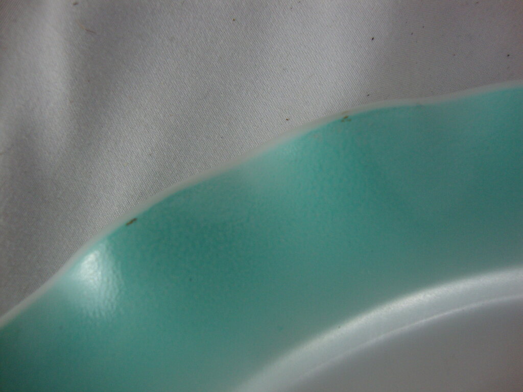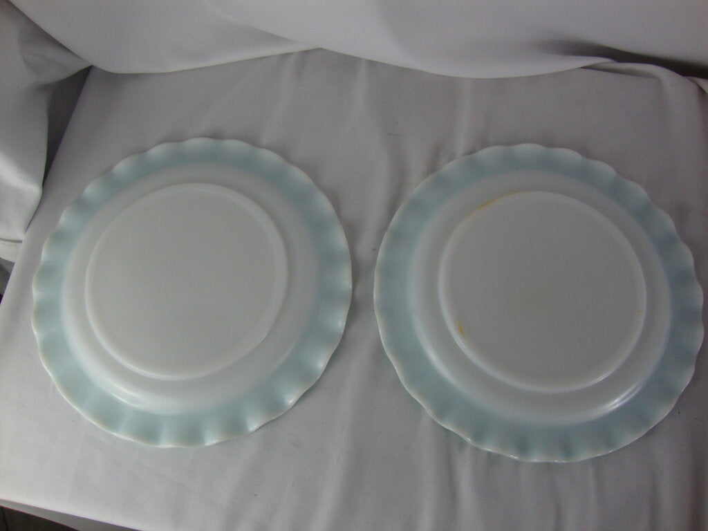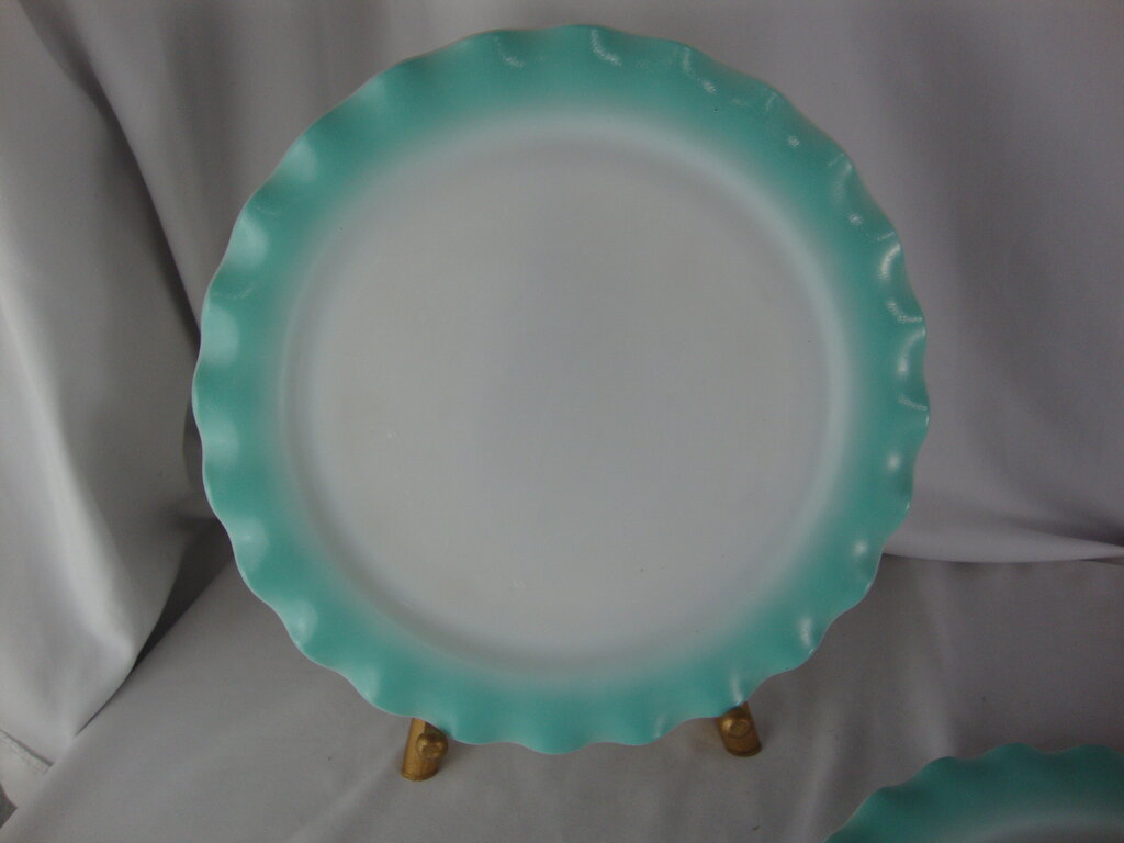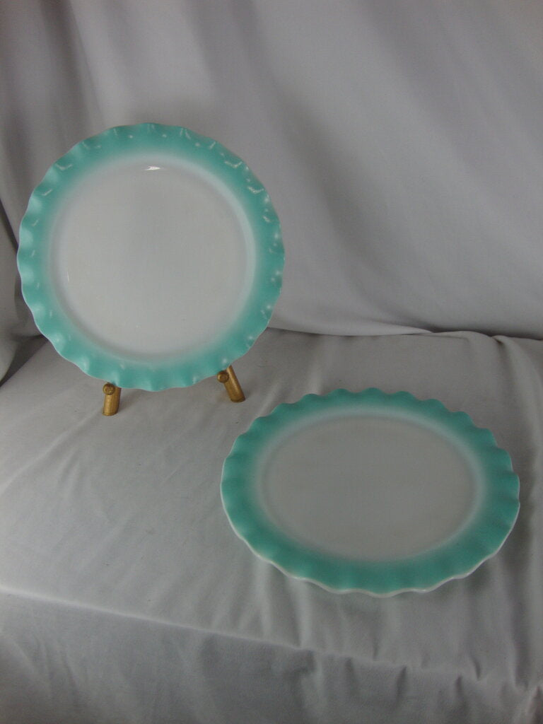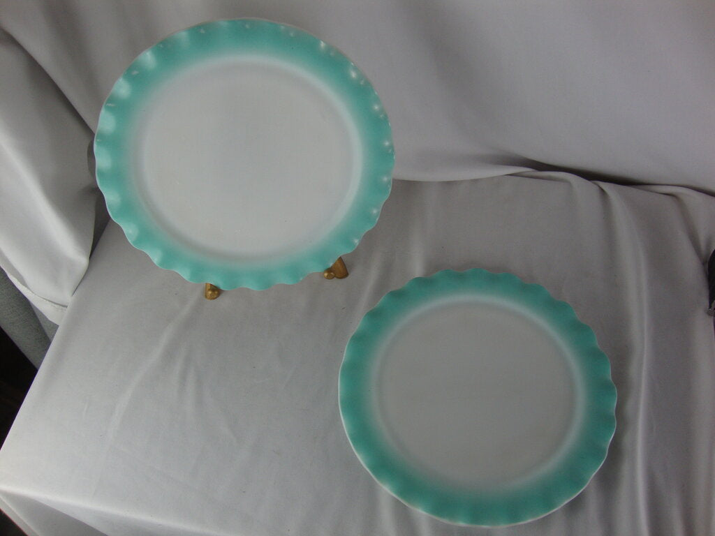 Vintage adorable Hazel Atlas aqua blue crinoline dinner plate set of 2 with white body with blue ruffled edges. Plates have wear/tear per photos and measures 10 1/2" top diameter. If you choose to arrange to have an item shipped please make sure to insure the shipment as we are not responsible for damage that occurs in shipping. All items are sold “As Is” and all sales are final. Most pieces are one of a kind and can not be replaced. We will give you as much information as possible regarding the pieces condition including supplying additional pictures if needed. Due to the nature of antique and vintage items there may be blemishes, nicks or other imperfections as expected with age and use. If you want more information about an item, such as additional images or condition, please inquire! All items are located in our store at Standpipe Antiques, 502 O Neal Street, Belton, SC, 29627. Our hours are Wednesday through Saturday 10am to 5pm and Sundays 12-5pm. Come by and see us!