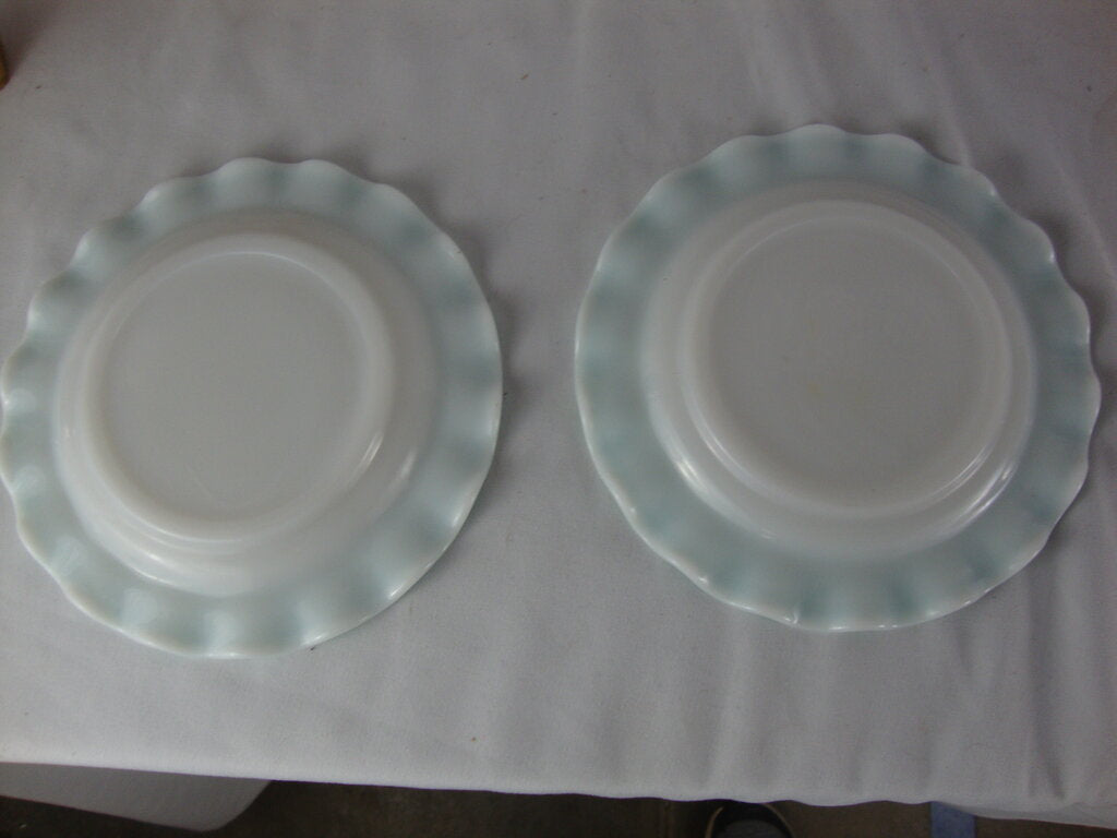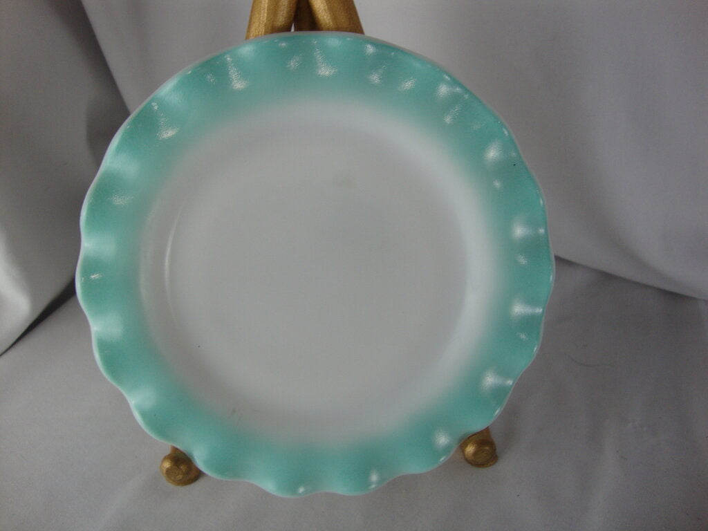 Vintage adorable Hazel Atlas aqua blue crinoline salad dessert plate set of 2 with white body with blue ruffled edges. Plates have wear/tear per photos and measures 6 3/4" top diameter. If you choose to arrange to have an item shipped please make sure to insure the shipment as we are not responsible for damage that occurs in shipping. All items are sold “As Is” and all sales are final. Most pieces are one of a kind and can not be replaced. We will give you as much information as possible regarding the pieces condition including supplying additional pictures if needed. Due to the nature of antique and vintage items there may be blemishes, nicks or other imperfections as expected with age and use. If you want more information about an item, such as additional images or condition, please inquire! All items are located in our store at Standpipe Antiques, 502 O Neal Street, Belton, SC, 29627. Our hours are Wednesday through Saturday 10am to 5pm and Sundays 12-5pm. Come by and see us!