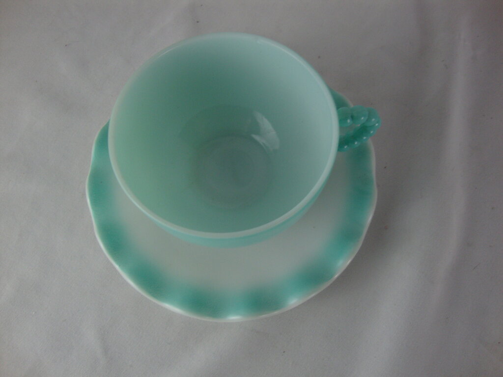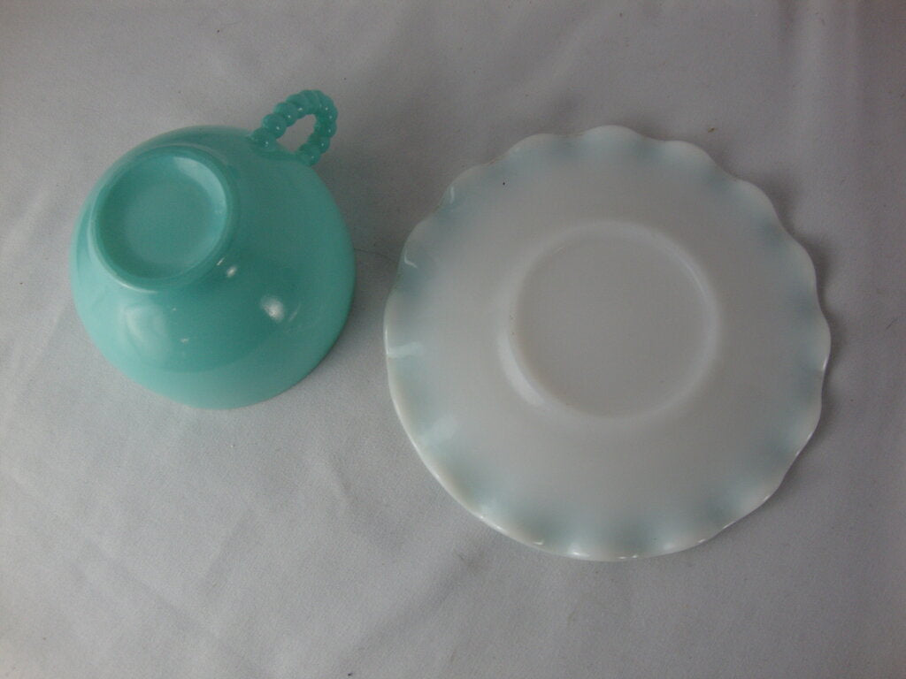 Vintage adorable Hazel Atlas aqua blue crinoline glass teacup and saucer set with white saucer with blue ruffled edges and blue exterior teacup with beaded look handle. Set has wear/tear and measures 5 1/2" top diameter and teacup is 2 1/4" height by 3 1/2" top diameter. If you choose to arrange to have an item shipped please make sure to insure the shipment as we are not responsible for damage that occurs in shipping. All items are sold “As Is” and all sales are final. Most pieces are one of a kind and can not be replaced. We will give you as much information as possible regarding the pieces condition including supplying additional pictures if needed. Due to the nature of antique and vintage items there may be blemishes, nicks or other imperfections as expected with age and use. If you want more information about an item, such as additional images or condition, please inquire! All items are located in our store at Standpipe Antiques, 502 O Neal Street, Belton, SC, 29627. Our hours are Wednesday through Saturday 10am to 5pm and Sundays 12-5pm. Come by and see us!