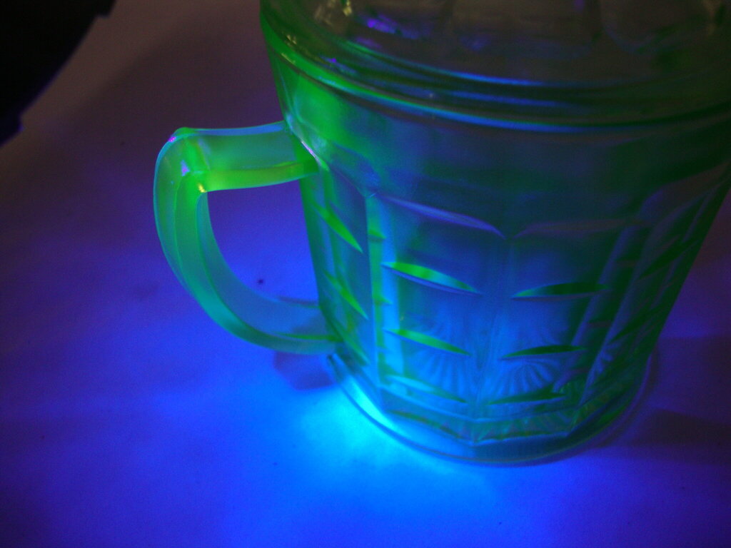 Vintage cool Hazel Atlas Optic Block pattern radioactive Uranium glass sugar bowl with double side handles and matching lid with knob handle. Bowl has wear/tear, and measures about 4" body and 5 1/2" lid height by 5" handle to handle width by 3 1/2" opening diameter. If you choose to arrange to have an item shipped please make sure to insure the shipment as we are not responsible for damage that occurs in shipping. All items are sold “As Is” and all sales are final. Most pieces are one of a kind and can not be replaced. We will give you as much information as possible regarding the pieces condition including supplying additional pictures if needed. Due to the nature of antique and vintage items there may be blemishes, nicks or other imperfections as expected with age and use. If you want more information about an item, such as additional images or condition, please inquire! All items are located in our store at Standpipe Antiques, 502 O Neal Street, Belton, SC, 29627. Our hours are Wednesday through Saturday 10am to 5pm, Sundays 12-5pm. Come by and see us!