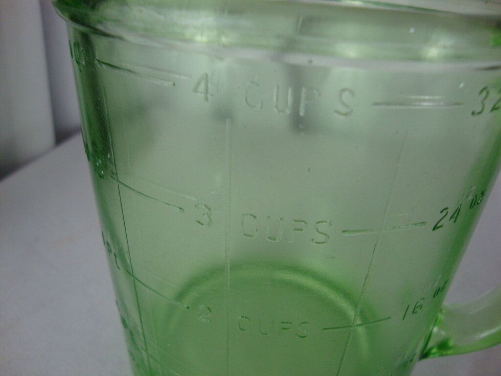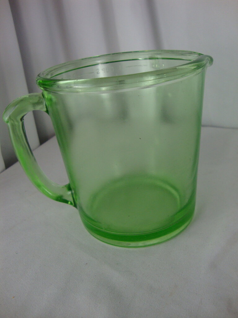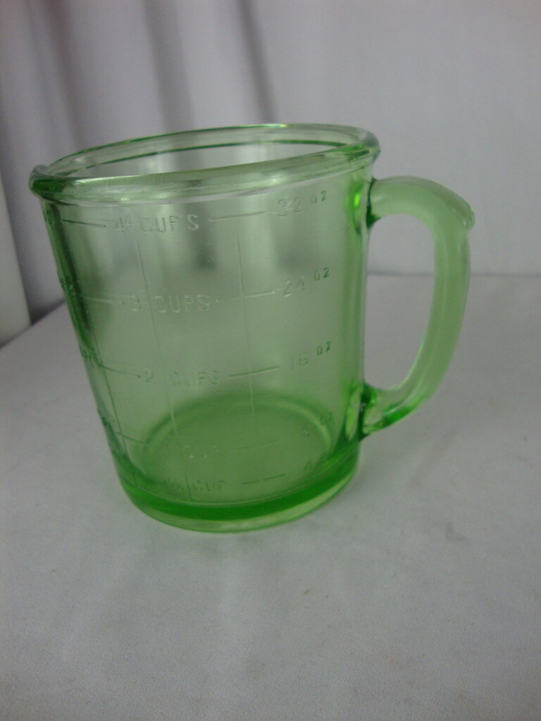 Vintage adorable Hazel Atlas vaseline uranium glass large 4 cup measuring baking cup with cup markings and back handle. Cup has wear/tear, glass defects and measures about 5" height by 5" top diameter by 6 1/2" total width. If you choose to arrange to have an item shipped please make sure to insure the shipment as we are not responsible for damage that occurs in shipping. All items are sold “As Is” and all sales are final. Most pieces are one of a kind and can not be replaced. We will give you as much information as possible regarding the pieces condition including supplying additional pictures if needed. Due to the nature of antique and vintage items there may be blemishes, nicks or other imperfections as expected with age and use. If you want more information about an item, such as additional images or condition, please inquire! All items are located in our store at Standpipe Antiques, 502 O Neal Street, Belton, SC, 29627. Our hours are Wednesday through Saturday 10am to 5pm and Sundays 12-5pm so come by and see us!