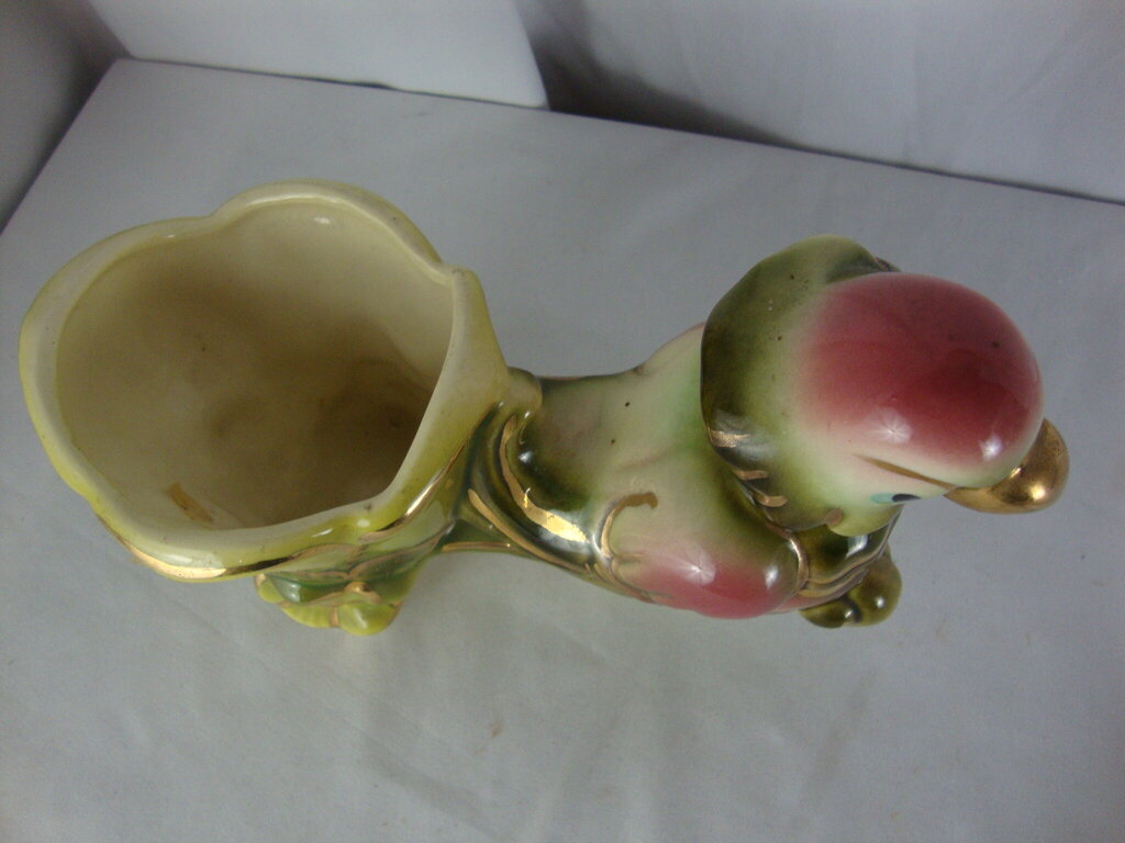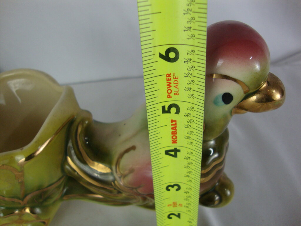 Vintage adorable Hull USA ceramic pink green gold parrot pulling a charming flower cart for planting a small plant or decor. Planter has wear/tear, finish loss, stains and measures about 6" head height by 8" length by 4" planter width. If you choose to arrange to have an item shipped please make sure to insure the shipment as we are not responsible for damage that occurs in shipping. All items are sold “As Is” and all sales are final. Most pieces are one of a kind and can not be replaced. We will give you as much information as possible regarding the pieces condition including supplying additional pictures if needed. Due to the nature of antique and vintage items there may be blemishes, nicks or other imperfections as expected with age and use. If you want more information about an item, such as additional images or condition, please inquire! All items are located in our store at Standpipe Antiques, 502 O Neal Street, Belton, SC, 29627. Our hours are Wednesday through Saturday 10am to 5pm and Sundays 12-5pm so come by and see us!