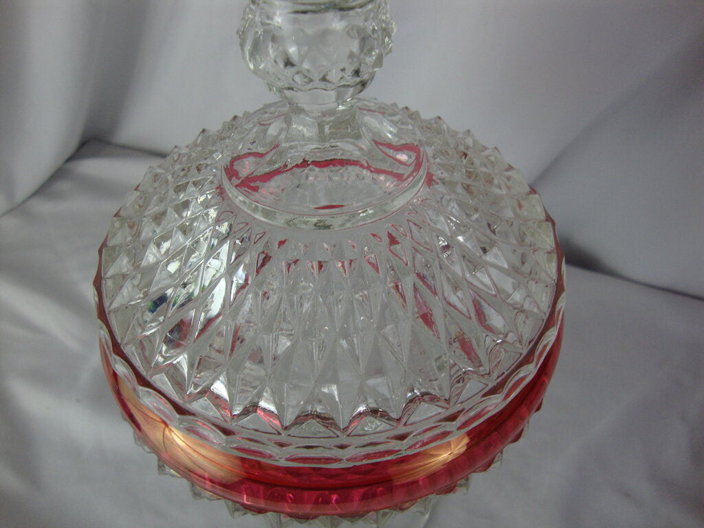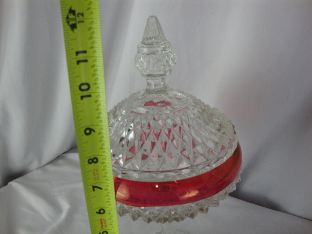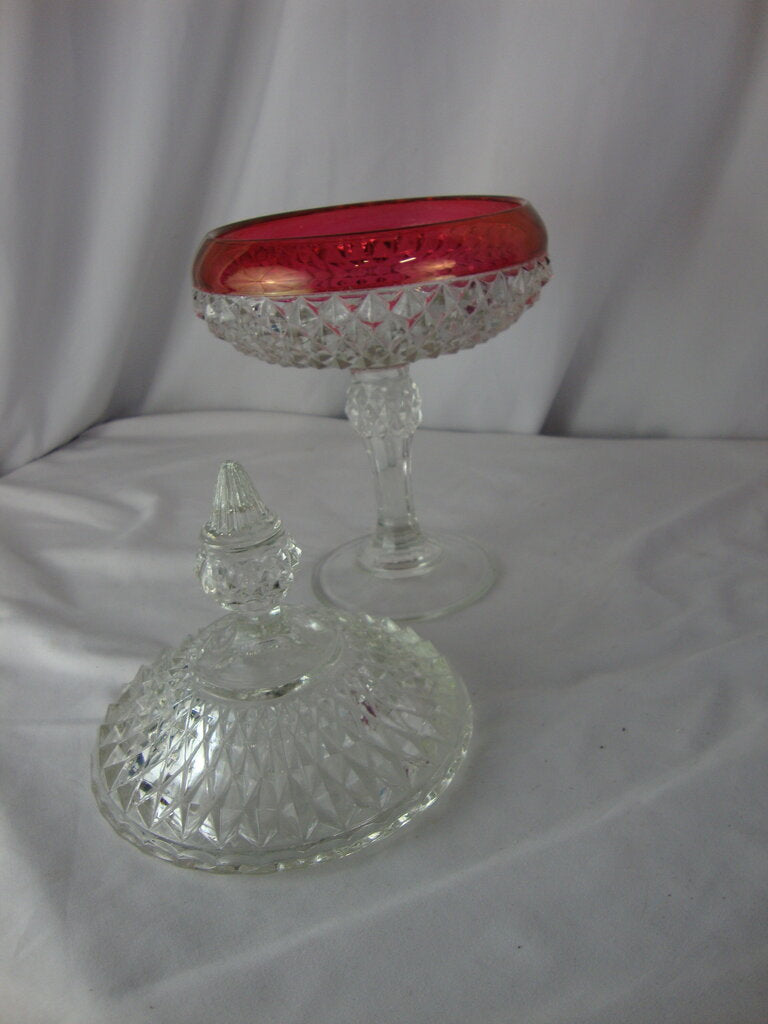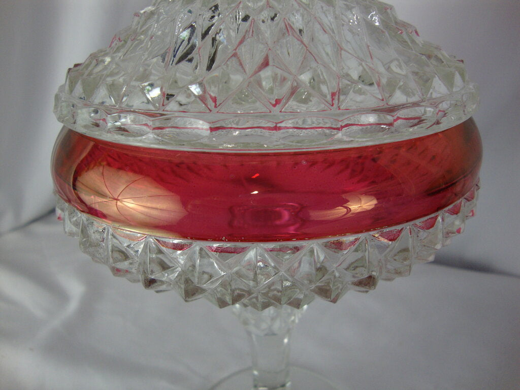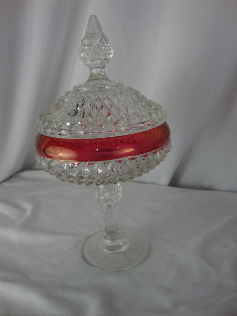 Vintage charming Indiana Glass Ruby Flash Kings Crown tall pedestal candy dish with clear glass round base with diamond point bowl with ruby flash stripe and clear diamond point lid. Dish has wear/tear, finish losson ruby area and measures about 7" base and 10 1/2" top height by 3 1/2" base and 5 1/2" body diameters. If you choose to arrange to have an item shipped please make sure to insure the shipment as we are not responsible for damage that occurs in shipping. All items are sold “As Is” and all sales are final. Most pieces are one of a kind and can not be replaced. We will give you as much information as possible regarding the pieces condition including supplying additional pictures if needed. Due to the nature of antique and vintage items there may be blemishes, nicks or other imperfections as expected with age and use. If you want more information about an item, such as additional images or condition, please inquire! All items are located in our store at Standpipe Antiques, 502 O Neal Street, Belton, SC, 29627. Our hours are Wednesday through Saturday 10am to 5pm and Sundays 12-5pm. Come by and see us!