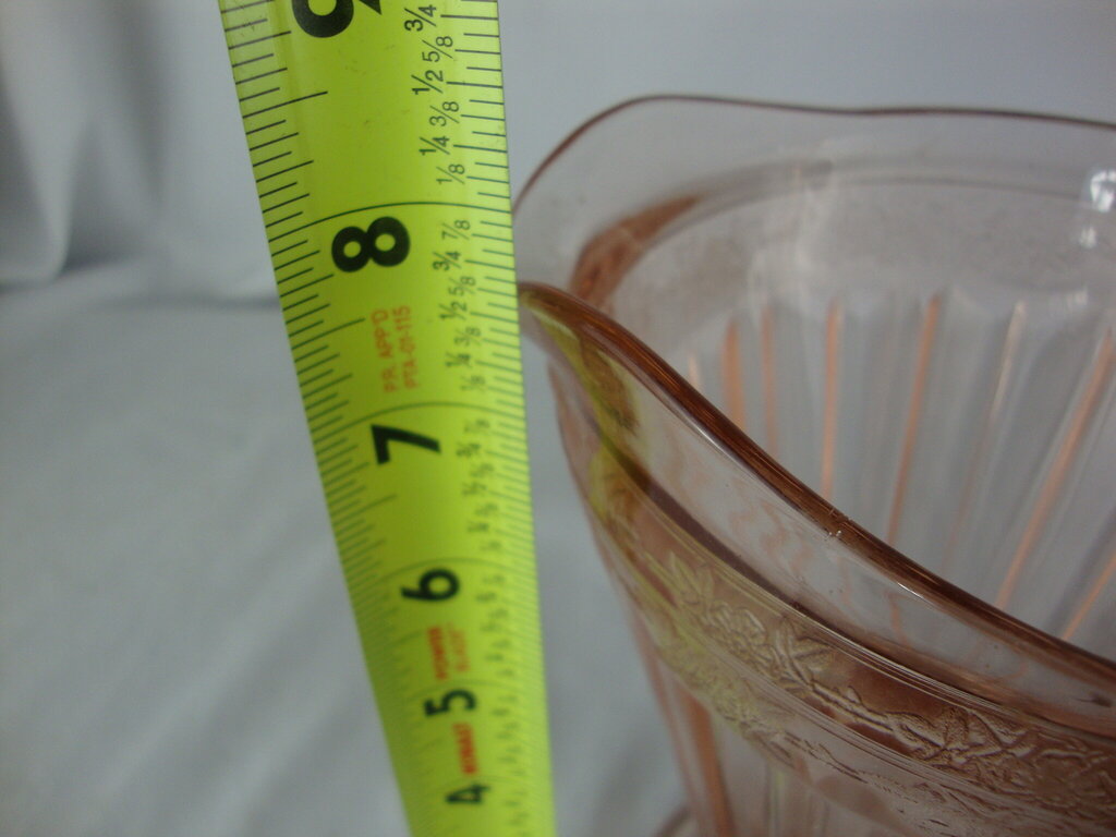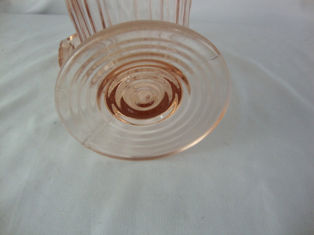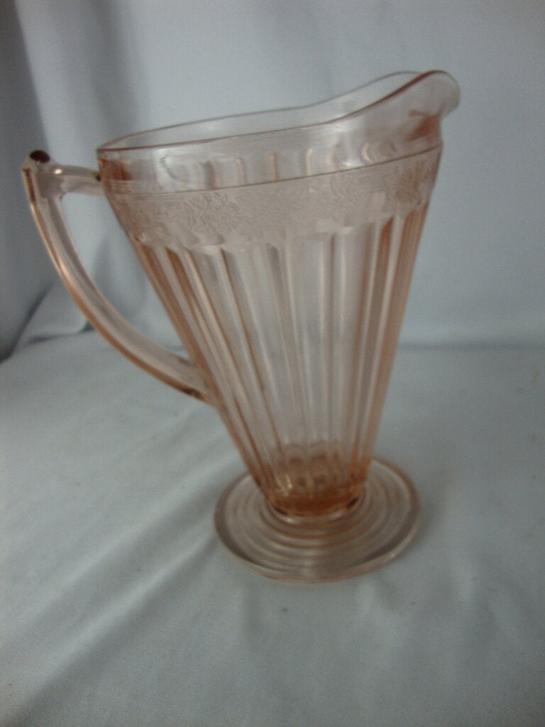 Vintage charming Jeanette Glass Adam pattern pink depression glass beverage pitcher with round ribbed base with flared body with vertical ribbing and top flower edge with angular handle and front spout. Pitcher has wear/tear, production flaws and measures about 7 1/2" height by 5" top open diameter by 7" total width by 3 3/4" base diameter. If you choose to arrange to have an item shipped please make sure to insure the shipment as we are not responsible for damage that occurs in shipping. All items are sold “As Is” and all sales are final. Most pieces are one of a kind and can not be replaced. We will give you as much information as possible regarding the pieces condition including supplying additional pictures if needed. Due to the nature of antique and vintage items there may be blemishes, nicks or other imperfections as expected with age and use. If you want more information about an item, such as additional images or condition, please inquire! All items are located in our store at Standpipe Antiques, 502 O Neal Street, Belton, SC, 29627. Our hours are Wednesday through Saturday 10am to 5pm, and Sundays 12-5pm. Come by and see us!