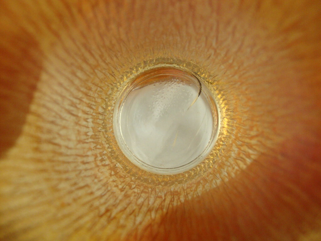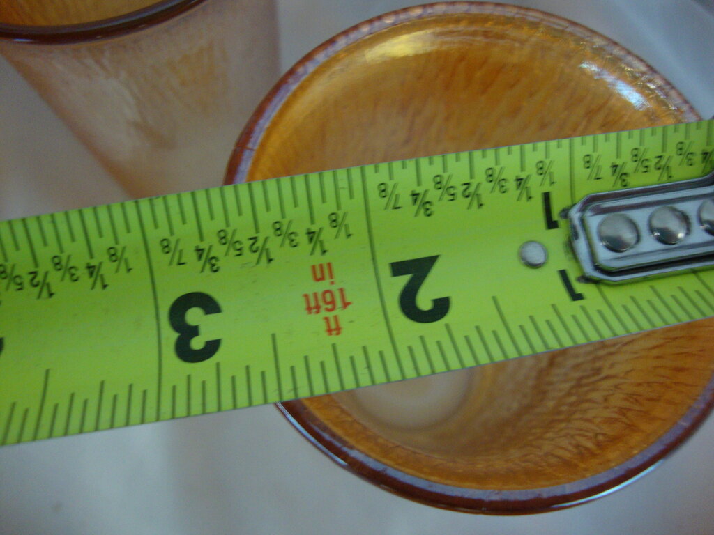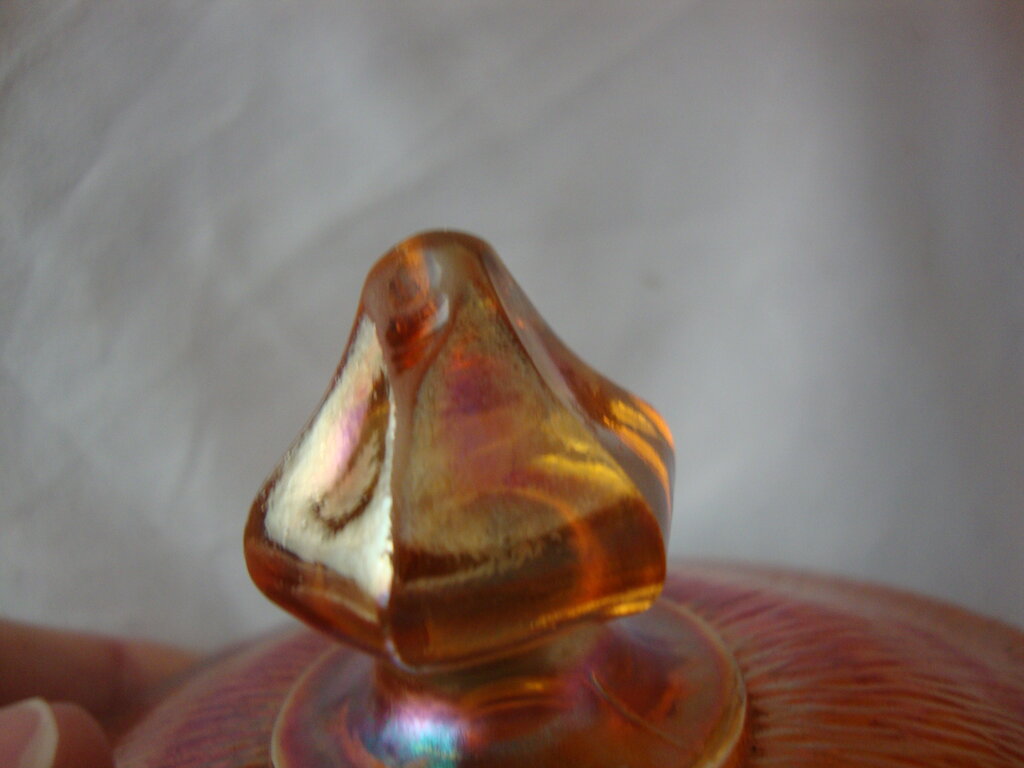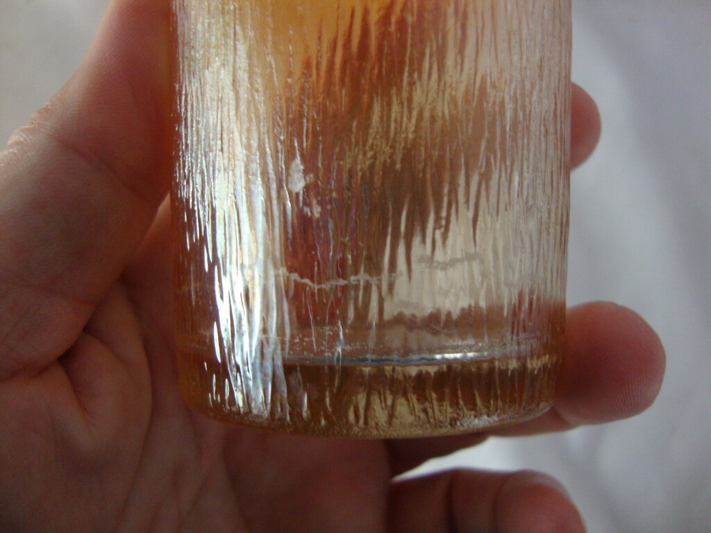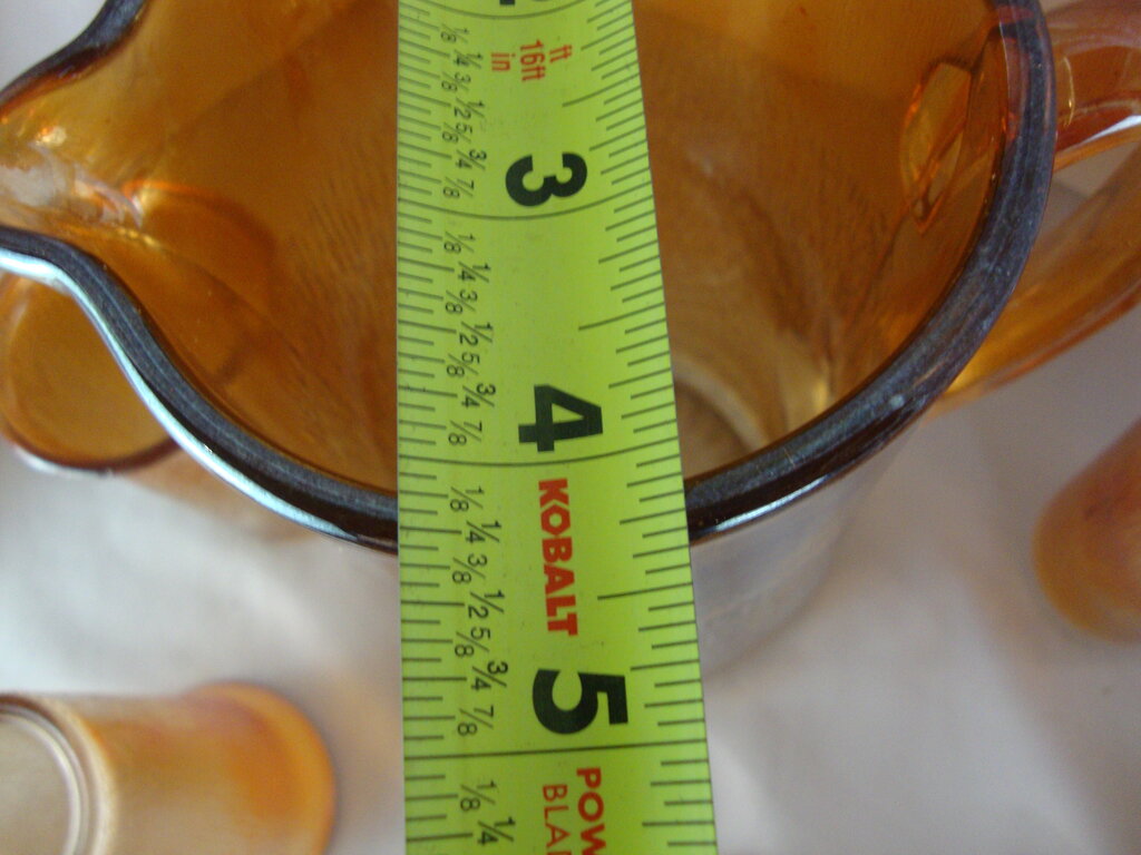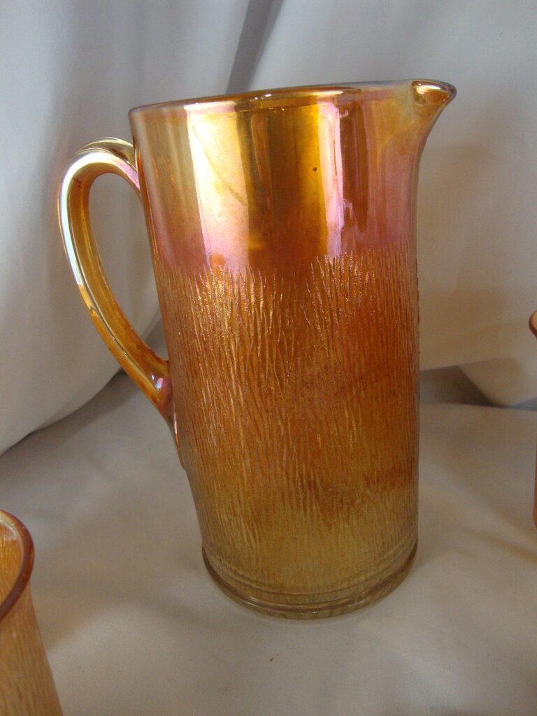 Gorgeous vintage Jeanette Glass marigold carnival beverage set with Treebark pattern glass and tall cylinder pitcher with loop handle and lid (lid handle damaged) and eight short tumbler glasses. Set has wear/tear, stains, pitcher lid handle has chipped facet, bottom of one glass has several glass/bubbles wrinkles per photo and pitcher is 8 1/2" height by 4" top diameter and 7" total top width and glasses are 4 1/2" height by 2 1/2" top diameter. If you choose to arrange to have an item shipped please make sure to insure the shipment as we are not responsible for damage that occurs in shipping. All items are sold “As Is” and all sales are final. Most pieces are one of a kind and can not be replaced. We will give you as much information as possible regarding the pieces condition including supplying additional pictures if needed. Due to the nature of antique and vintage items there may be blemishes, nicks or other imperfections as expected with age and use. If you want more information about an item, such as additional images or condition, please inquire! All items are located in our store at Standpipe Antiques, 502 O Neal Street, Belton, SC, 29627. Our hours are Wednesday through Friday 10am to 6pm, Saturday 10am to 5pm and Sundays 12-5pm so come by and see us!