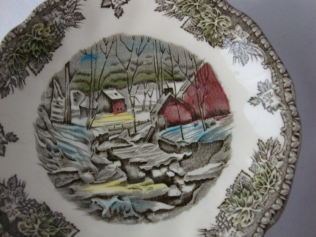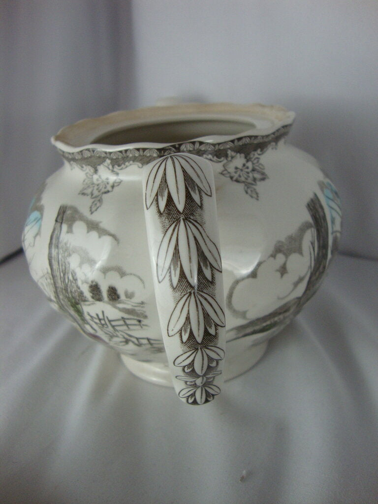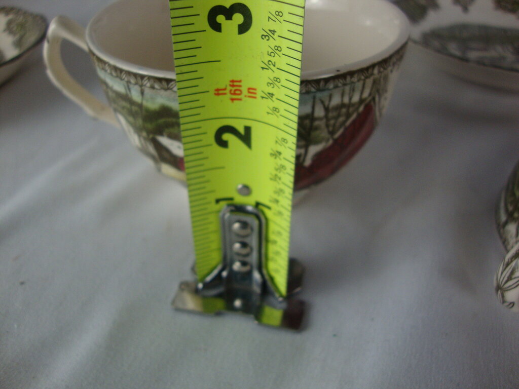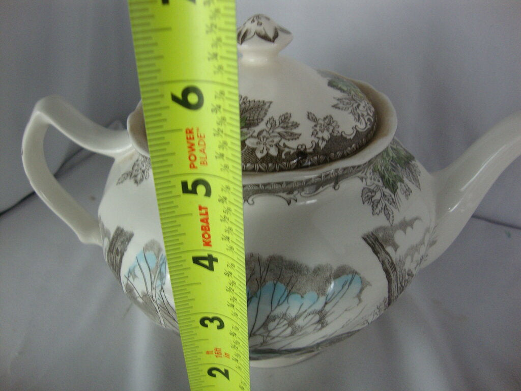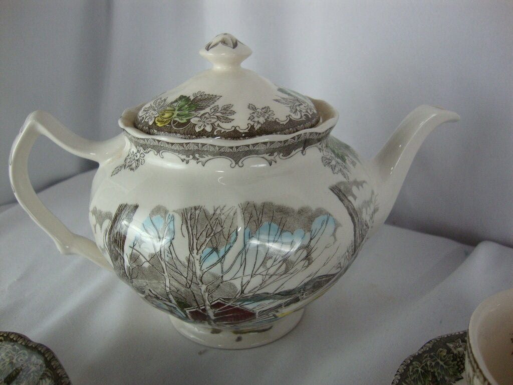 Vintage adorable Johnson Bros Friendly Village pattern tea set with teapot with lid and (2) teacups with (2) saucers. Set has wear/tear and teapot is about 5" body height by 9" total width by 3 1/2" top opening diameter, saucers are 5 1/2" top diameter and teacups are 2 1/4" height by 3 1/2" top diameter. If you choose to arrange to have an item shipped please make sure to insure the shipment as we are not responsible for damage that occurs in shipping. All items are sold “As Is” and all sales are final. Most pieces are one of a kind and can not be replaced. We will give you as much information as possible regarding the pieces condition including supplying additional pictures if needed. Due to the nature of antique and vintage items there may be blemishes, nicks or other imperfections as expected with age and use. If you want more information about an item, such as additional images or condition, please inquire! All items are located in our store at Standpipe Antiques, 502 O Neal Street, Belton, SC, 29627. Our hours are Wednesday through Friday 10am to 6pm, Saturday 10am to 5pm and Sundays 12-5pm. Come by and see us!