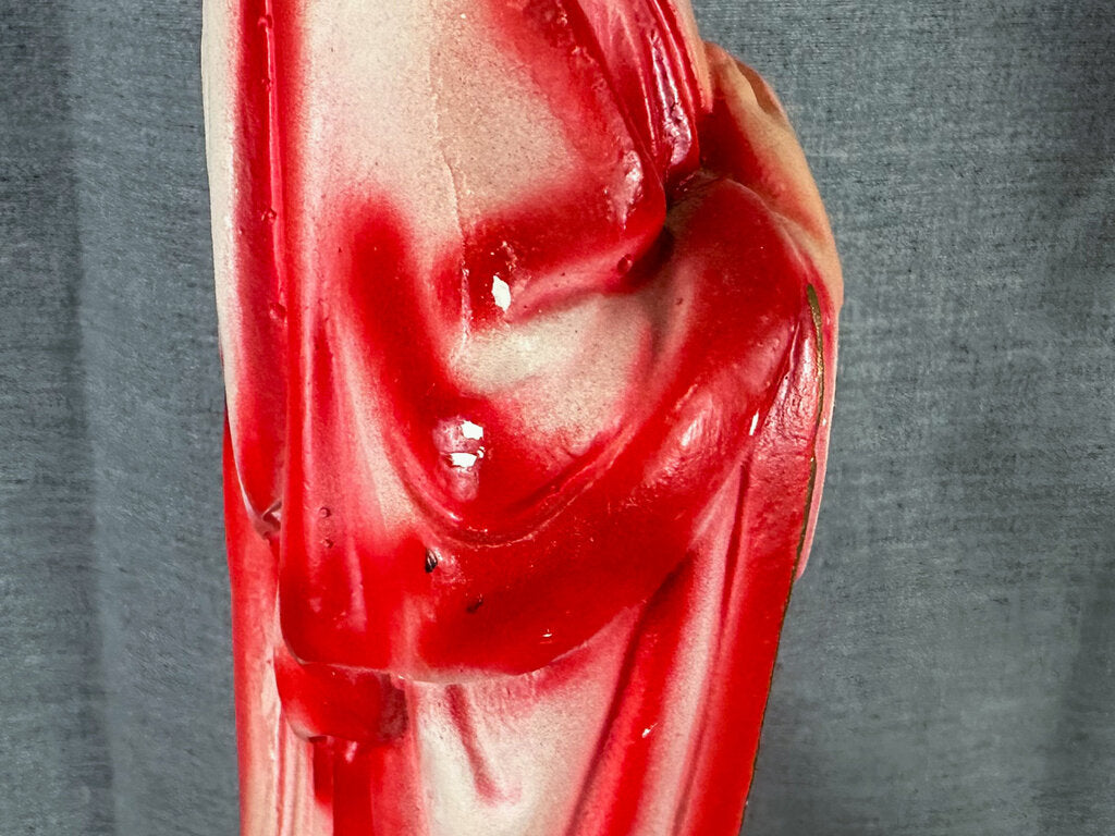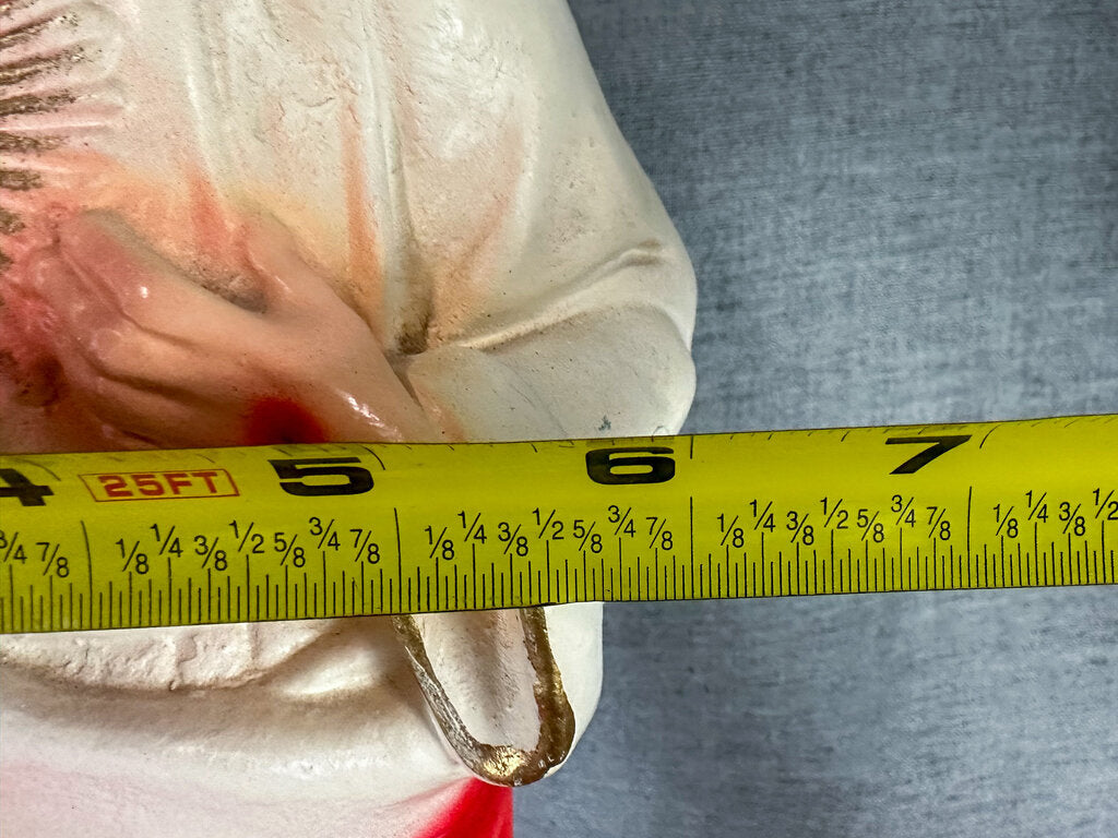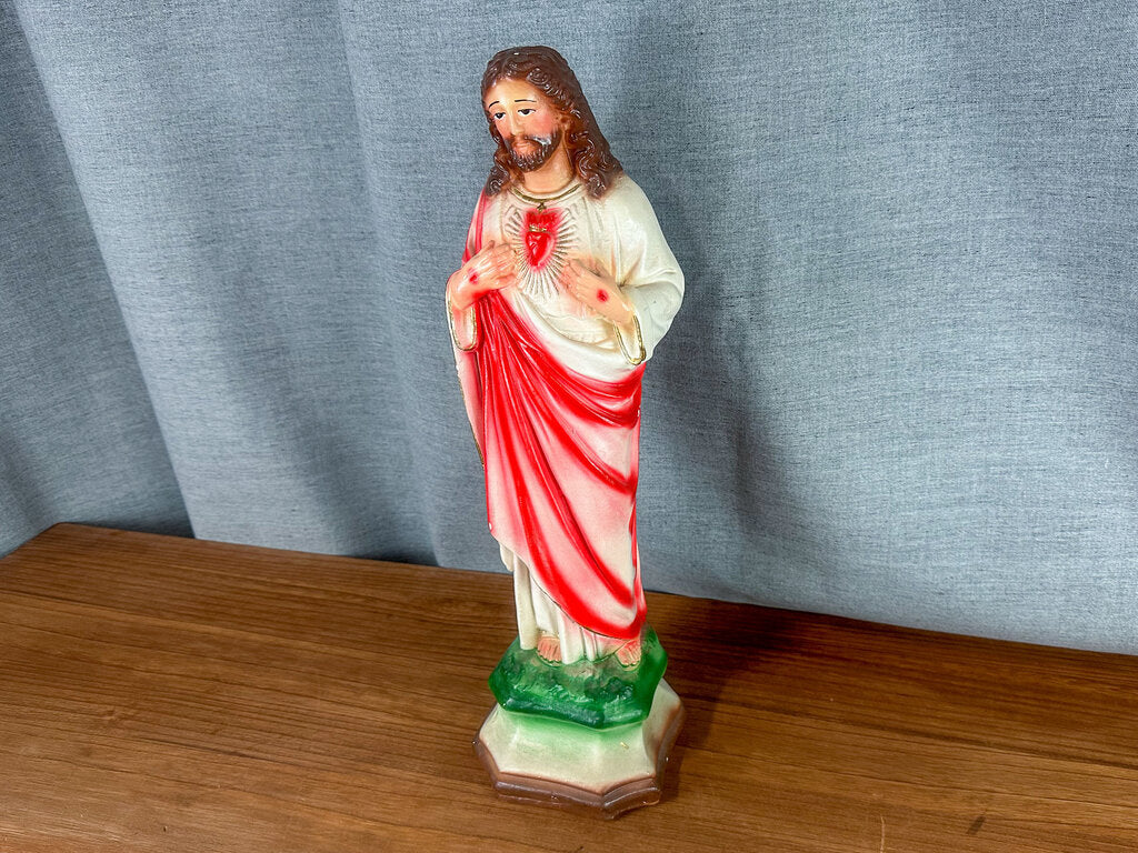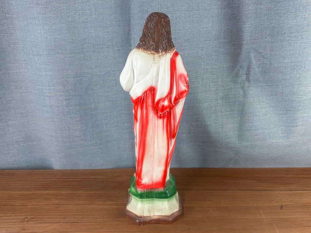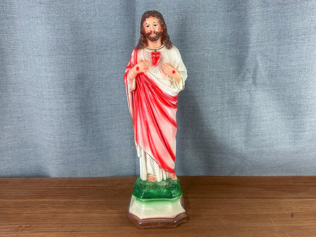 Made is Mexico. "Hecho En Mexico" written on side. A vintage Jesus statue. Shows the Christian messiah with wounded hands from his crucifixion and the sacred heart emblazoned on his chest. Looks like it was painted by hand using airbrush and regular brush. Places where paint bled from nature of airbrushing. Some chips in various places. There's a spec of gold paint on the base that's out of place. Bottom is uneven so he does wobble a bit, but sits nicely if left alone.