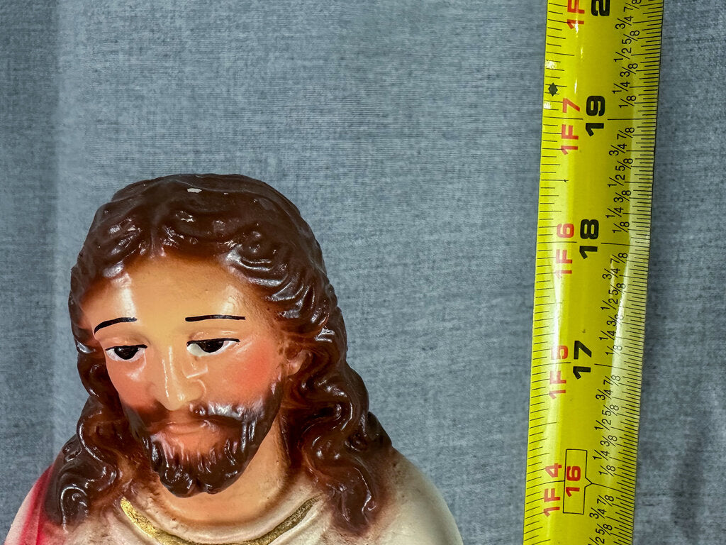 Made is Mexico. "Hecho En Mexico" written on side. A vintage Jesus statue. Shows the Christian messiah with wounded hands from his crucifixion and the sacred heart emblazoned on his chest. Looks like it was painted by hand using airbrush and regular brush. Places where paint bled from nature of airbrushing. Some chips in various places. There's a spec of gold paint on the base that's out of place. Bottom is uneven so he does wobble a bit, but sits nicely if left alone.