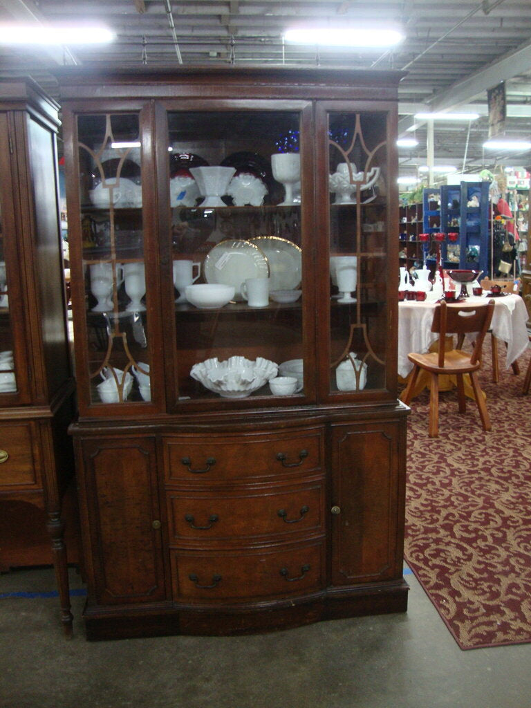 *THIS ITEM IS FOR PICKUP ONLY!* Vintage charming mahogany one piece china hutch display cabinet with two middle drawers and two side hinged doors with top middle glass door with fretwork sides with brass gallery rail top. Cabinet has wear/tear, scratches, dings, finish loss, and measures about 72" rail height by 15" depth by 42" width. If you choose to arrange to have an item shipped please make sure to insure the shipment as we are not responsible for damage that occurs in shipping. All items are sold “As Is” and all sales are final. Most pieces are one of a kind and can not be replaced. We will give you as much information as possible regarding the pieces condition including supplying additional pictures if needed. Due to the nature of antique and vintage items there may be blemishes, nicks or other imperfections as expected with age and use. If you want more information about an item, such as additional images or condition, please inquire! All items are located in our store at Standpipe Antiques, 502 O Neal Street, Belton, SC, 29627. Our hours are Wednesday through Saturday 10am to 5pm and Sundays 12-5pm. Come by and see us!