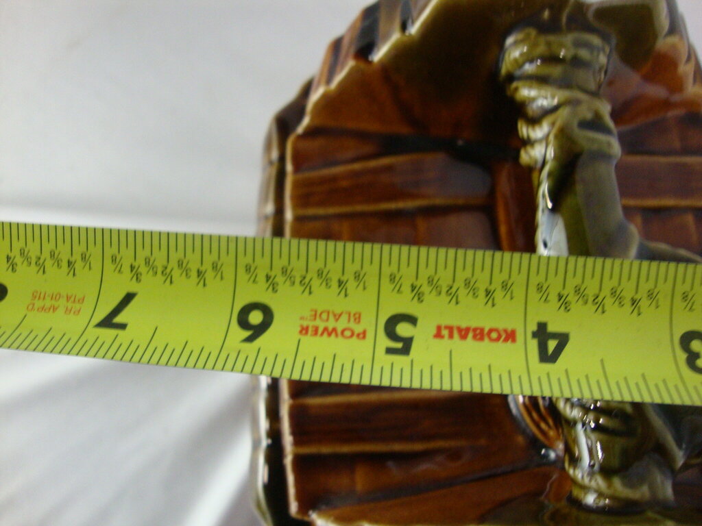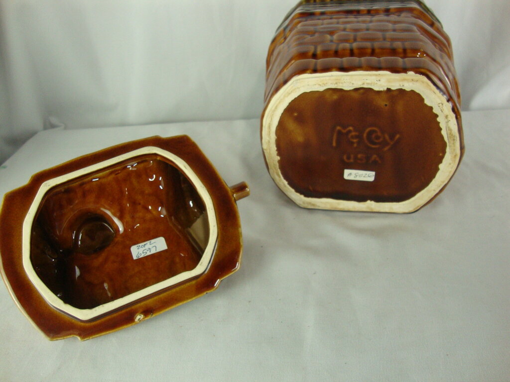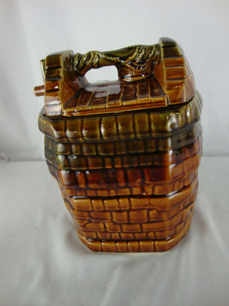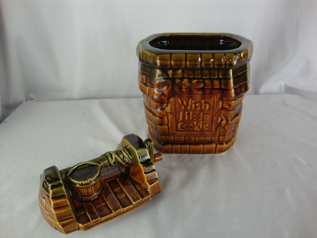 Vintage adorable McCoy USA wishing well ceramic cookie jar with brown wood look exterior with Wish I Had A Cookie in front square with lid with bucket and hand crank. Jar has wear/tear, flaws and measures about 7" body and 9" lid height by 7" width by 5 1/2" depth. If you choose to arrange to have an item shipped please make sure to insure the shipment as we are not responsible for damage that occurs in shipping. All items are sold “As Is” and all sales are final. Most pieces are one of a kind and can not be replaced. We will give you as much information as possible regarding the pieces condition including supplying additional pictures if needed. Due to the nature of antique and vintage items there may be blemishes, nicks or other imperfections as expected with age and use. If you want more information about an item, such as additional images or condition, please inquire! All items are located in our store at Standpipe Antiques, 502 O Neal Street, Belton, SC, 29627. Our hours are Wednesday through Saturday 10am to 5pm, Sundays 12-5pm. Come by and see us!