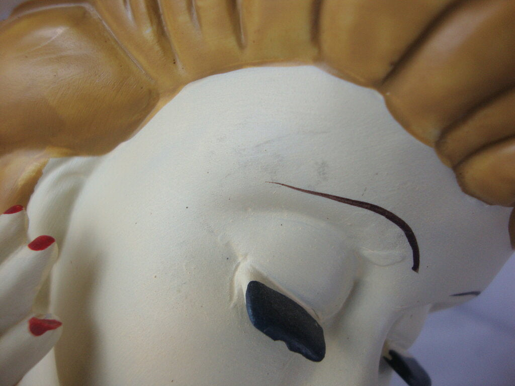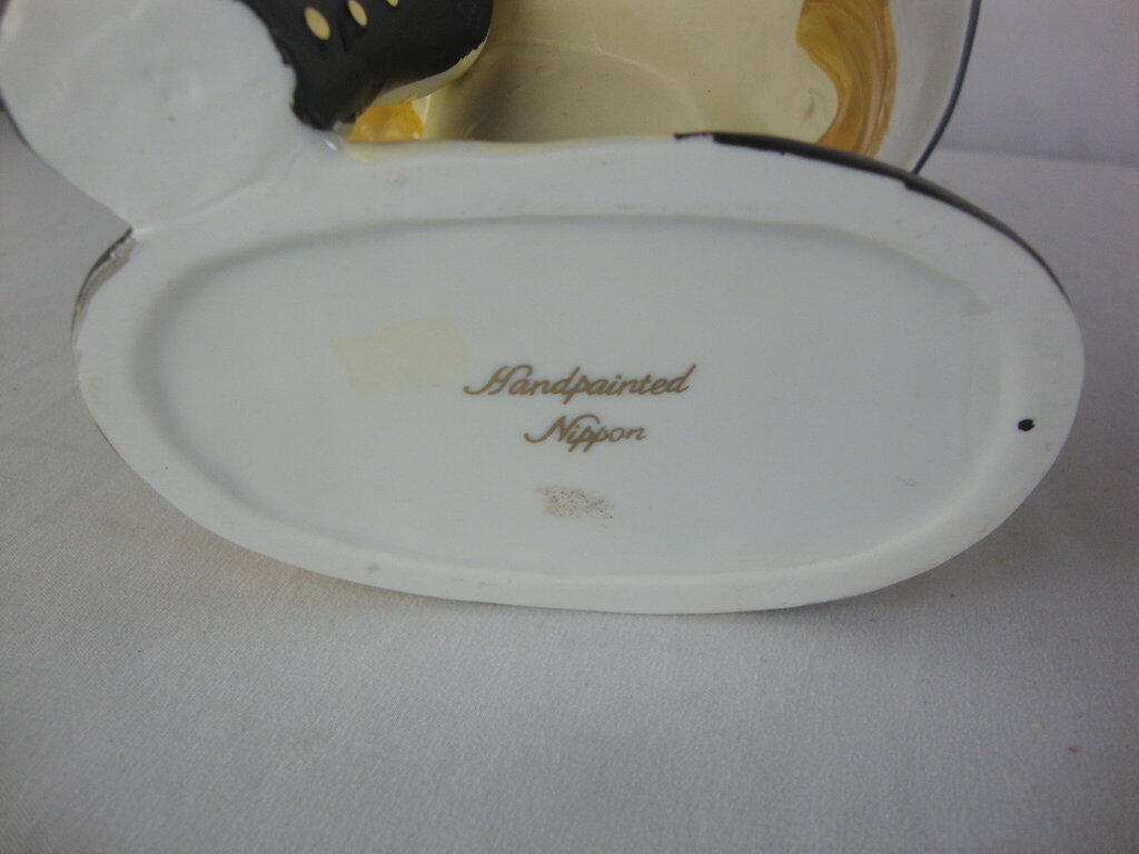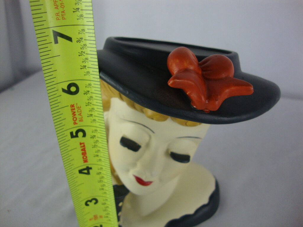 Vintage Nippon handpainted woman head vase with dark blonde hair with black hat with red bow and black sleeve on arm. Vase has wear/tear, small chip at eyelash, last finger has either chip or flaw?, surface small stains and measures about 6 1/2" height by 5" hat diameter by 5" base width by 2 1/2" base depth. If you choose to arrange to have an item shipped please make sure to insure the shipment as we are not responsible for damage that occurs in shipping. All items are sold “As Is” and all sales are final. Most pieces are one of a kind and can not be replaced. We will give you as much information as possible regarding the pieces condition including supplying additional pictures if needed. Due to the nature of antique and vintage items there may be blemishes, nicks or other imperfections as expected with age and use. If you want more information about an item, such as additional images or condition, please inquire! All items are located in our store at Standpipe Antiques, 502 O Neal Street, Belton, SC, 29627. Our hours are Wednesday through Saturday 10am to 5pm, Sundays 12-5pm. Come by and see us!
