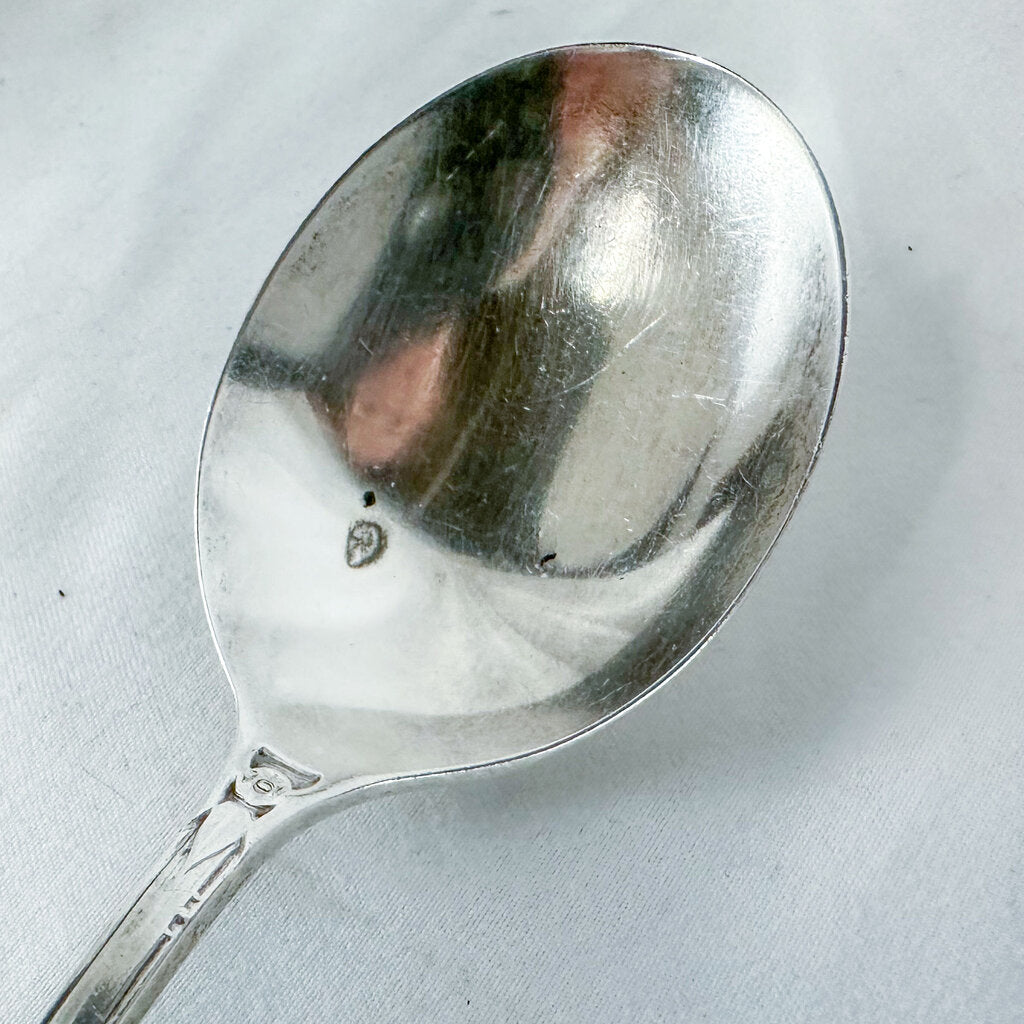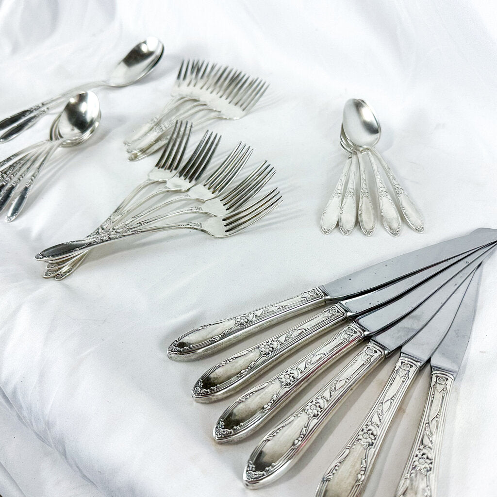A vintage Heirloom Sterling Silver flatware set from Oneida Silver in the pattern "Virginia." Overall the set is in good condition. Some toning on various pieces. Glossy finish is relatively in tact. Some pieces have dark spots (spoon pictured for example).