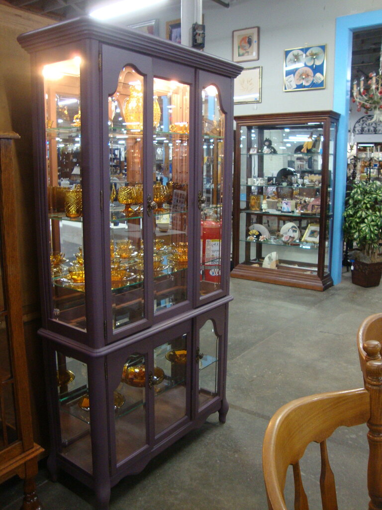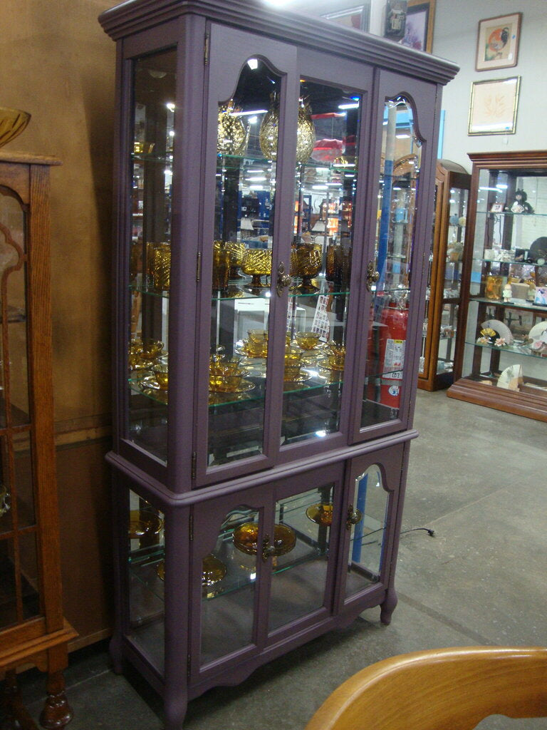 *THIS ITEM IS FOR PICKUP ONLY!* Gorgeous vintage oak cabinet reimagined with modern plum chalk paint with beveled glass side top/bottom doors with fixed middle panels and multiple glass shelves with lighted interior. Cabinet measures about 74" height by 35" width by 15" depth. If you choose to arrange to have an item shipped please make sure to insure the shipment as we are not responsible for damage that occurs in shipping. All items are sold “As Is” and all sales are final. Most pieces are one of a kind and can not be replaced. We will give you as much information as possible regarding the pieces condition including supplying additional pictures if needed. Due to the nature of antique and vintage items there may be blemishes, nicks or other imperfections as expected with age and use. If you want more information about an item, such as additional images or condition, please inquire! All items are located in our store at Standpipe Antiques, 502 O Neal Street, Belton, SC, 29627. Our hours are Wednesday through Saturday 10am to 5pm, Sundays 12-5pm. Come by and see us!