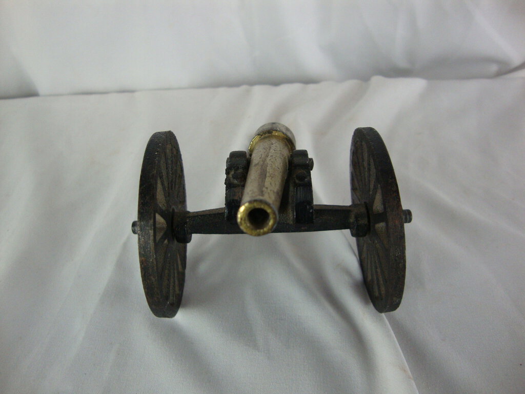 Fun Penn Craft USA cast iron and brass wheeled toy cannon with two wheeled holder with front hitch circle and brass hinged cannon. Toy has wear/tear, tarnish, rust, scratches, stains and measures about 3" back height by 6" total length by 3" wheel width. If you choose to arrange to have an item shipped please make sure to insure the shipment as we are not responsible for damage that occurs in shipping. All items are sold “As Is” and all sales are final. Most pieces are one of a kind and can not be replaced. We will give you as much information as possible regarding the pieces condition including supplying additional pictures if needed. Due to the nature of antique and vintage items there may be blemishes, nicks or other imperfections as expected with age and use. If you want more information about an item, such as additional images or condition, please inquire! All items are located in our store at Standpipe Antiques, 502 O Neal Street, Belton, SC, 29627. Our hours are Wednesday through Friday 10am to 6pm, Saturday 10am to 5pm and Sundays 12-5pm. Come by and see us!