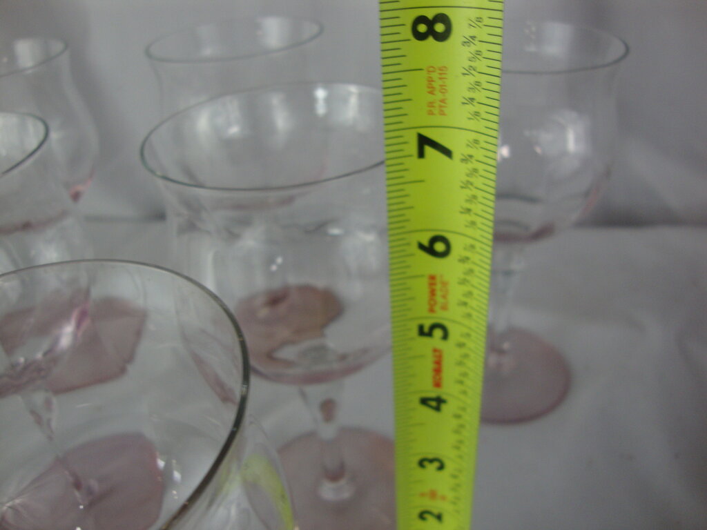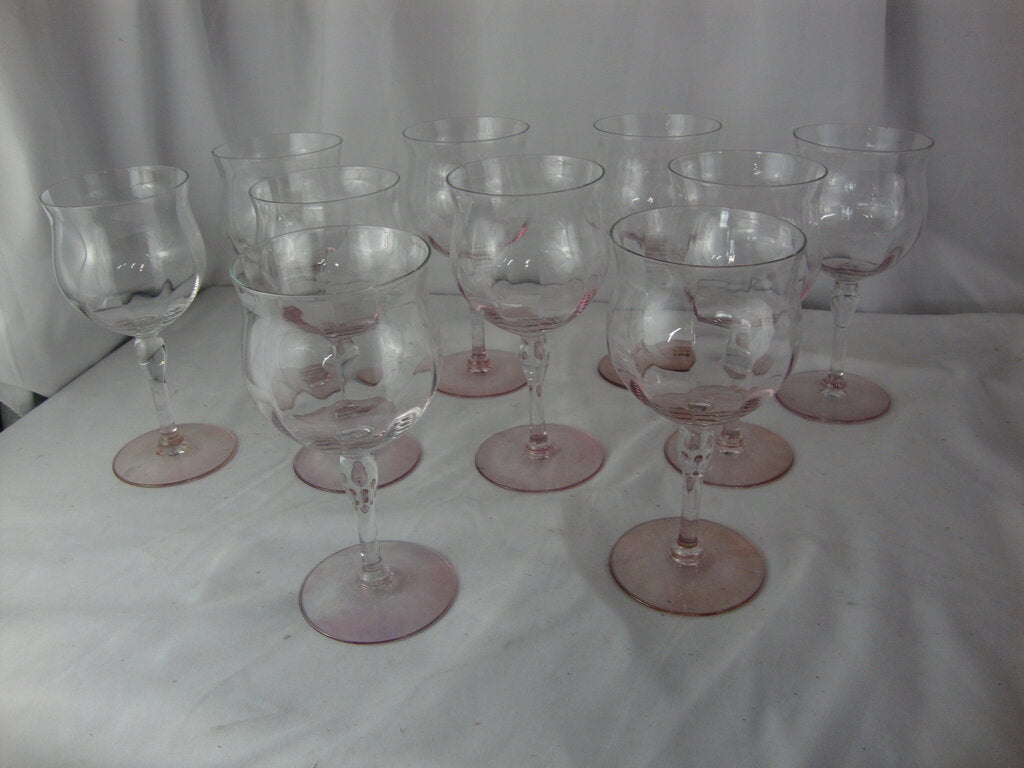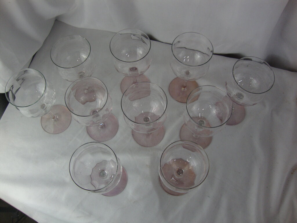 Vintage charming pink base clear top crystal water goblets set of 10 with delicate rose pink round base with flared clear cups. Glasses have wear/tear, pink finish is not consistent color on some bases per photos and goblets are 2 1/2" base diameter by 6 1/2" height by 3" top diameter. If you choose to arrange to have an item shipped please make sure to insure the shipment as we are not responsible for damage that occurs in shipping. All items are sold “As Is” and all sales are final. Most pieces are one of a kind and can not be replaced. We will give you as much information as possible regarding the pieces condition including supplying additional pictures if needed. Due to the nature of antique and vintage items there may be blemishes, nicks or other imperfections as expected with age and use. If you want more information about an item, such as additional images or condition, please inquire! All items are located in our store at Standpipe Antiques, 502 O Neal Street, Belton, SC, 29627. Our hours are Wednesday through Saturday 10am to 5pm and Sundays 12-5pm so come by and see us!