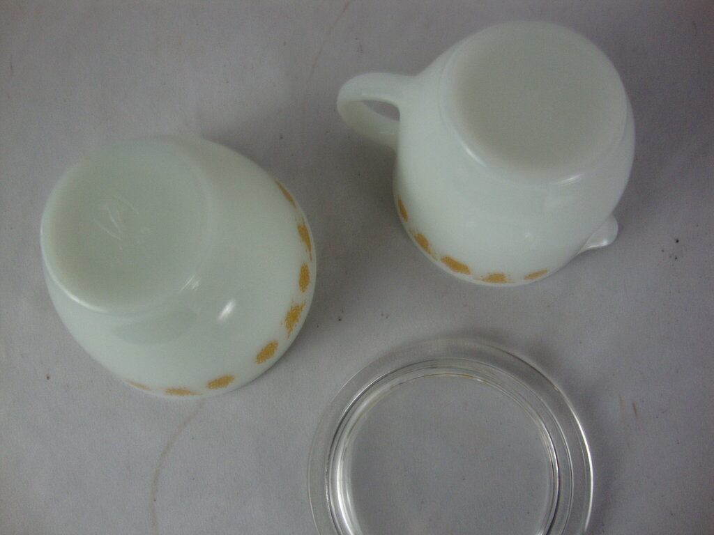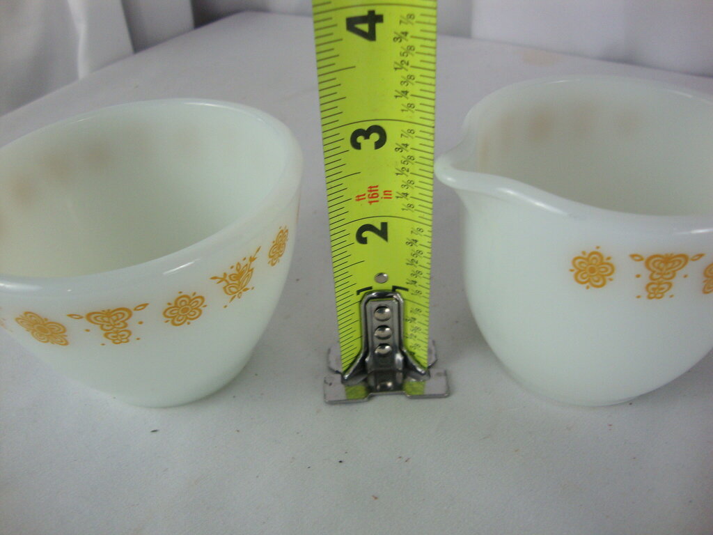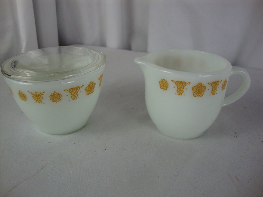 Vintage Pyrex Butterfly Gold pattern table creamer and sugar bowl with lid matching set. Set has minimal wear/tear and measure about 2 1/2" height by 3" top diameters. If you choose to arrange to have an item shipped please make sure to insure the shipment as we are not responsible for damage that occurs in shipping. All items are sold “As Is” and all sales are final. Most pieces are one of a kind and can not be replaced. We will give you as much information as possible regarding the pieces condition including supplying additional pictures if needed. Due to the nature of antique and vintage items there may be blemishes, nicks or other imperfections as expected with age and use. If you want more information about an item, such as additional images or condition, please inquire! All items are located in our store at Standpipe Antiques, 502 O Neal Street, Belton, SC, 29627. Our hours are Wednesday through Saturday 10am to 5pm and Sundays 12-5pm. Come by and see us!