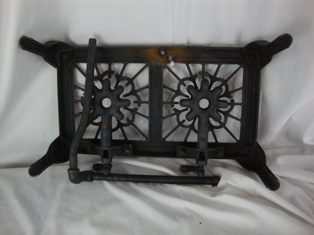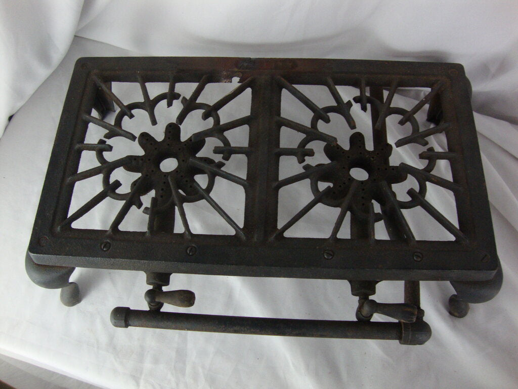 Vintage to antique Quality Newark OH cast iron double gas burner with curvy legs with front bar with two handles for on/off gas. Stove top is untested, has been broken/repaired at top middle per photos, wear/tear, rust, scratches and measures about 6" height by 19" total width by 10 1/2" stove and 13" bar depths. If you choose to arrange to have an item shipped please make sure to insure the shipment as we are not responsible for damage that occurs in shipping. All items are sold “As Is” and all sales are final. Most pieces are one of a kind and can not be replaced. We will give you as much information as possible regarding the pieces condition including supplying additional pictures if needed. Due to the nature of antique and vintage items there may be blemishes, nicks or other imperfections as expected with age and use. If you want more information about an item, such as additional images or condition, please inquire! All items are located in our store at Standpipe Antiques, 502 O Neal Street, Belton, SC, 29627. Our hours are Wednesday through Friday 10am to 6pm, Saturday 10am to 5pm and Sundays 12-5pm. Come by and see us!