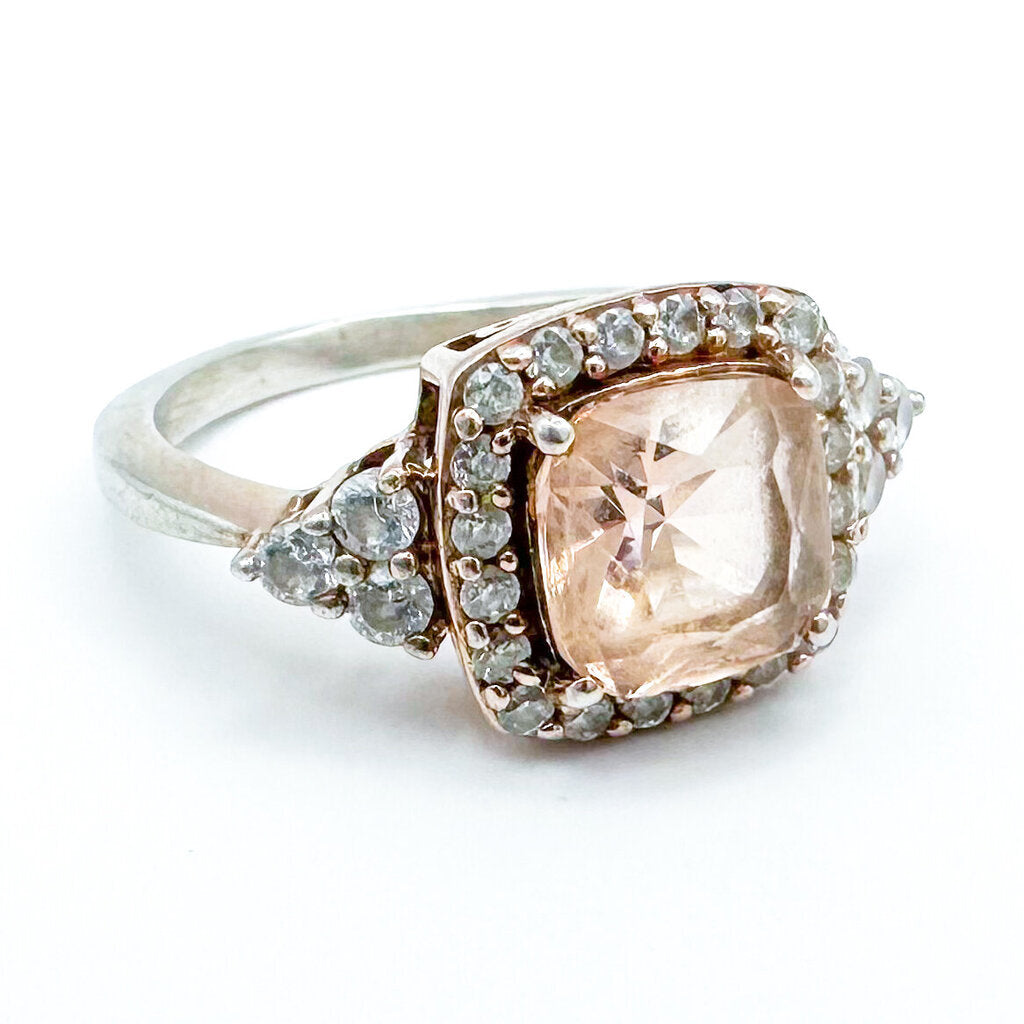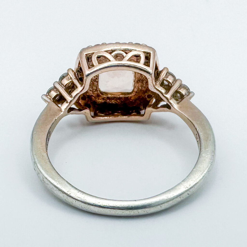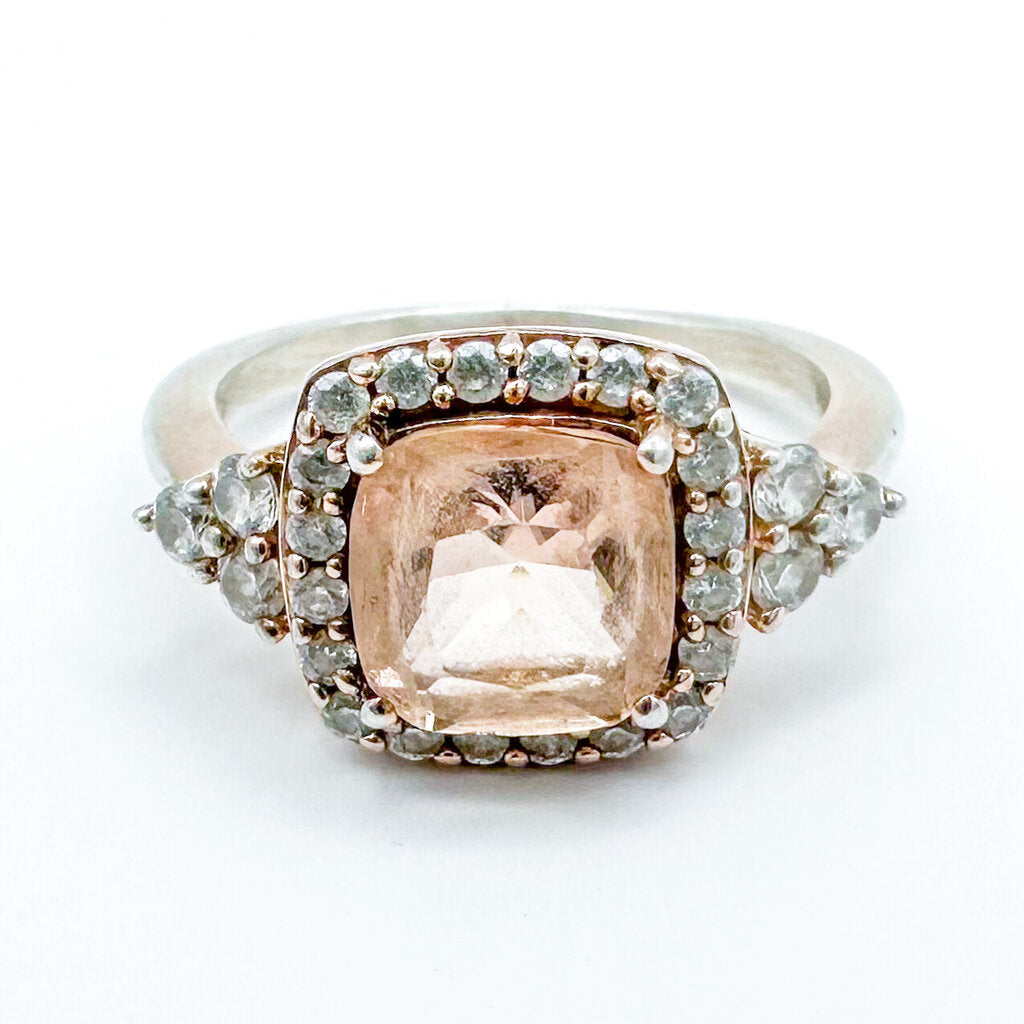 A beautiful unique ring perfect for a promise ring or engagement ring. Rose-toned Sterling Silver band with a cathedral shank and halo setting. Clear cubic zirconia makes up the halo, and the center stone is either a Champagne Cubic Zirconia or a Sunstone. Has 925, CZ, and SUN markings on inner band.