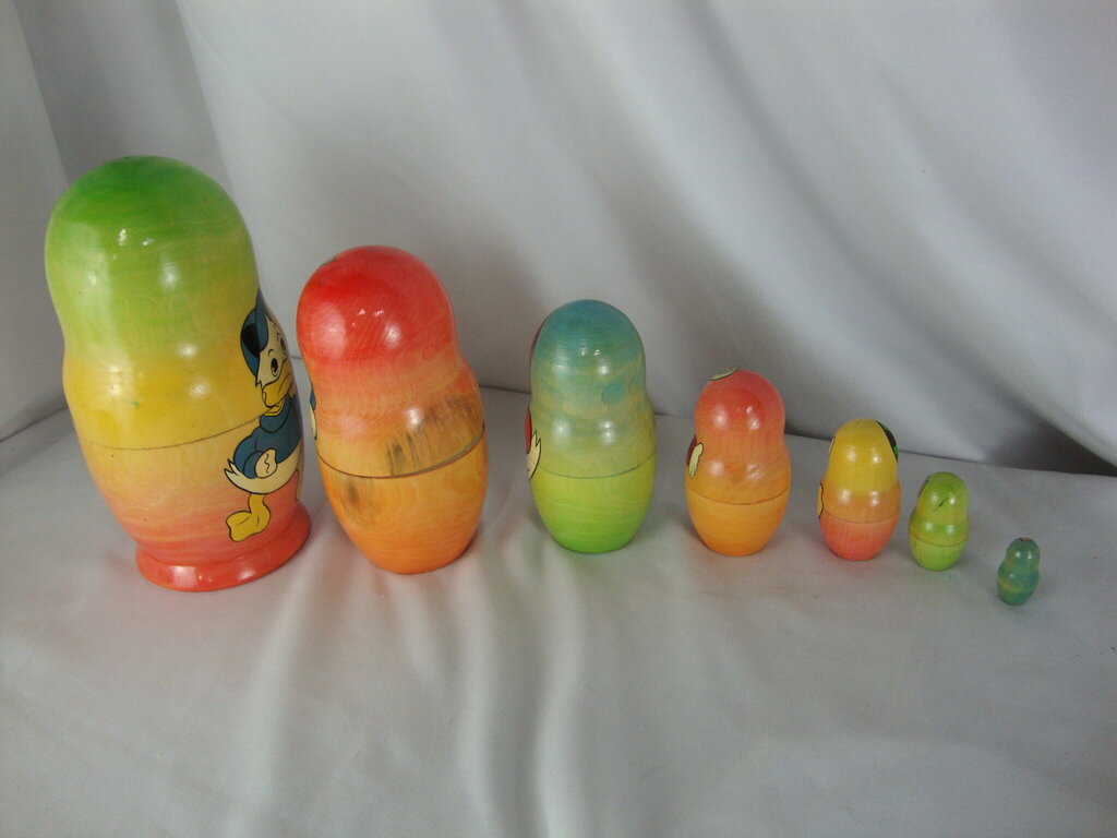 Vintage adorable Russian Matryoshka wood nesting dolls with Scrooge McDuck and family in 7 adorable dolls. Set has wear/tear and measure from 8" tallest height to 1" smallest and largest is 3 1/2" bottom diameter. If you choose to arrange to have an item shipped please make sure to insure the shipment as we are not responsible for damage that occurs in shipping. All items are sold “As Is” and all sales are final. Most pieces are one of a kind and can not be replaced. We will give you as much information as possible regarding the pieces condition including supplying additional pictures if needed. Due to the nature of antique and vintage items there may be blemishes, nicks or other imperfections as expected with age and use. If you want more information about an item, such as additional images or condition, please inquire! All items are located in our store at Standpipe Antiques, 502 O Neal Street, Belton, SC, 29627. Our hours are Wednesday through Saturday 10am to 5pm and Sundays 12-5pm. Come by and see us!