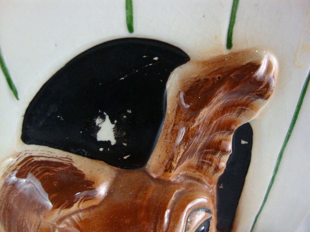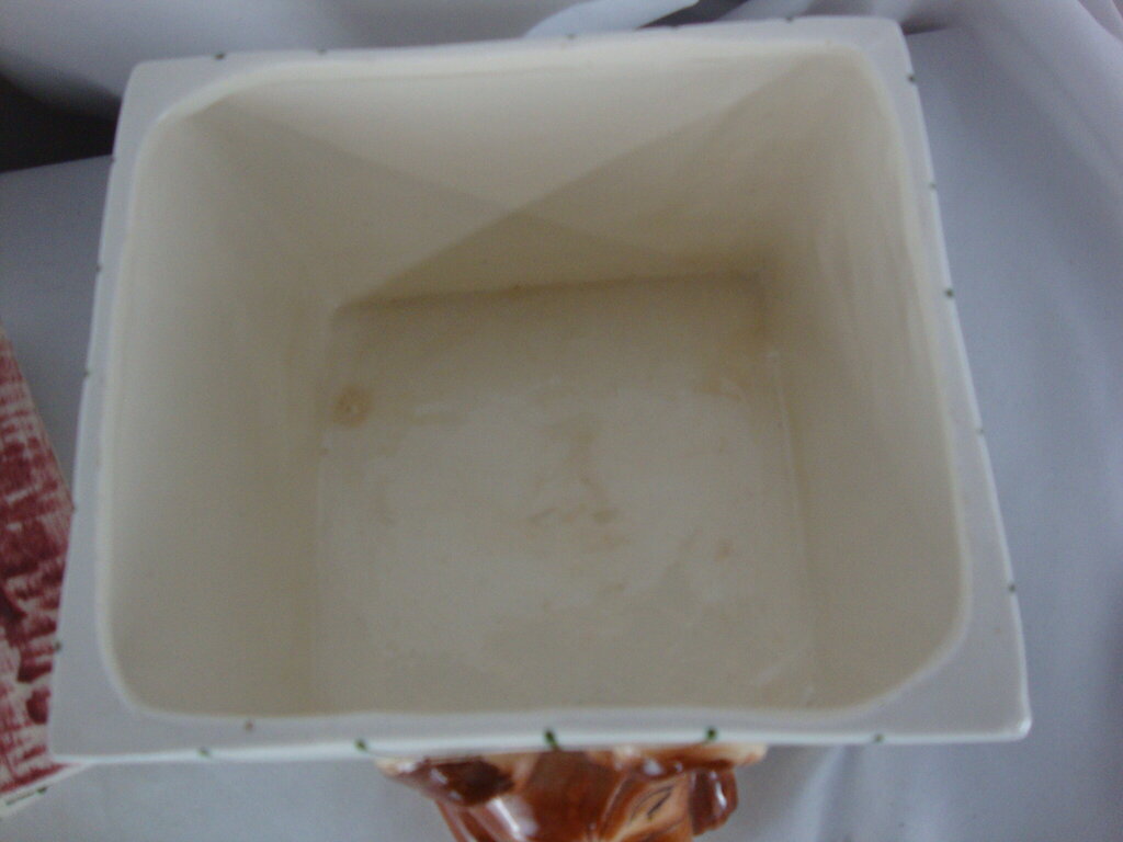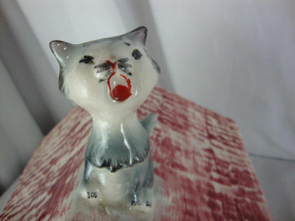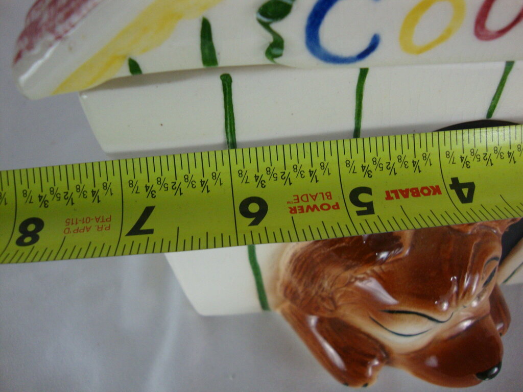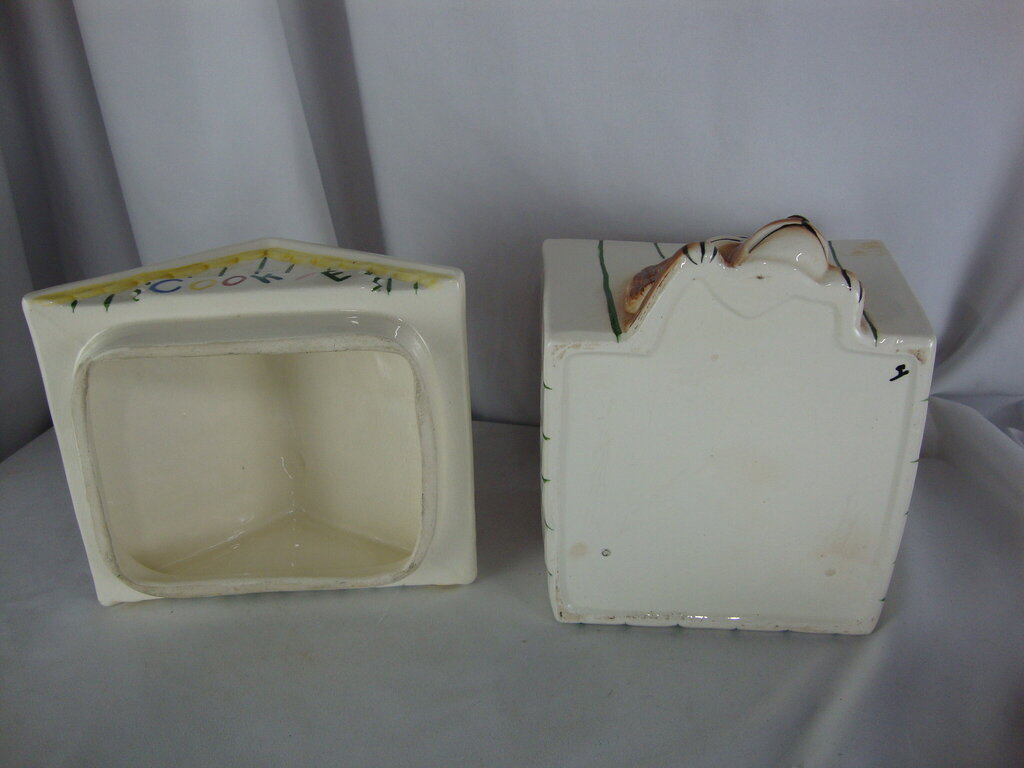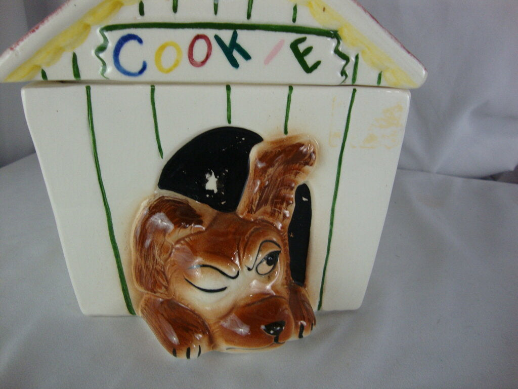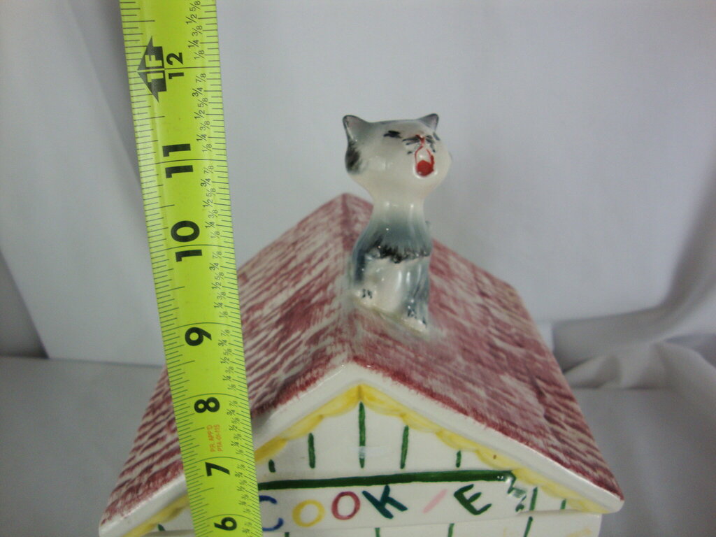 Vintage adorable Sierra Vista ceramic cookie jar with annoyed brown dog with ear up laying in their red roofed dog house with white/gray cat on top of roof making a ruckus! This adorable cookie jar has wear/tear, crazing, finish loss, flaws and measures about 11" cat height by 8" width by 7" depth. If you choose to arrange to have an item shipped please make sure to insure the shipment as we are not responsible for damage that occurs in shipping. All items are sold “As Is” and all sales are final. Most pieces are one of a kind and can not be replaced. We will give you as much information as possible regarding the pieces condition including supplying additional pictures if needed. Due to the nature of antique and vintage items there may be blemishes, nicks or other imperfections as expected with age and use. If you want more information about an item, such as additional images or condition, please inquire! All items are located in our store at Standpipe Antiques, 502 O Neal Street, Belton, SC, 29627. Our hours are Wednesday through Saturday 10am to 5pm and Sundays 12-5pm so come by and see us!