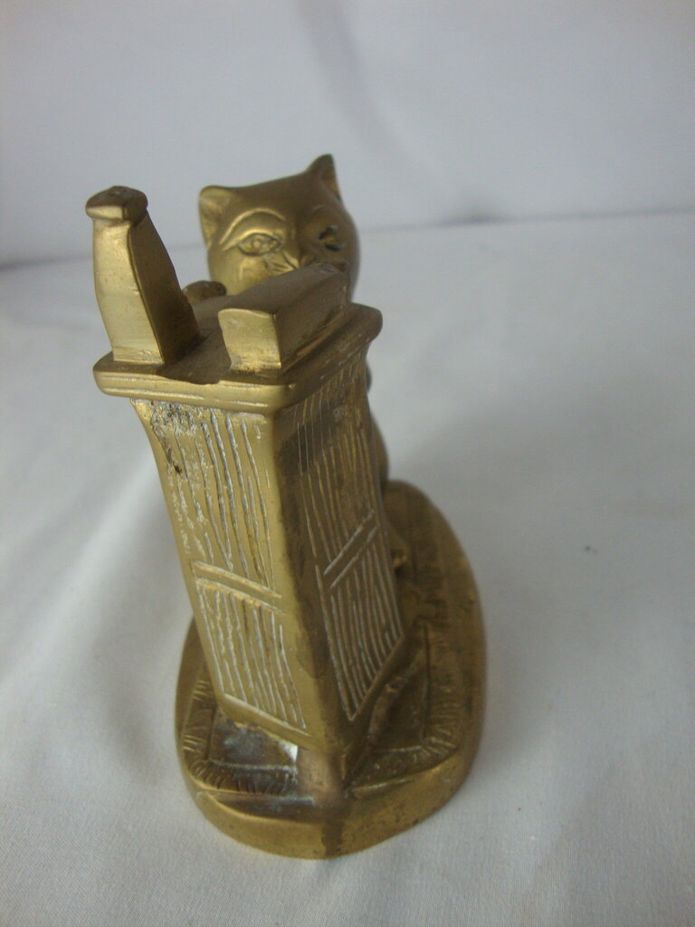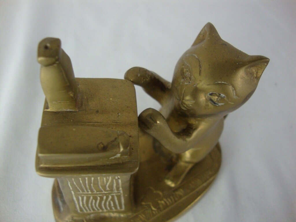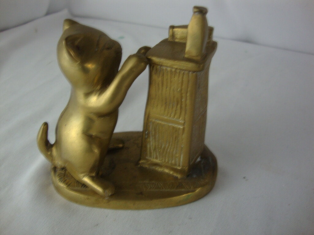 Vintage adorable solid brass figurine of a naughty kitten trying to get the carton of spilled milk up on the counter. Kitten has wear/tear, scratches and measures about 4" height by 4" base width by 2" base depth. If you choose to arrange to have an item shipped please make sure to insure the shipment as we are not responsible for damage that occurs in shipping. All items are sold “As Is” and all sales are final. Most pieces are one of a kind and can not be replaced. We will give you as much information as possible regarding the pieces condition including supplying additional pictures if needed. Due to the nature of antique and vintage items there may be blemishes, nicks or other imperfections as expected with age and use. If you want more information about an item, such as additional images or condition, please inquire! All items are located in our store at Standpipe Antiques, 502 O Neal Street, Belton, SC, 29627. Our hours are Wednesday through Saturday 10am to 5pm, Sundays 12-5pm. Come by and see us!