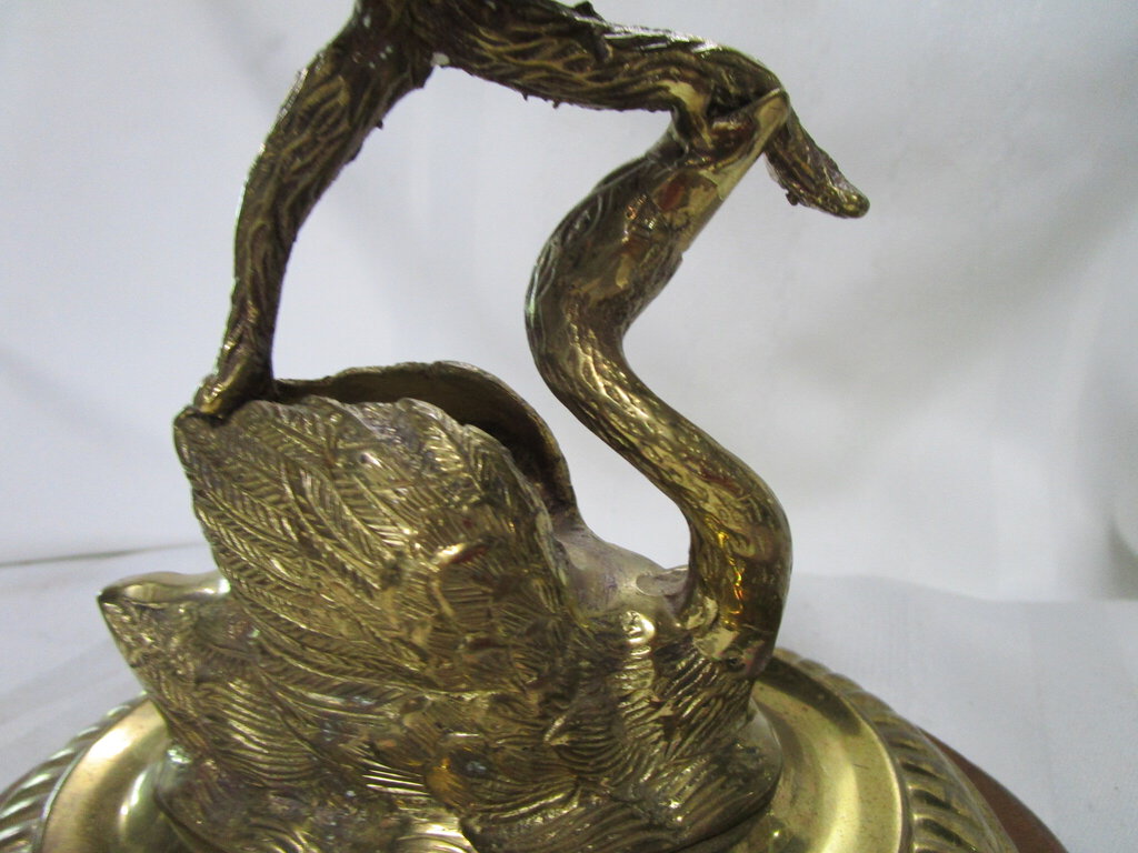 Charming metal and wood Victorian style men's pocket watch holder with oval wood base with round metal base with raised vertical ridges and delightful feathered swan with wings up and mouth holding large branch with textured 'nest' on top that would hold pocket watch. Holder has wear, scratches, finish loss, nest is a bit crooked on branch and measures 2 1/4" nest diameter by 6 1/2" base length and 5" base depth by 6" total height. If you choose to arrange to have an item shipped please make sure to insure the shipment as we are not responsible for damage that occurs in shipping. All items are sold “As Is” and all sales are final. Most pieces are one of a kind and can not be replaced. We will give you as much information as possible regarding the pieces condition including supplying additional pictures if needed. Due to the nature of antique and vintage items there may be blemishes, nicks or other imperfections as expected with age and use. If you want more information about an item, such as additional images or condition, please inquire! All items are located in our store at Standpipe Antiques, 502 O Neal Street, Belton, SC, 29627. Our hours are Wednesday through Friday 10am to 6pm, Saturday 10am to 5pm and Sundays 12-5pm. Come by and see us!