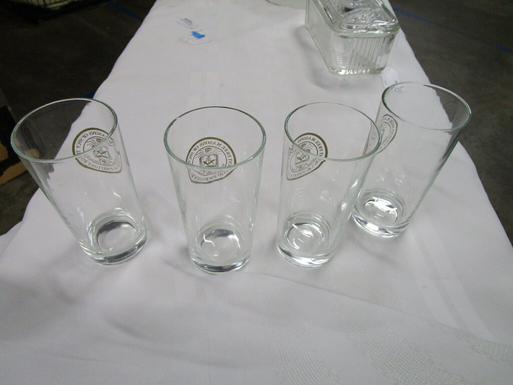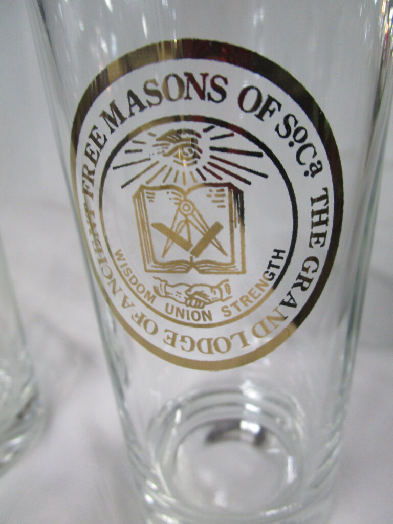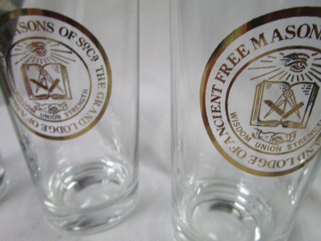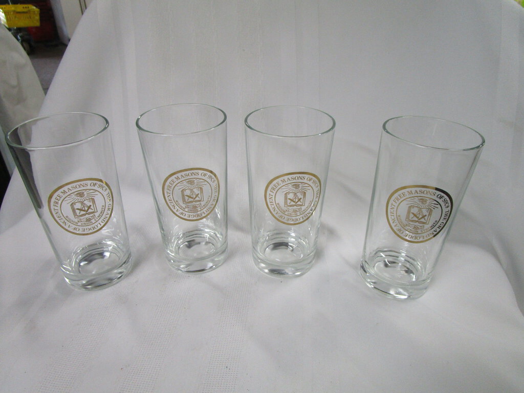 Set of 4 drink glasses in clear glass with gold front circle with Freemasons middle symbols and text The Grand Lodge of Ancient Freemasons of So. Ca. around circle with blank back. Glasses have normal wear, possible scratches and finish loss to gold and measure 5 3/4" height by 2 1/2" top diameter. If you choose to arrange to have an item shipped please make sure to insure the shipment as we are not responsible for damage that occurs in shipping. All items are sold “As Is” and all sales are final. Most pieces are one of a kind and can not be replaced. We will give you as much information as possible regarding the pieces condition including supplying additional pictures if needed. Due to the nature of antique and vintage items there may be blemishes, nicks or other imperfections as expected with age and use. If you want more information about an item, such as additional images or condition, please inquire! All items are located in our store at Standpipe Antiques, 502 O Neal Street, Belton, SC, 29627. Our hours are Wednesday through Friday 10am to 6pm, Saturday 10am to 5pm and Sundays 12-5pm. Come by and see us!