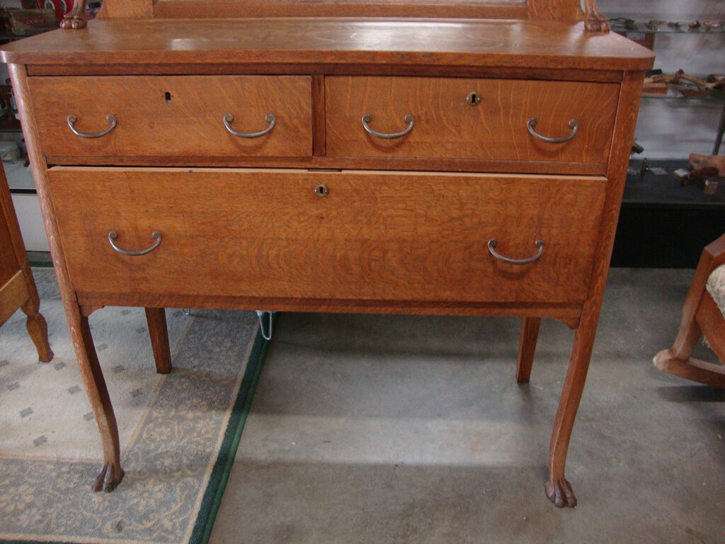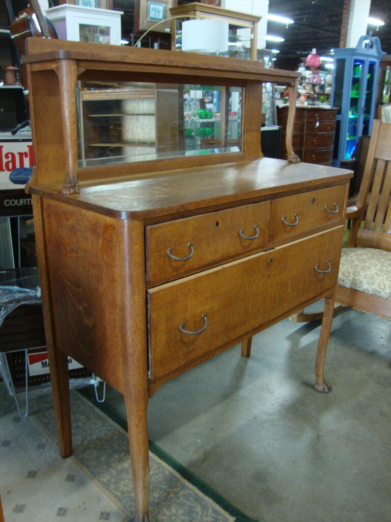 *THIS ITEM IS FOR PICKUP ONLY!* Vintage adorable rare tiger oak buffet server in versatile size with one full lower and two upper drawers with metal hardware, upper rectangle mirror with top shelf and wonderful front three toed legs. Server has wear/tear, finish loss, dings, cracks and measures about 50" back height by 36" counter height by 17" depth by 40" length. If you choose to arrange to have an item shipped please make sure to insure the shipment as we are not responsible for damage that occurs in shipping. All items are sold “As Is” and all sales are final. Most pieces are one of a kind and can not be replaced. We will give you as much information as possible regarding the pieces condition including supplying additional pictures if needed. Due to the nature of antique and vintage items there may be blemishes, nicks or other imperfections as expected with age and use. If you want more information about an item, such as additional images or condition, please inquire! All items are located in our store at Standpipe Antiques, 502 O Neal Street, Belton, SC, 29627. Our hours are Wednesday through Saturday 10am to 5pm and Sundays 12-5pm. Come by and see us!