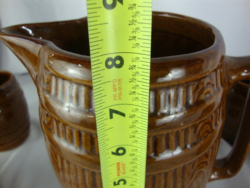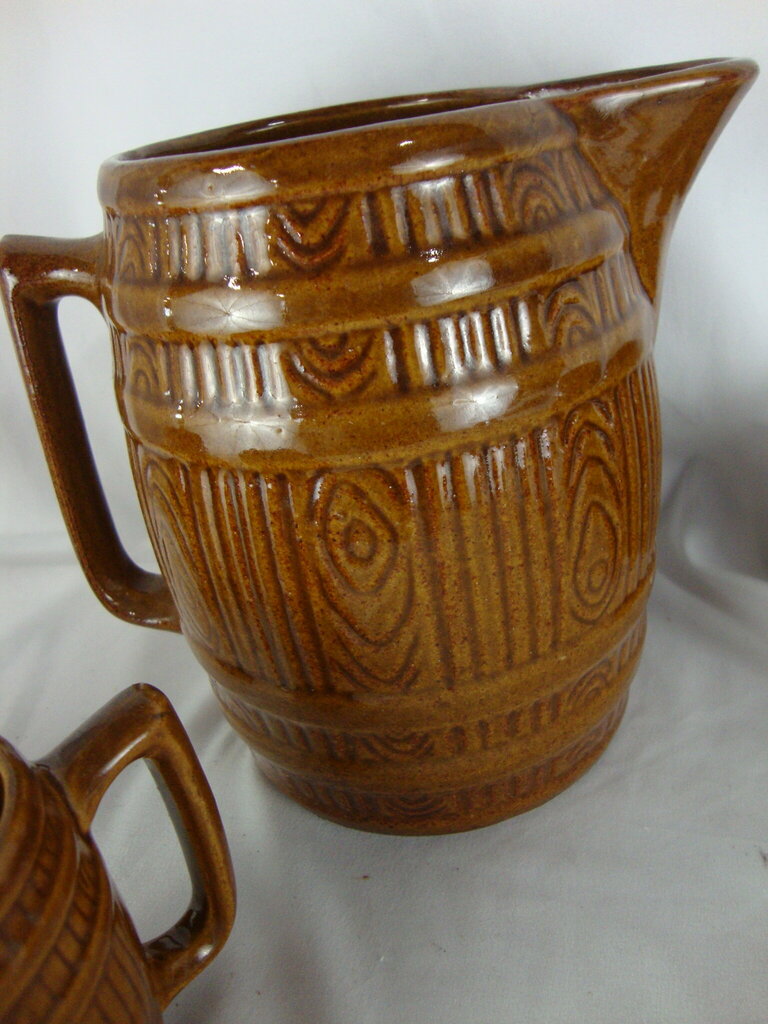 Vintage unmarked McCoy brown barrel beverage set with fun sturdy pitcher with large spout and four short handled mugs. Set has wear/tear, flaws and pitcher is about 7 1/2" height by 5 1/4" bottom diameter and mugs are 4" height by 3" top diameter. If you choose to arrange to have an item shipped please make sure to insure the shipment as we are not responsible for damage that occurs in shipping. All items are sold “As Is” and all sales are final. Most pieces are one of a kind and can not be replaced. We will give you as much information as possible regarding the pieces condition including supplying additional pictures if needed. Due to the nature of antique and vintage items there may be blemishes, nicks or other imperfections as expected with age and use. If you want more information about an item, such as additional images or condition, please inquire! All items are located in our store at Standpipe Antiques, 502 O Neal Street, Belton, SC, 29627. Our hours are Wednesday through Saturday 10am to 5pm, Sundays 12-5pm. Come by and see us!