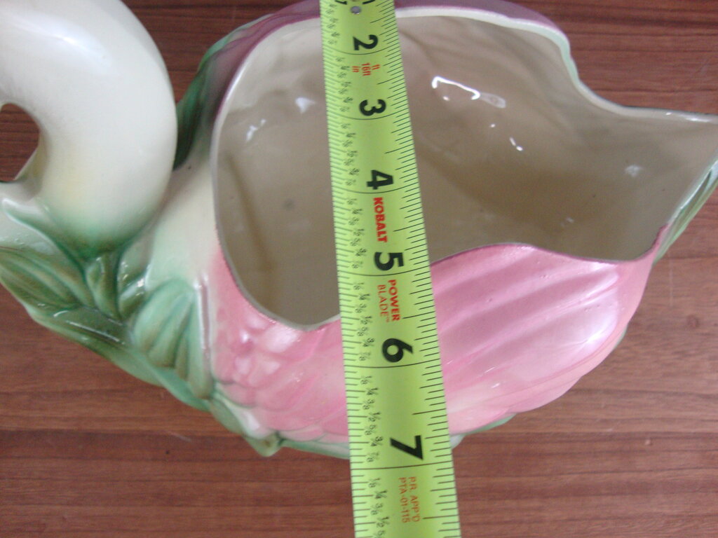 Fun and vibrant mid century swan planter with cream/pink/green body with open planter back and graceful downward head with yellow beak and black eyes. Planter has wear/tear, defects, crazing and measures 8" head and 4" back height by 11" length and 3" planter width. If you choose to arrange to have an item shipped please make sure to insure the shipment as we are not responsible for damage that occurs in shipping. All items are sold “As Is” and all sales are final. Most pieces are one of a kind and can not be replaced. We will give you as much information as possible regarding the pieces condition including supplying additional pictures if needed. Due to the nature of antique and vintage items there may be blemishes, nicks or other imperfections as expected with age and use. If you want more information about an item, such as additional images or condition, please inquire! All items are located in our store at Standpipe Antiques, 502 O Neal Street, Belton, SC, 29627. Our hours are Wednesday through Saturday 10am to 5pm and Sundays 12-5pm. Come by and see us!