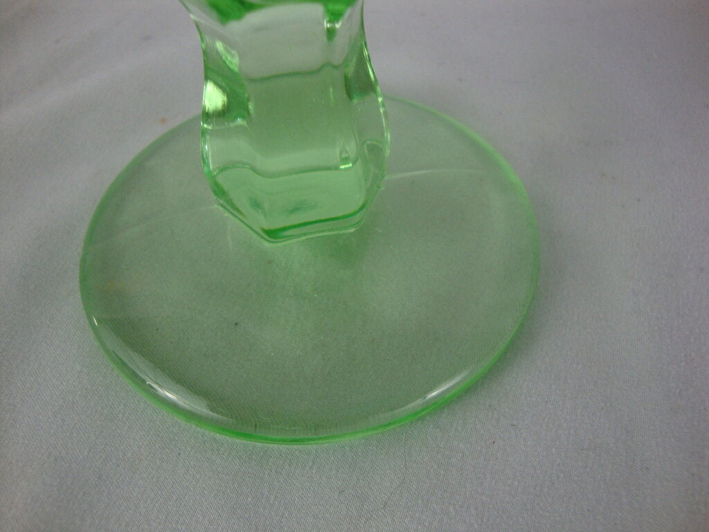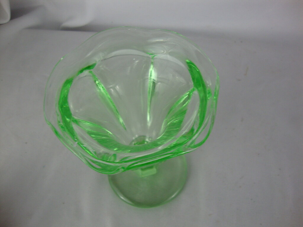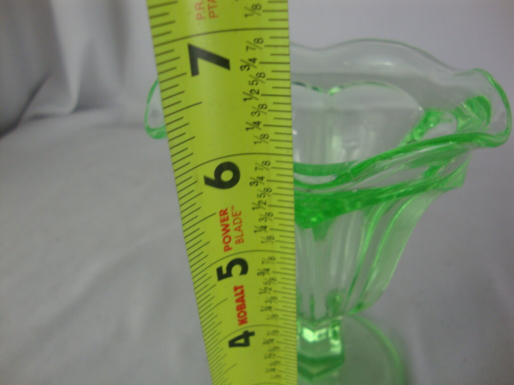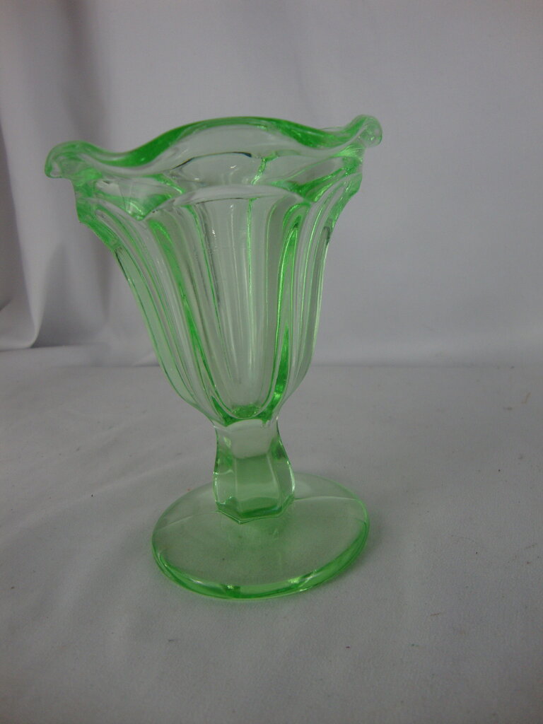 Vintage adorable uranium vaseline glass footed ice cream sundae cup glass with round base and flared cup with wavy edge top. Cup glass has wear/tear and measures about 5 1/2" height by 4" top and 3" bottom diameters. If you choose to arrange to have an item shipped please make sure to insure the shipment as we are not responsible for damage that occurs in shipping. All items are sold “As Is” and all sales are final. Most pieces are one of a kind and can not be replaced. We will give you as much information as possible regarding the pieces condition including supplying additional pictures if needed. Due to the nature of antique and vintage items there may be blemishes, nicks or other imperfections as expected with age and use. If you want more information about an item, such as additional images or condition, please inquire! All items are located in our store at Standpipe Antiques, 502 O Neal Street, Belton, SC, 29627. Our hours are Wednesday through Saturday 10am to 5pm, and Sundays 12-5pm. Come by and see us!