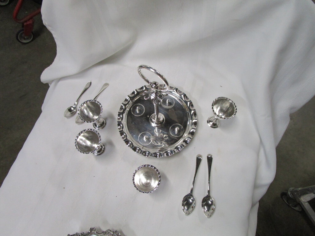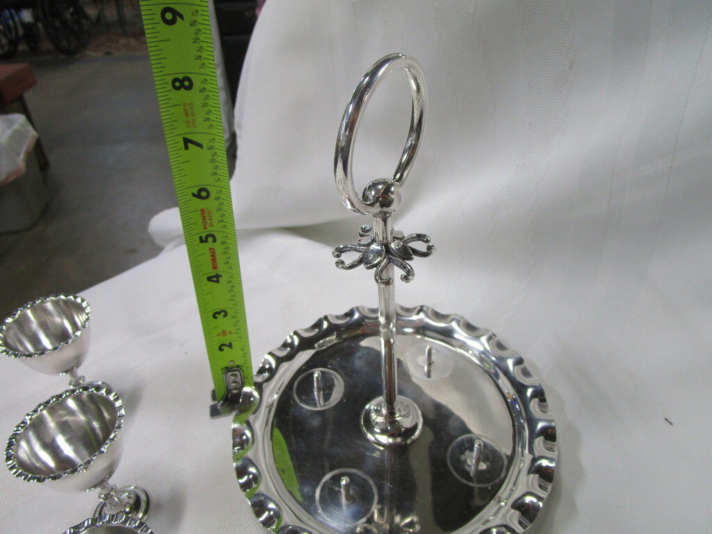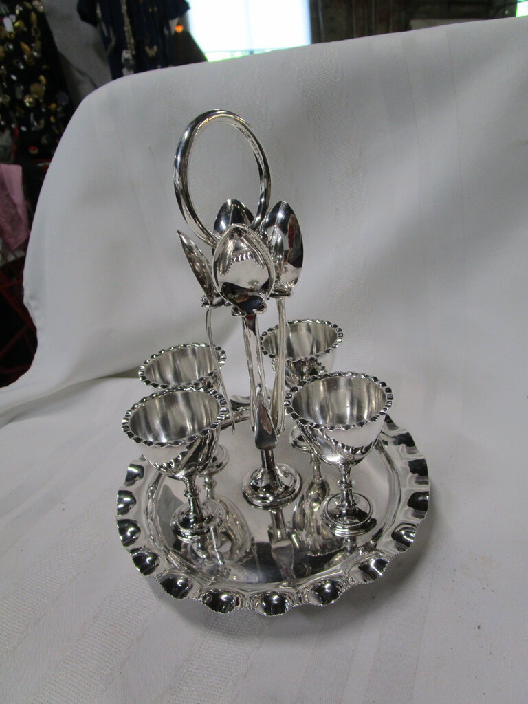Charming vintage silver tone metal egg cruet serving set with round carry tray with top loop handle, middle small spoons hanging and ruffled bottom edges and tray has 4 pins that egg cups sit on. Set has 1 mismatched spoon (see photo), wear/tear, scratches, tarnish, stains and tray is about 8" height by 6 3/4" base diameter, egg cups are 2 3/4" height by 1 3/4" top diameter and 4 1/2" length for 3 matching spoons and 4" for mismatched spoon. If you choose to arrange to have an item shipped please make sure to insure the shipment as we are not responsible for damage that occurs in shipping. All items are sold “As Is” and all sales are final. Most pieces are one of a kind and can not be replaced. We will give you as much information as possible regarding the pieces condition including supplying additional pictures if needed. Due to the nature of antique and vintage items there may be blemishes, nicks or other imperfections as expected with age and use. If you want more information about an item, such as additional images or condition, please inquire! All items are located in our store at Standpipe Antiques, 502 O Neal Street, Belton, SC, 29627. Our hours are Wednesday through Friday 10am to 6pm, Saturday 10am to 5pm and Sundays 12-5pm. Come by and see us!