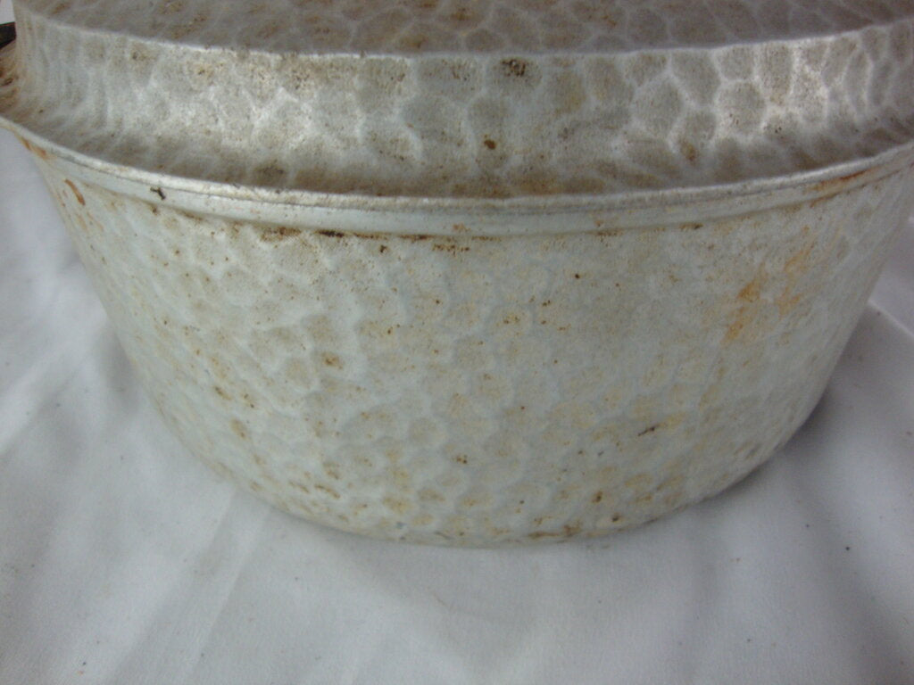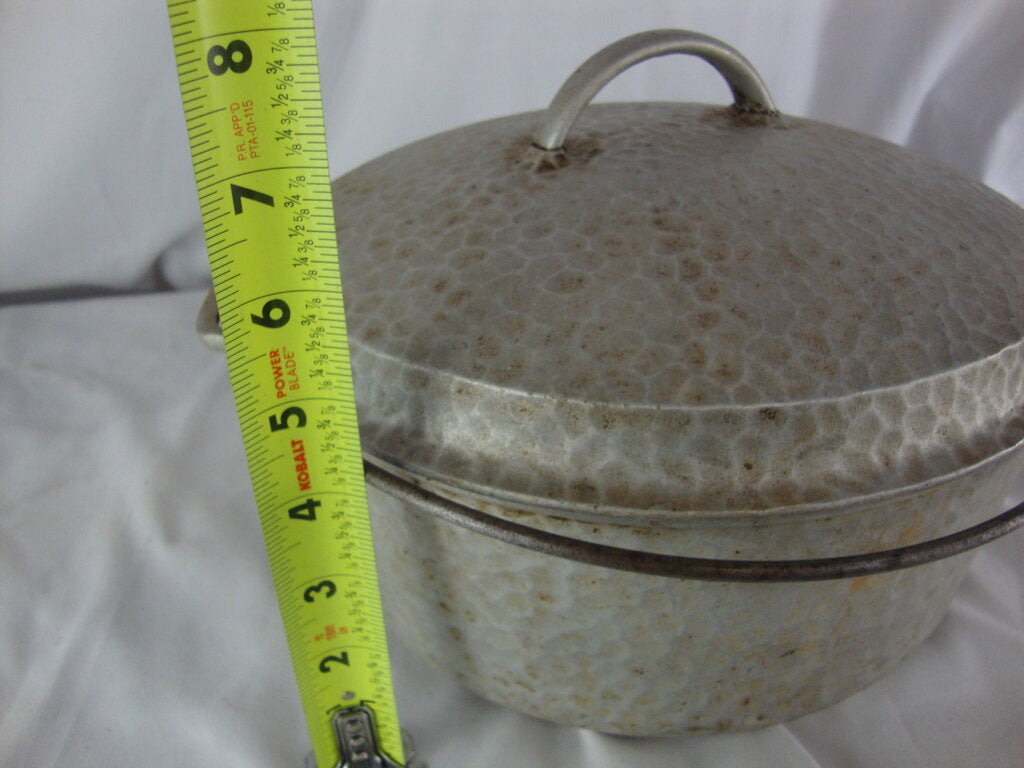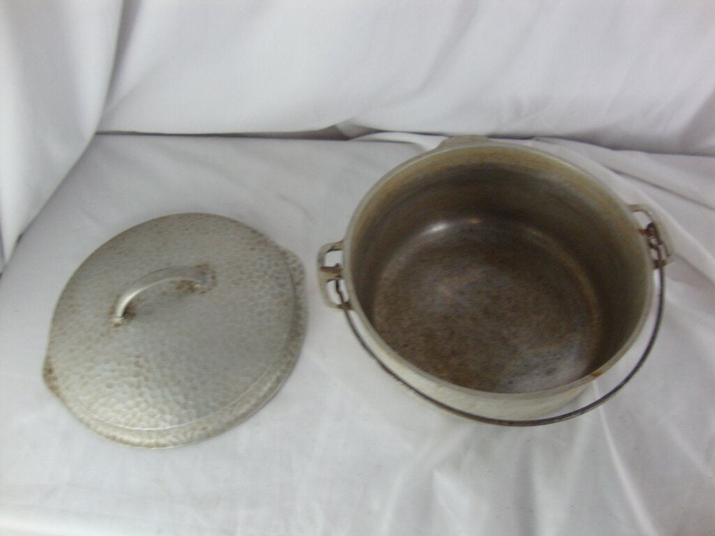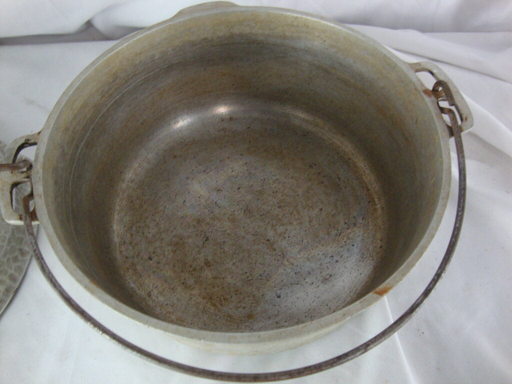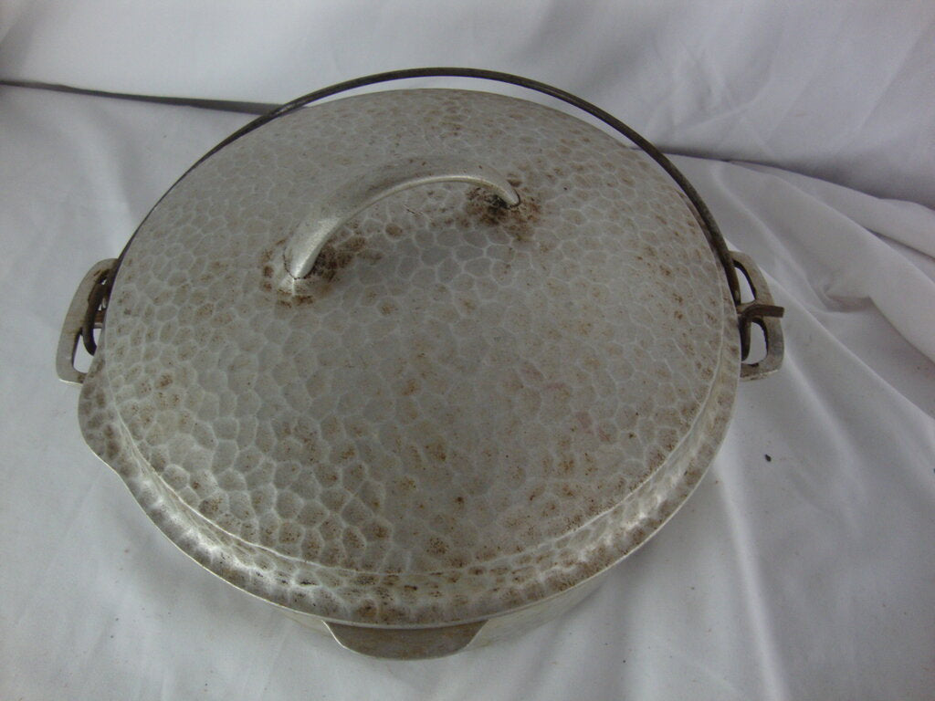 Vintage Wagner Ware Sidney O hammered aluminum dutch oven with middle swing wire handle and hammered exterior with dome lid. Set has wear/tear, finish loss, scratches, stains and measures about 4" base and 7" lid height by 10" top diameter. If you choose to arrange to have an item shipped please make sure to insure the shipment as we are not responsible for damage that occurs in shipping. All items are sold “As Is” and all sales are final. Most pieces are one of a kind and can not be replaced. We will give you as much information as possible regarding the pieces condition including supplying additional pictures if needed. Due to the nature of antique and vintage items there may be blemishes, nicks or other imperfections as expected with age and use. If you want more information about an item, such as additional images or condition, please inquire! All items are located in our store at Standpipe Antiques, 502 O Neal Street, Belton, SC, 29627. Our hours are Wednesday through Friday 10am to 6pm, Saturday 10am to 5pm and Sundays 12-5pm. Come by and see us!