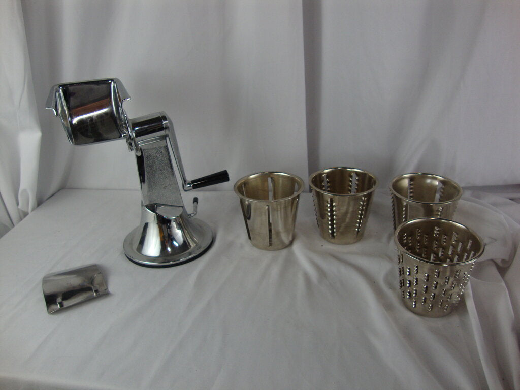 Vintage versatile West Bend Kitchen Kutter countertop cutter with black suction base and four cone cutters with guard. Kutter has minimal wear/tear, some rust/tarnish and cutter is about 10" height by 5" base diameter by 8" handle width and cones are about 3 1/2" height by 4" top diameters. If you choose to arrange to have an item shipped please make sure to insure the shipment as we are not responsible for damage that occurs in shipping. All items are sold “As Is” and all sales are final. Most pieces are one of a kind and can not be replaced. We will give you as much information as possible regarding the pieces condition including supplying additional pictures if needed. Due to the nature of antique and vintage items there may be blemishes, nicks or other imperfections as expected with age and use. If you want more information about an item, such as additional images or condition, please inquire! All items are located in our store at Standpipe Antiques, 502 O Neal Street, Belton, SC, 29627. Our hours are Wednesday through Friday 10am to 6pm, Saturday 10am to 5pm and Sundays 12-5pm. Come by and see us!